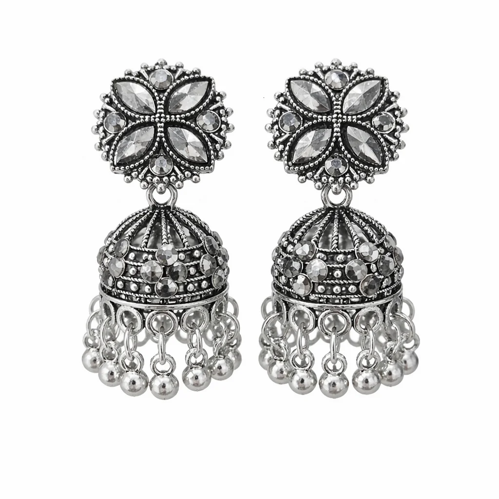a beautifully detailed floral stud design adorned with sparkling stone accents. The intricately crafted dome-shaped drop features textured patterns and embedded stones, giving it a rich and antique appeal. Delicate silver bead dangler