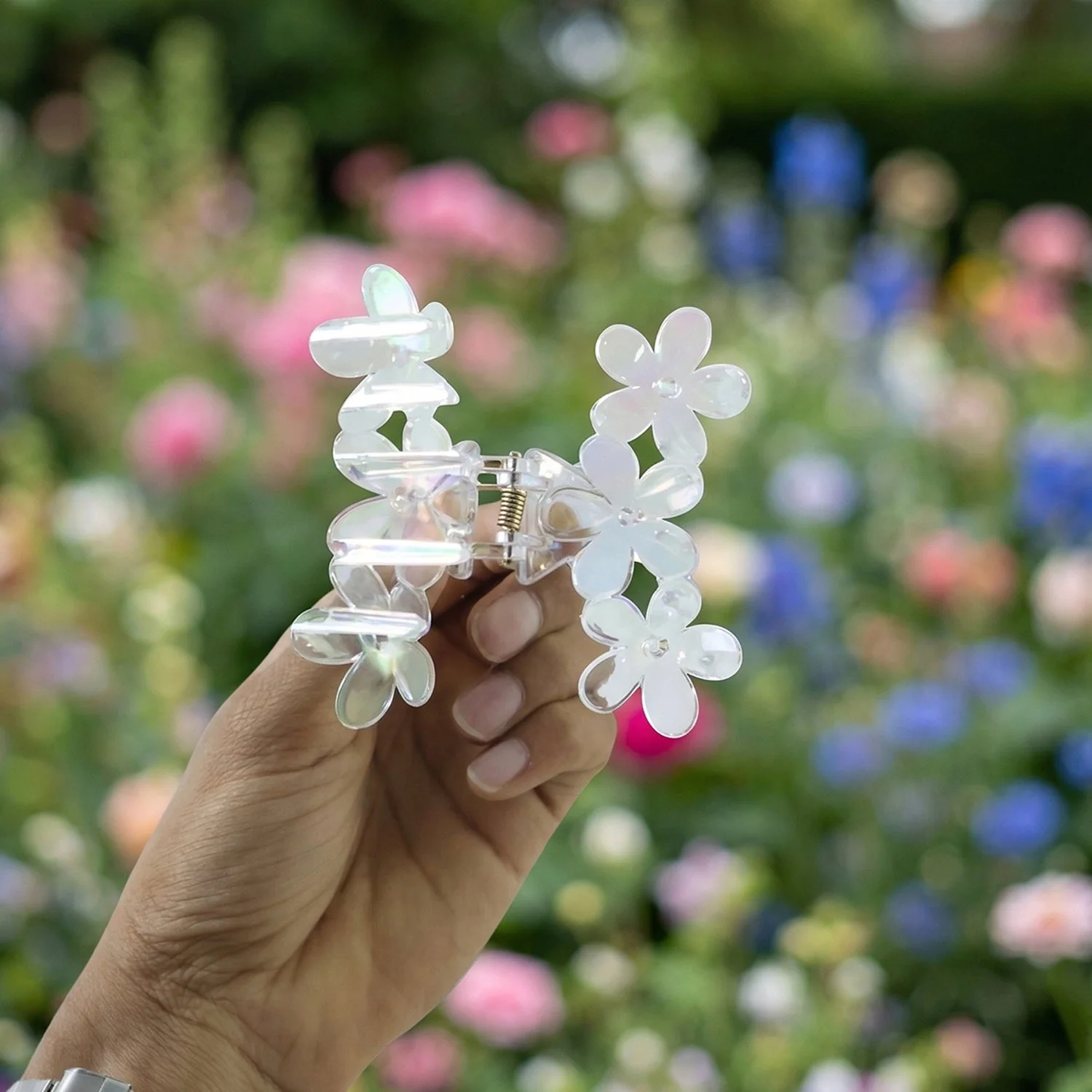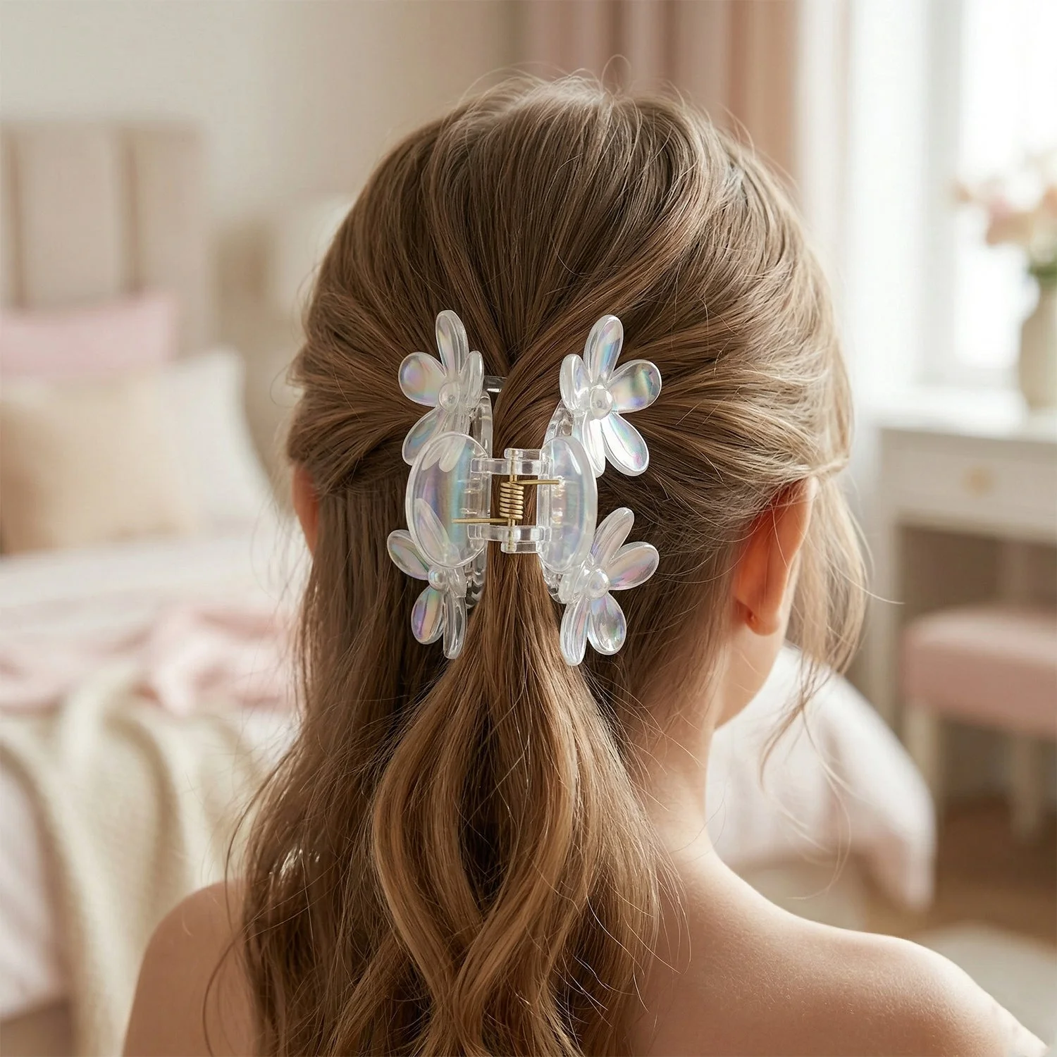 Add a touch of elegance to your hairstyle with this beautifully designed transparent floral hair claw clip. Featuring a delicate butterfly and flower-inspired design, this clip enhances your look while providing a secure and comfortable hold. Its lightweight yet sturdy construction ensures effortless styling without pulling or damaging hair. Perfect for both casual and special occasions, this accessory complements a wide range of outfits. A must-have addition to your hair accessory collection for creating stylish and graceful hairstyles.