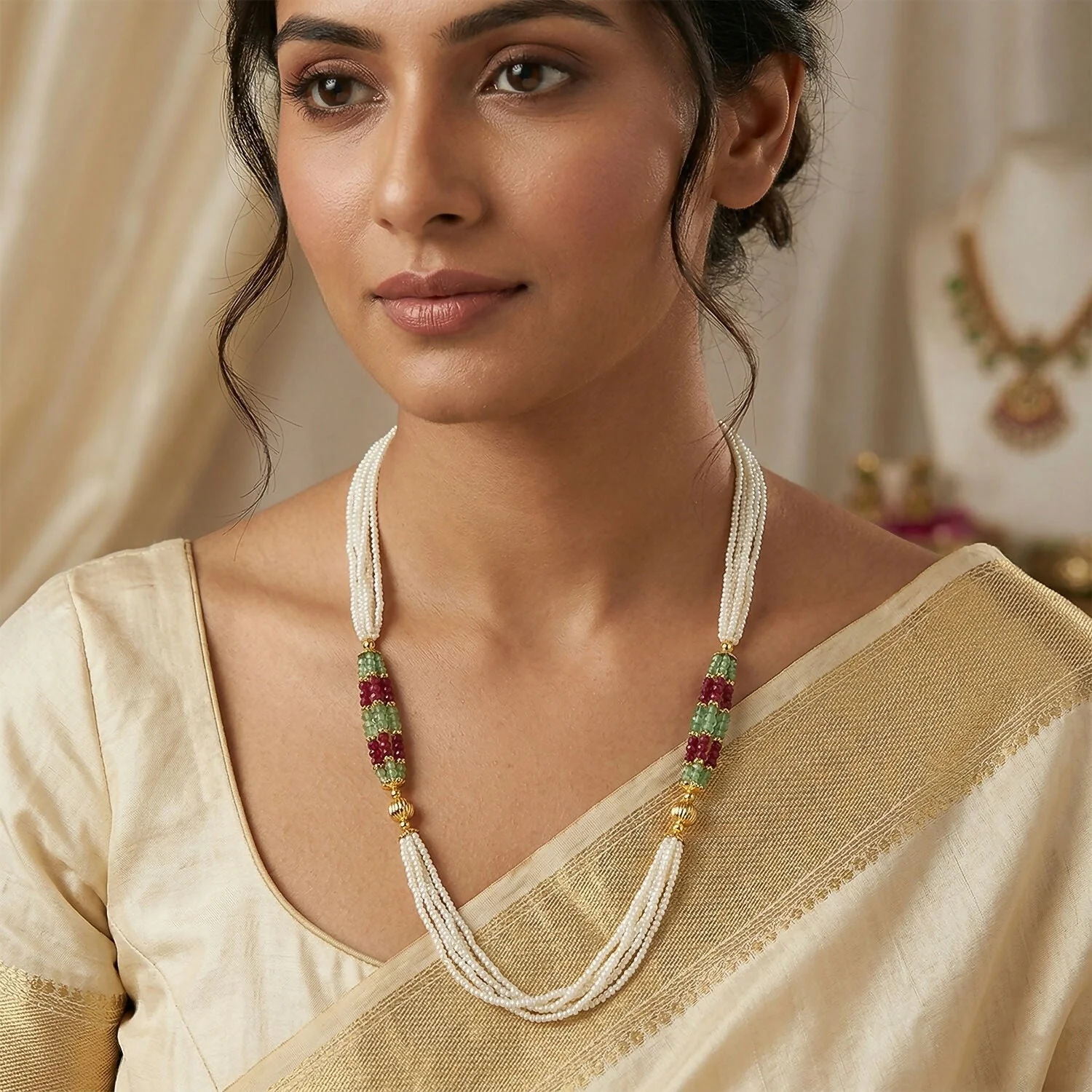 Be the first to review Elegant White Beaded Mala with Red & Green Traditional Design for Women!