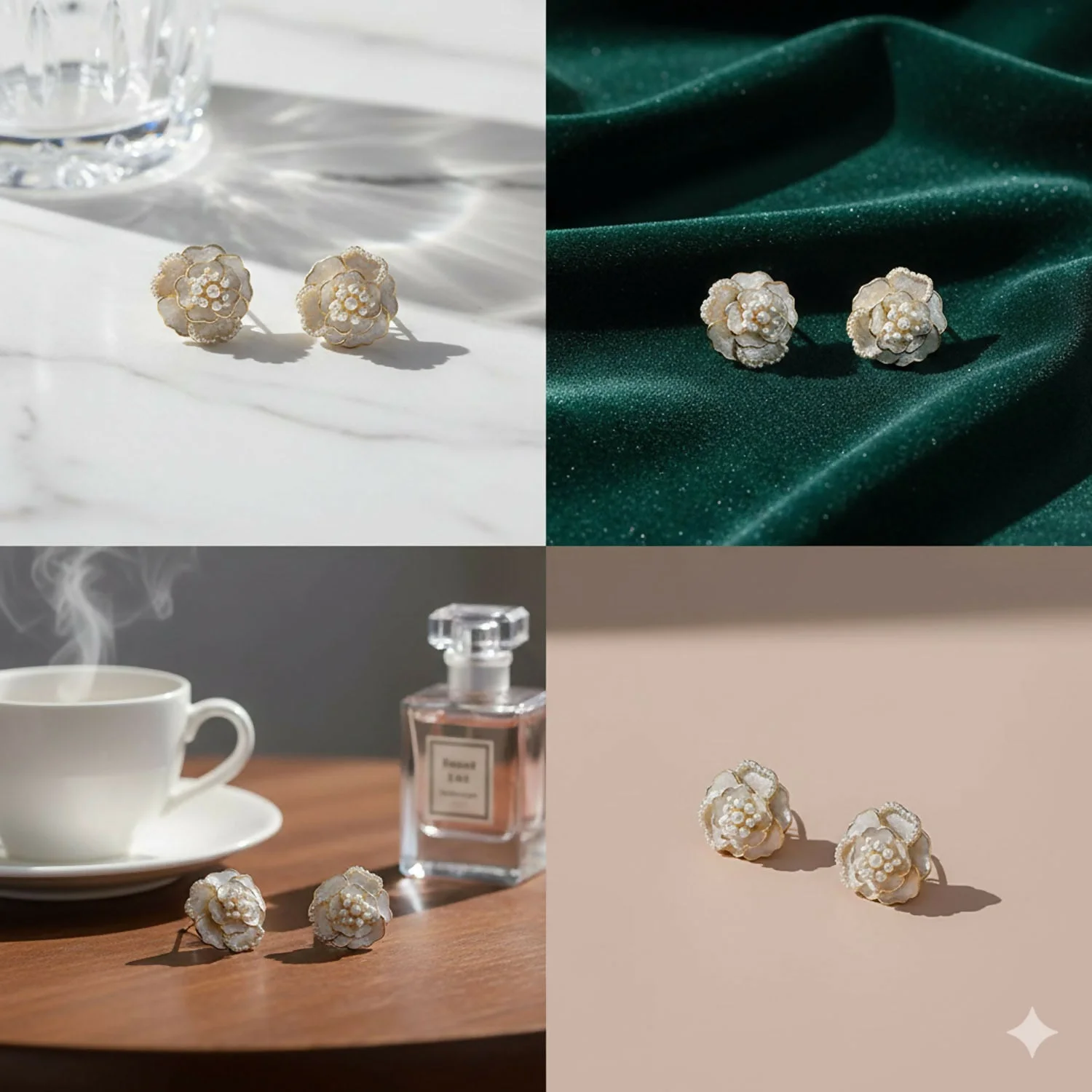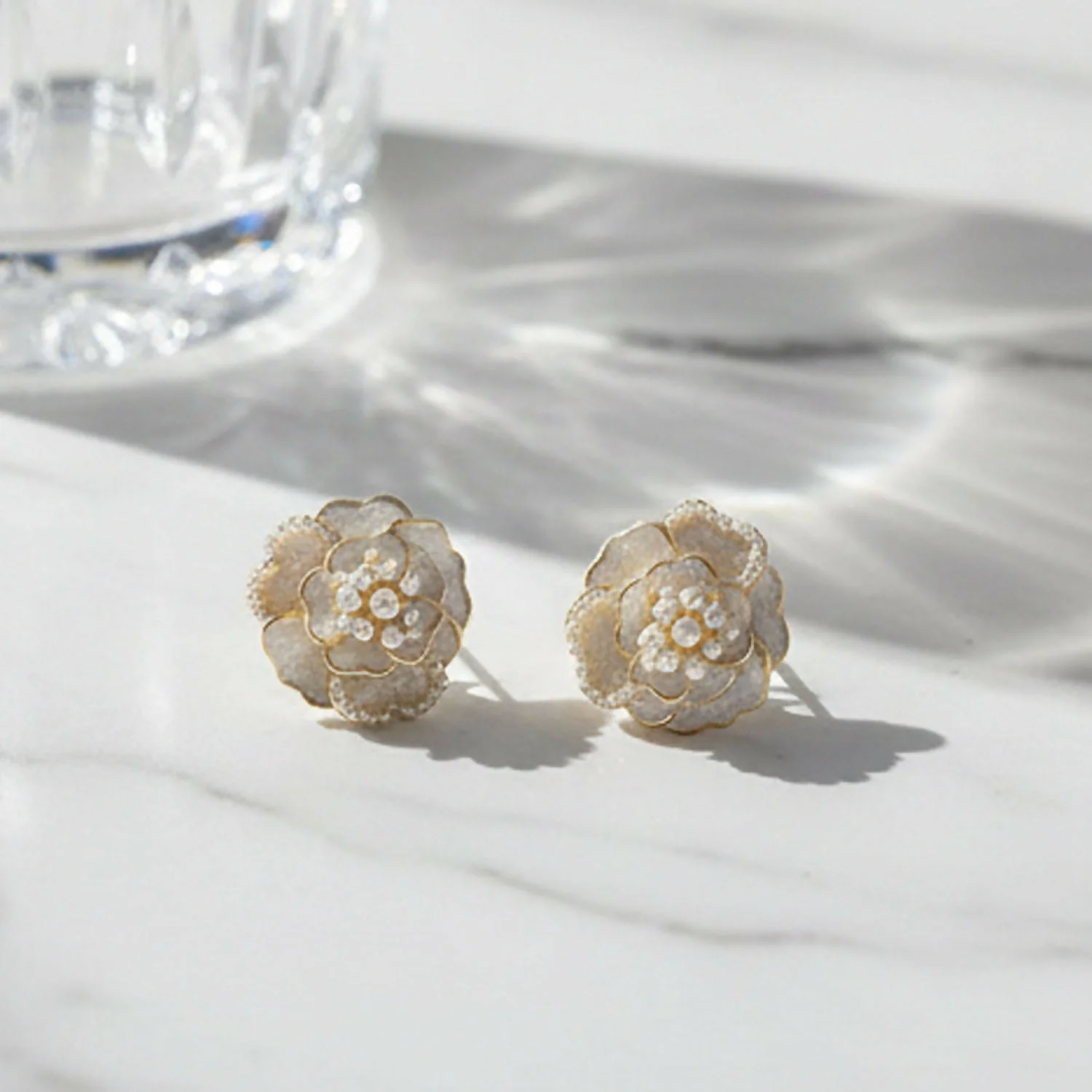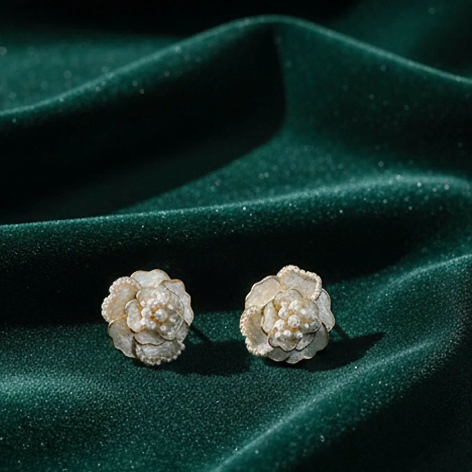 These Camellia Flower Stud Earrings are a tribute to classic beauty and modern craftsmanship. Featuring delicate layers and shimmering pearl accents, they are designed to add a sophisticated glow to your face.