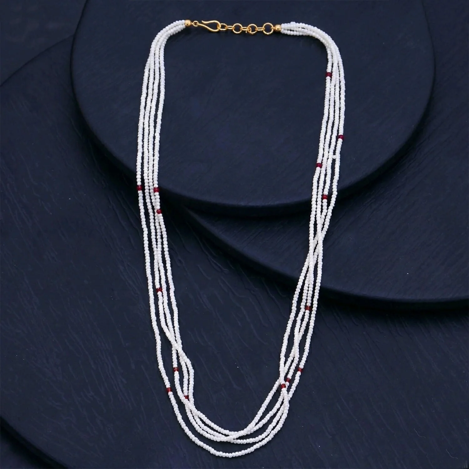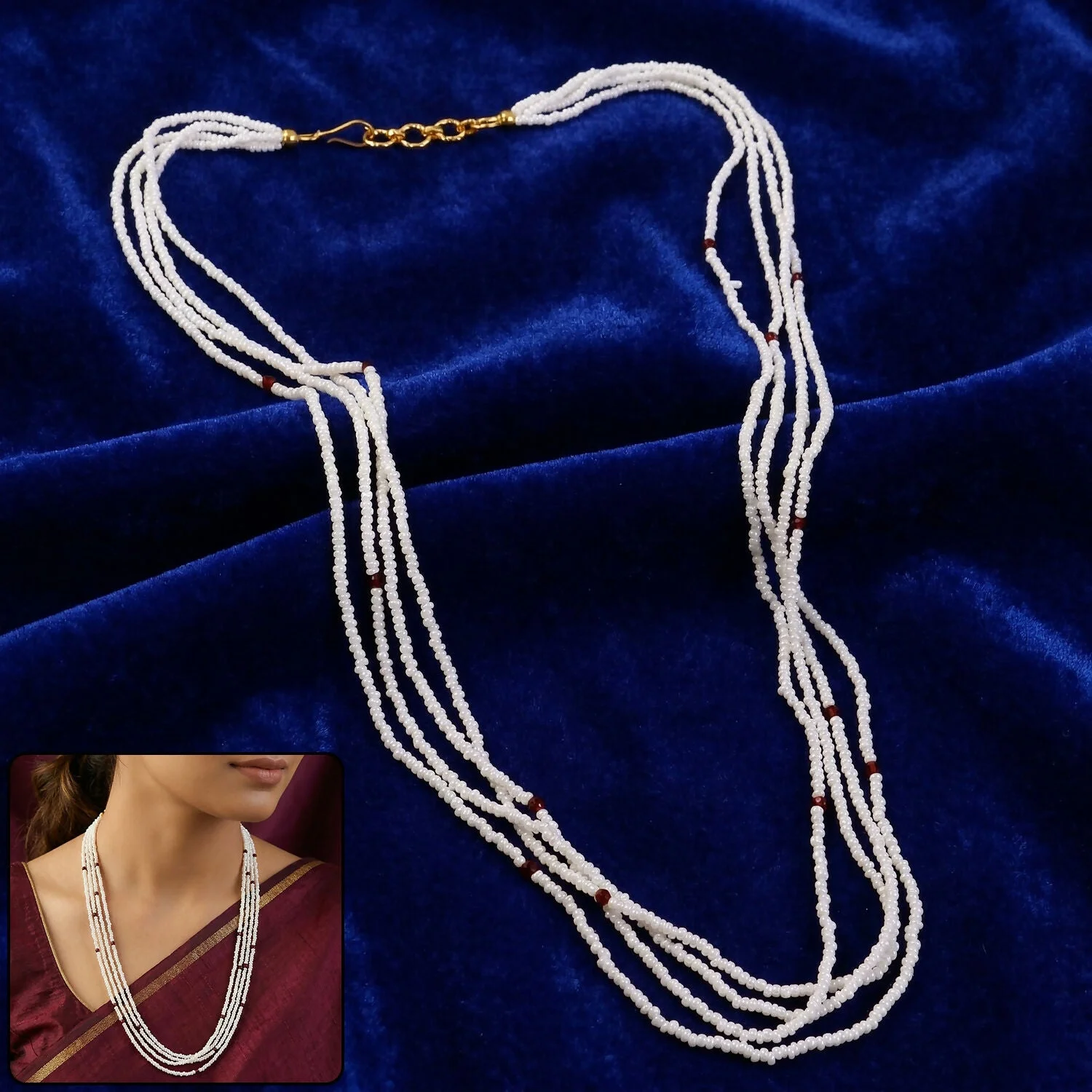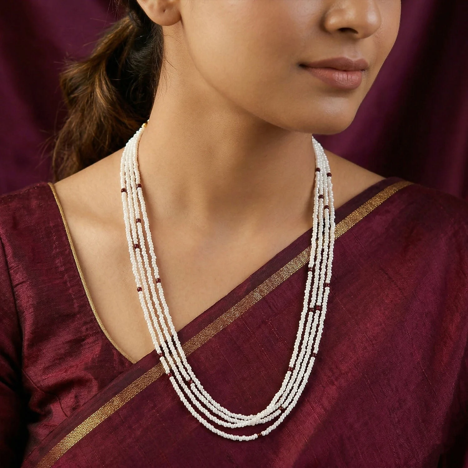 Add a touch of understated elegance to your look with this multi-layer beaded mala necklace designed in a timeless white pattern with delicate maroon accents. The finely arranged strands create a soft layered drape that enhances the neckline with grace and simplicity. Its minimal yet refined design makes it suitable for both everyday ethnic styling and special occasions. This piece is carefully handmade with attention to detail, giving it a clean and graceful finish. Perfectly pairs with sarees and traditional outfits for a polished and sophisticated appearance.