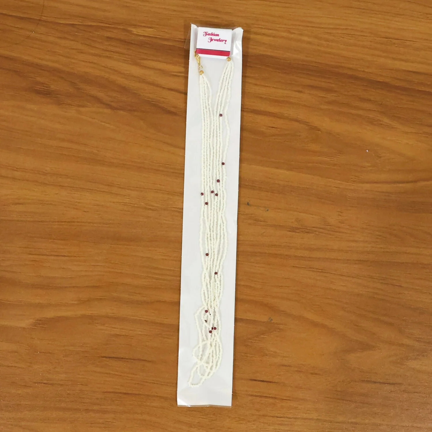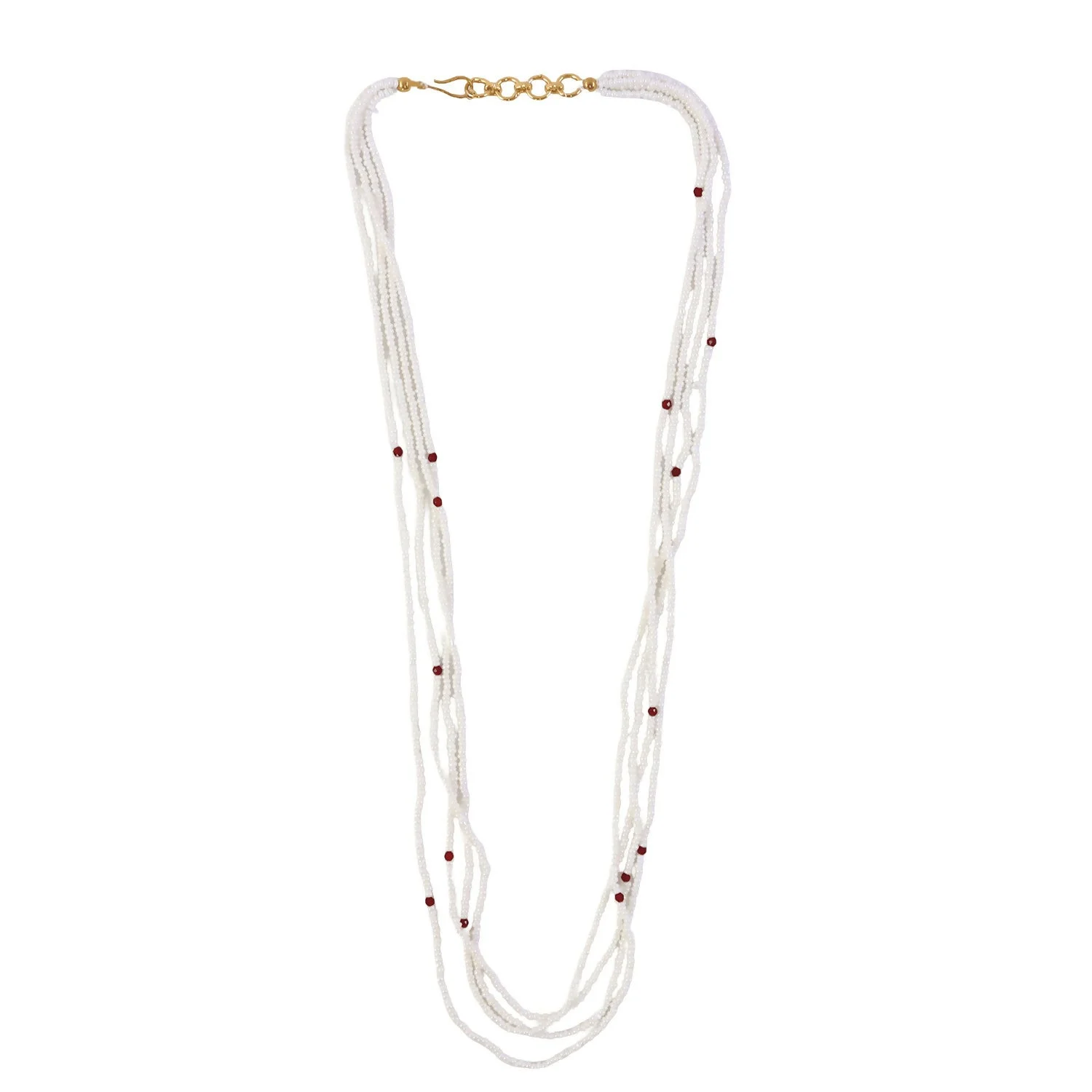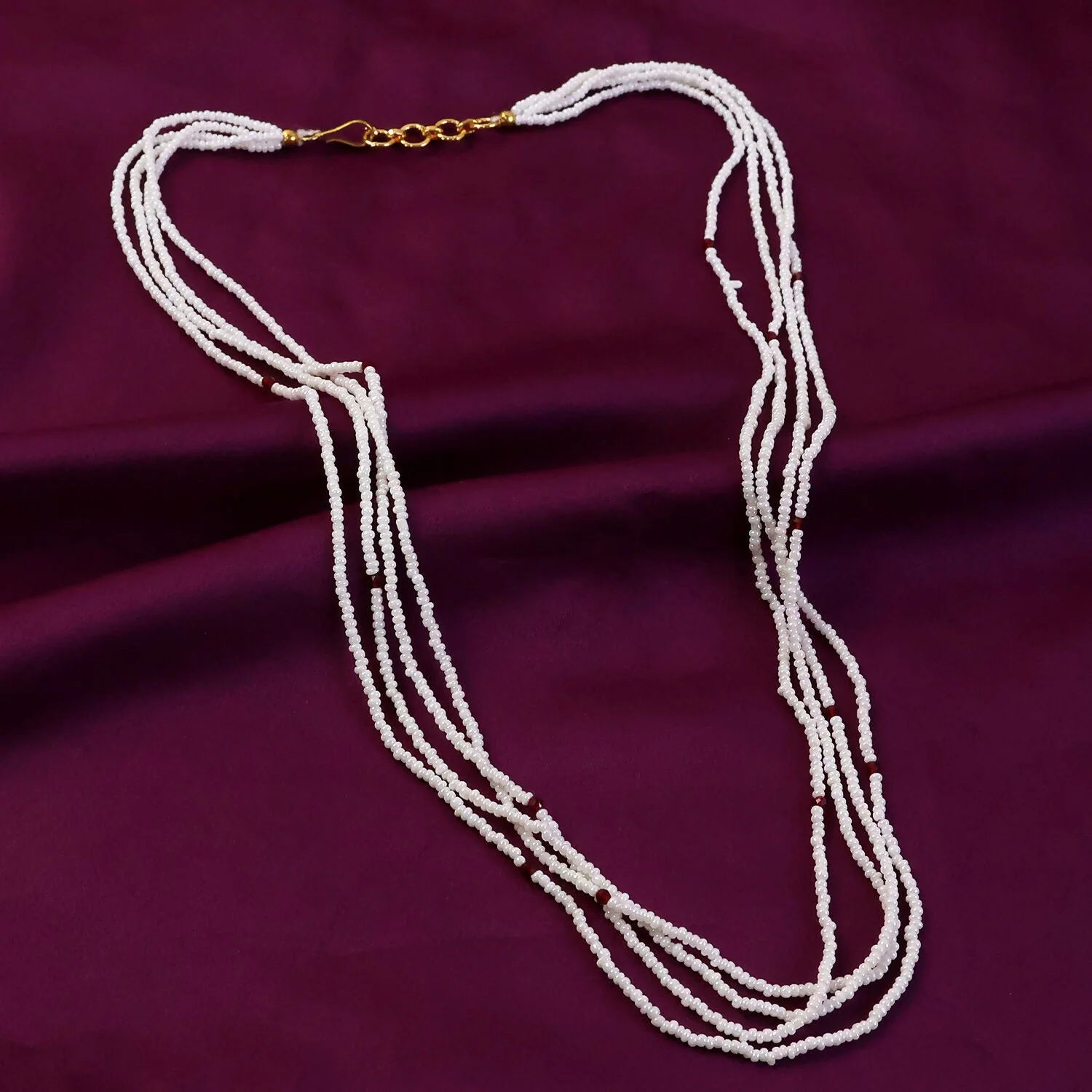 Add a touch of understated elegance to your look with this multi-layer beaded mala necklace designed in a timeless white pattern with delicate maroon accents. The finely arranged strands create a soft layered drape that enhances the neckline with grace and simplicity. Its minimal yet refined design makes it suitable for both everyday ethnic styling and special occasions. This piece is carefully handmade with attention to detail, giving it a clean and graceful finish. Perfectly pairs with sarees and traditional outfits for a polished and sophisticated appearance.