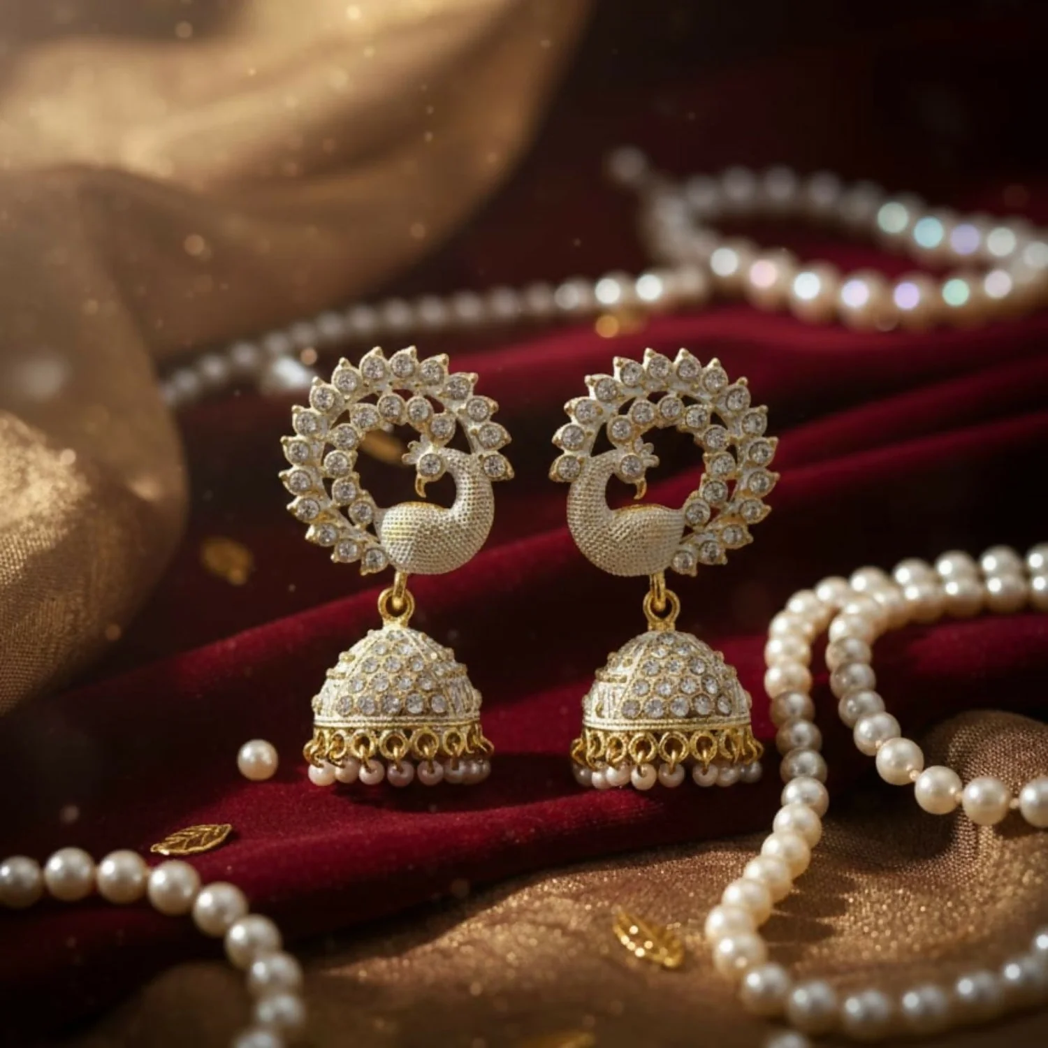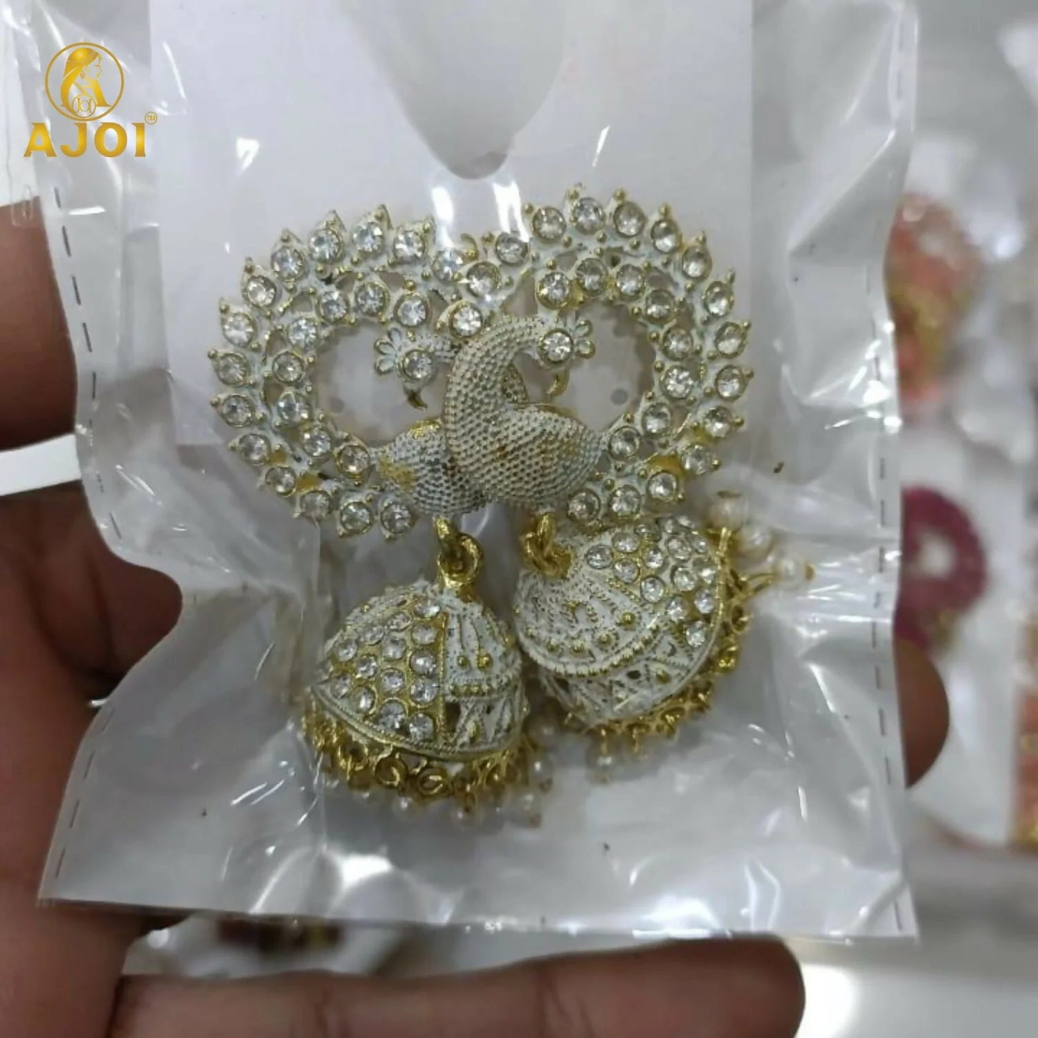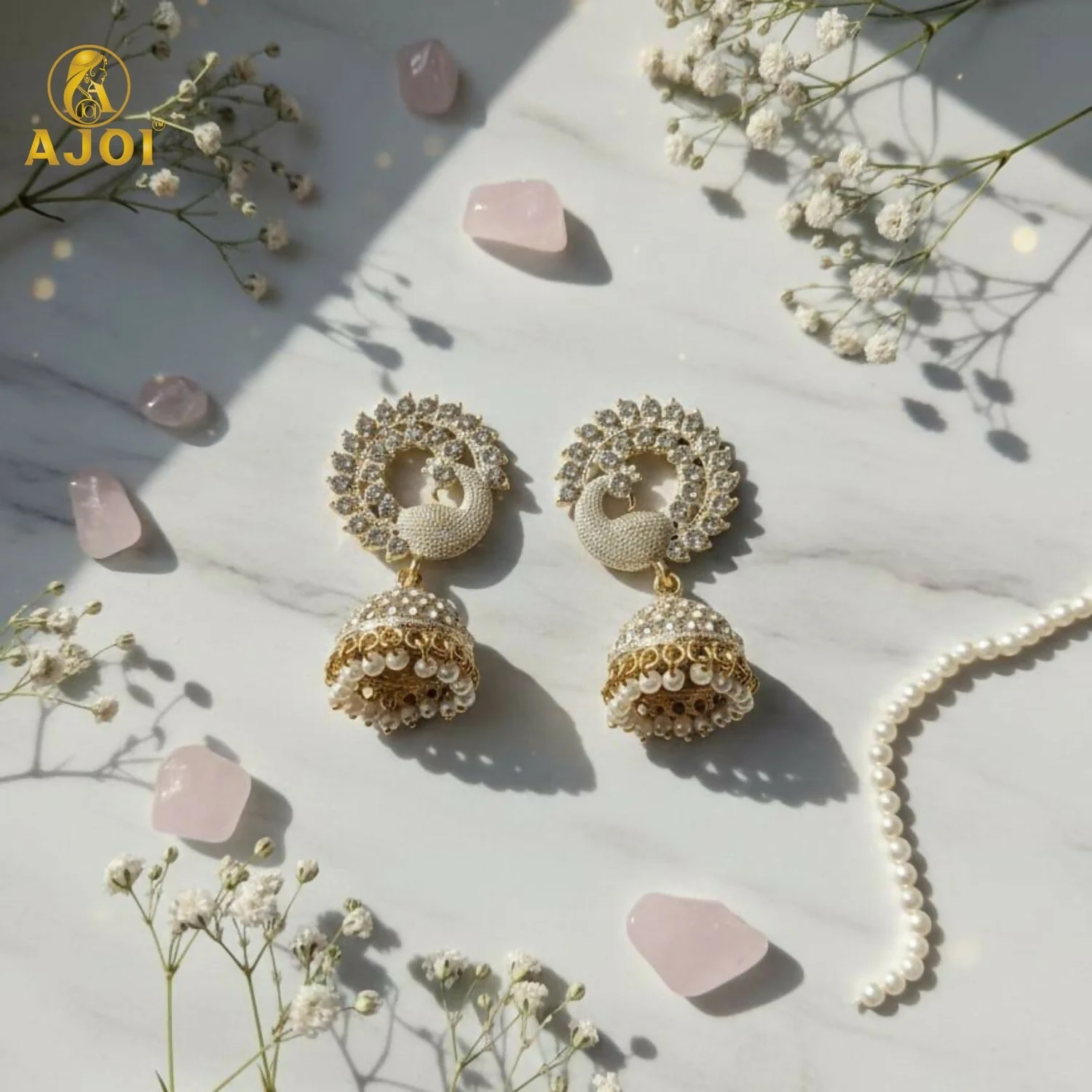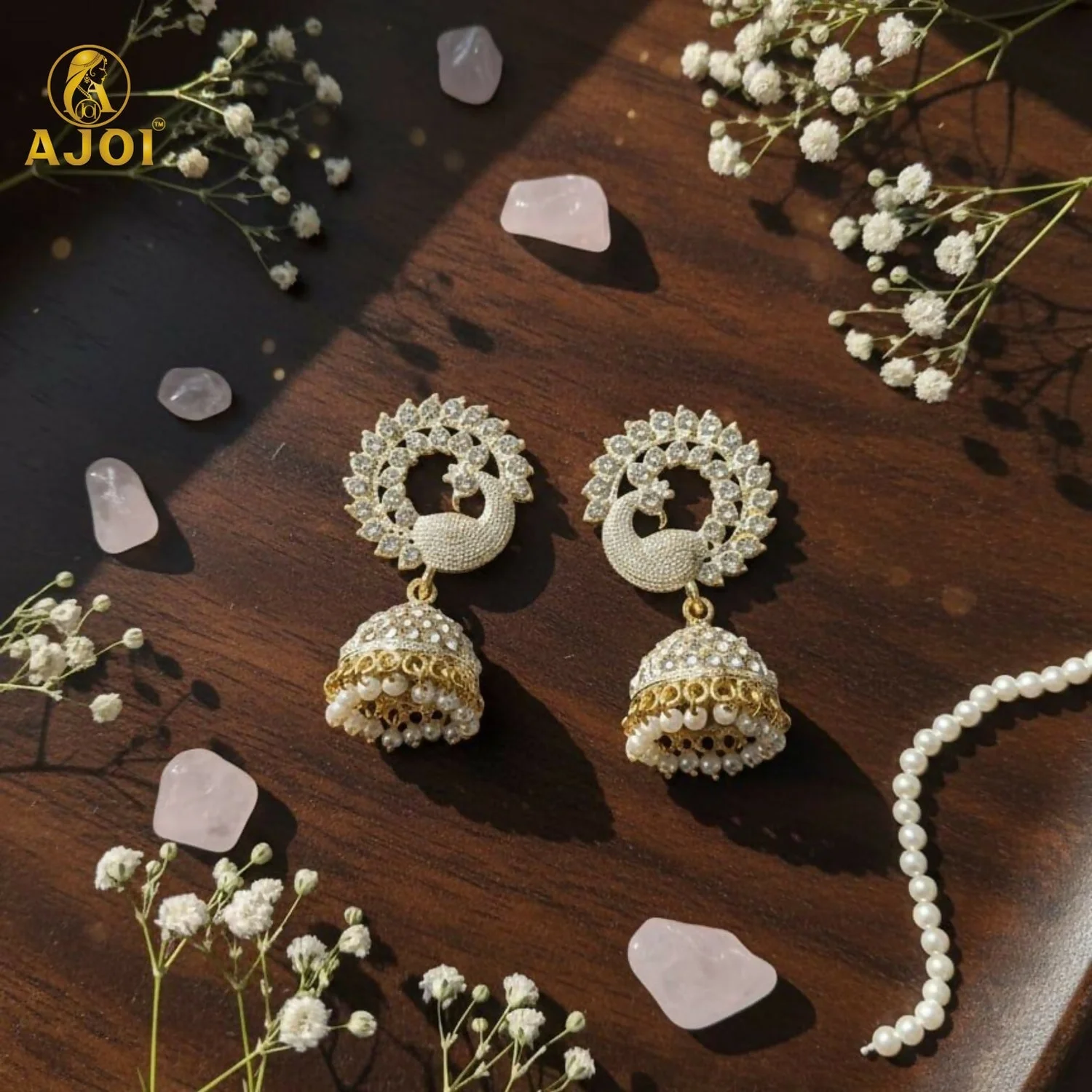 Elevate your ethnic and festive style with these luxurious White Stone Pearl Jhumka Earrings, crafted for elegance and timeless charm. The top stud features a stunning circular motif adorned with shimmering white stones arranged in a graceful layered pattern, offering a refined and radiant look.