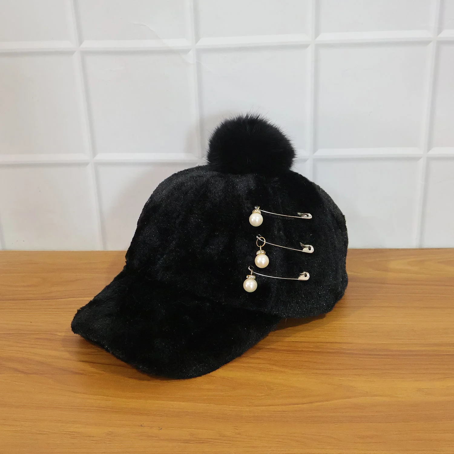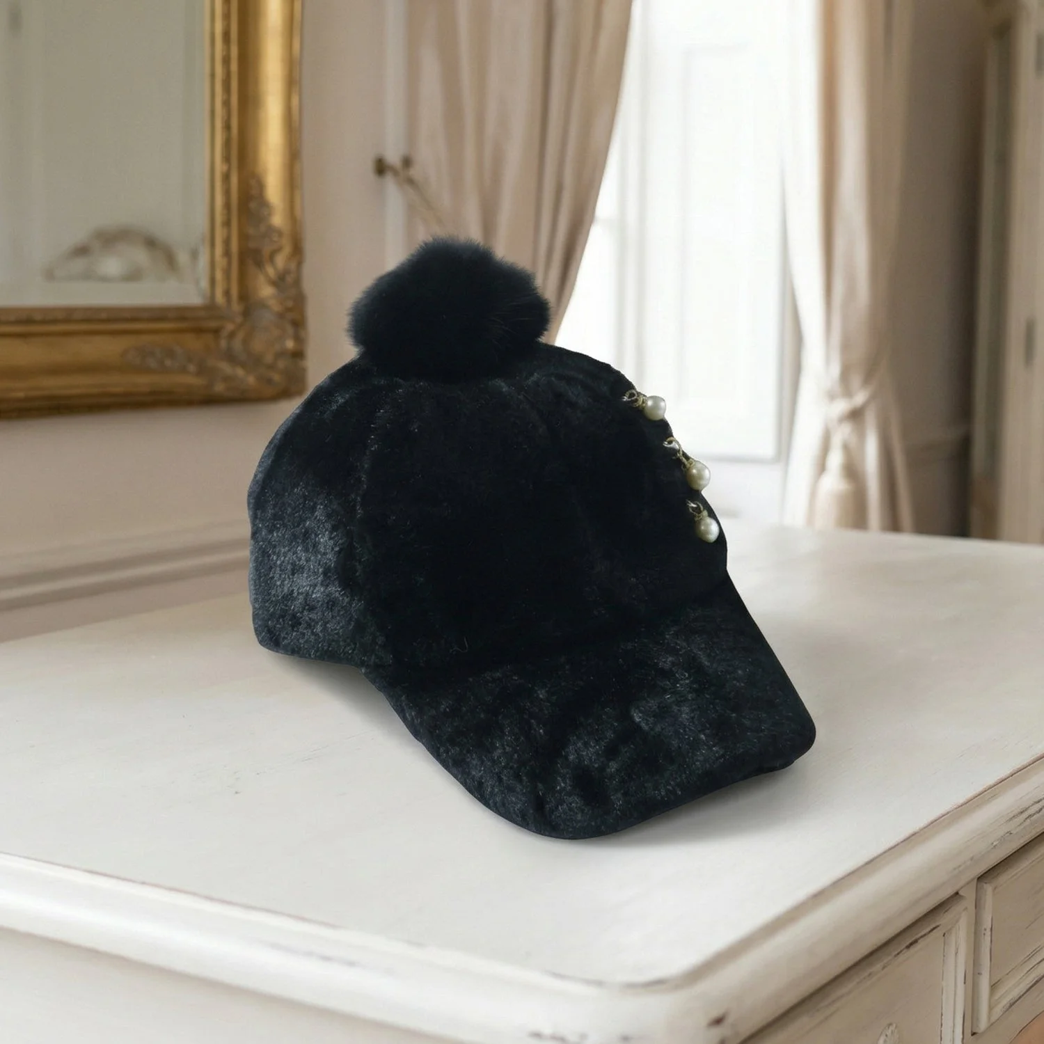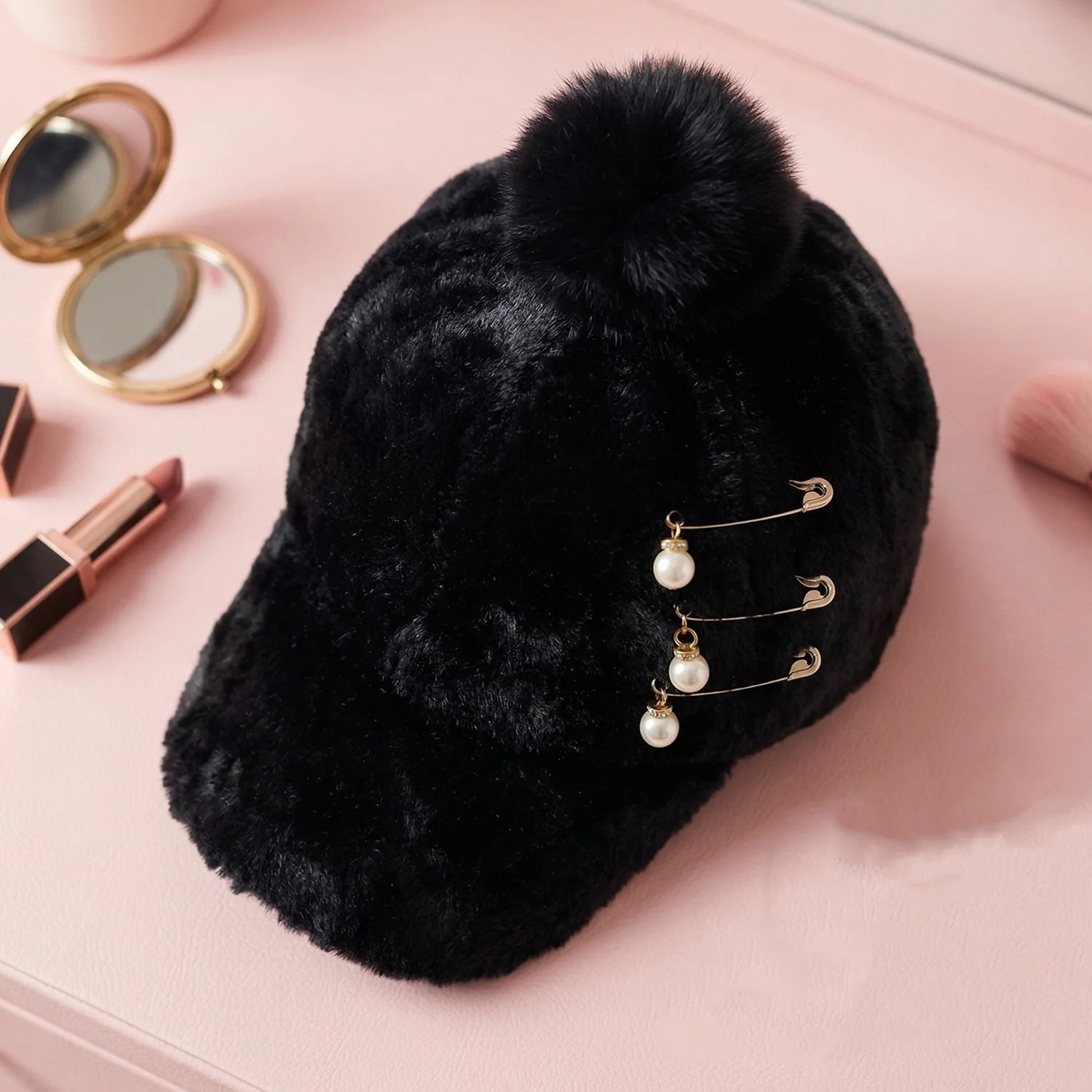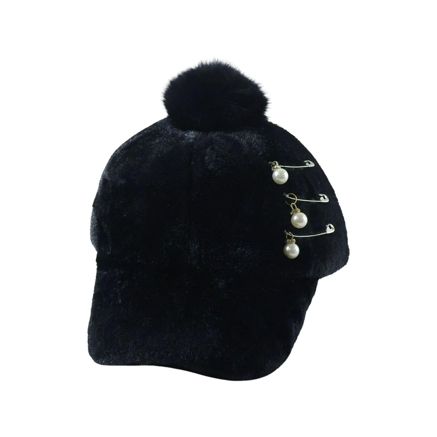 Elegant Winter Fur Cap for Women 1 Pc – Soft Plush Warm Cap with Pom Pom and Pearl Chain Decorative Design Stylish Cold Weather Fashion Headwear for Daily Wear & Outdoor Use