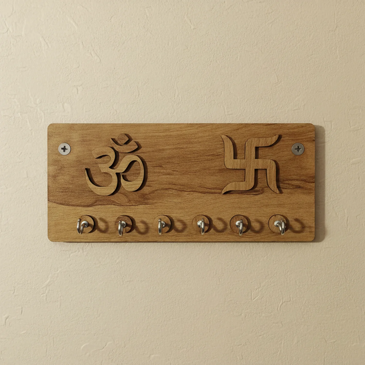Elevate your home décor with this Embossed Om & Swastik Wooden Key Holder, designed for those who appreciate depth, craftsmanship, and spiritual elegance. Unlike laser-cut designs, this key holder features raised (3D embossed) Om and Swastik symbols, giving it a richer, more premium visual appeal.