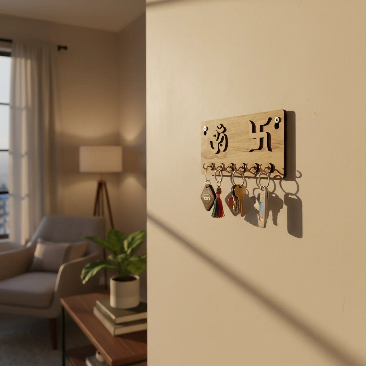 Crafted from high-quality MDF with a smooth natural wood grain, this wall-mounted key organizer blends traditional Indian symbolism with refined modern aesthetics. The embossed detailing creates subtle shadows, enhancing the look under both natural and warm indoor lighting—perfect for entryways, living rooms, pooja areas, or corridors.