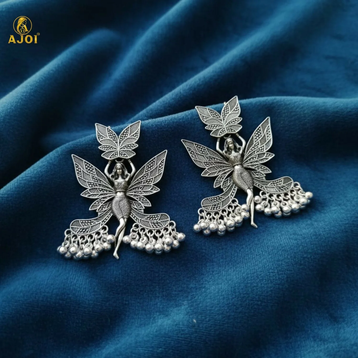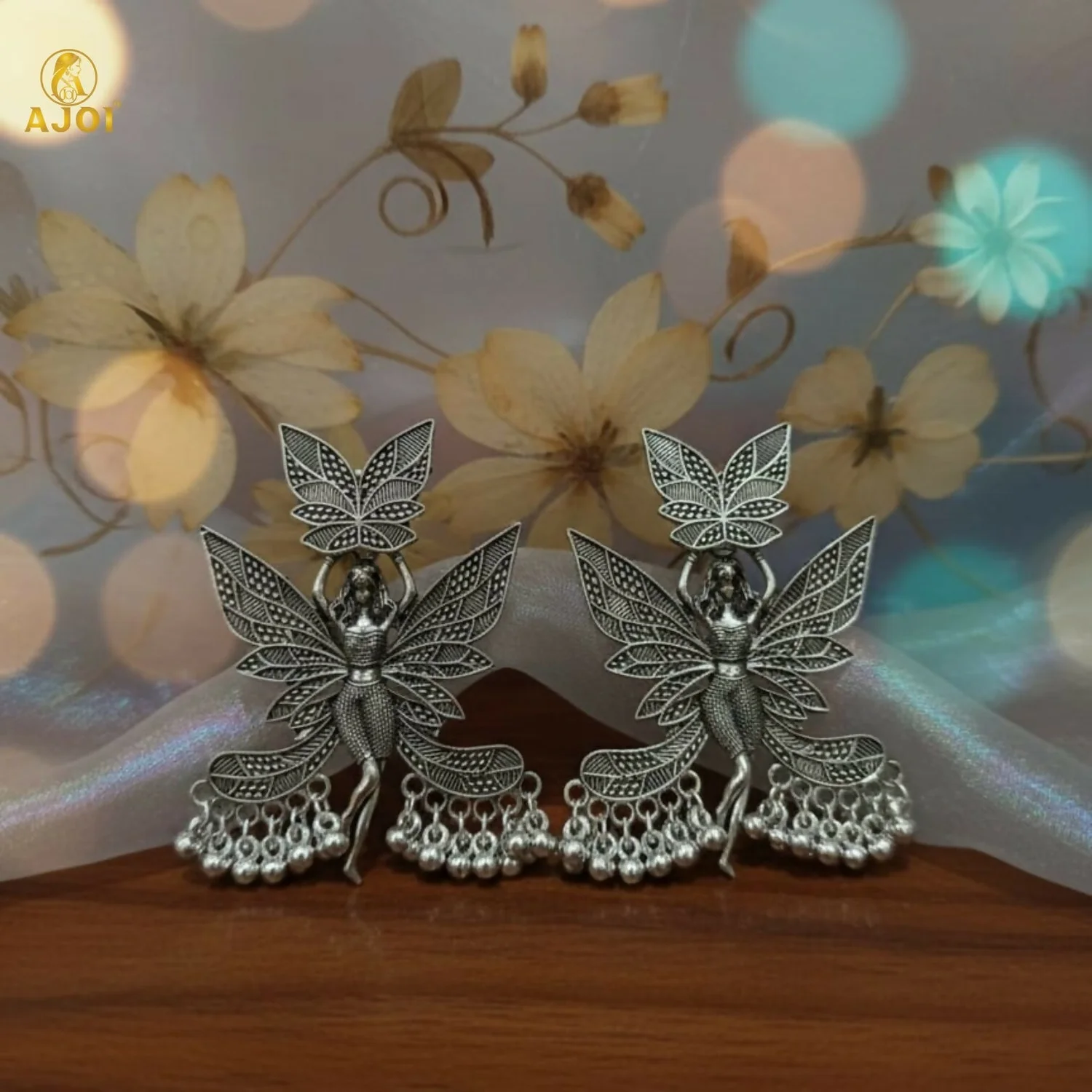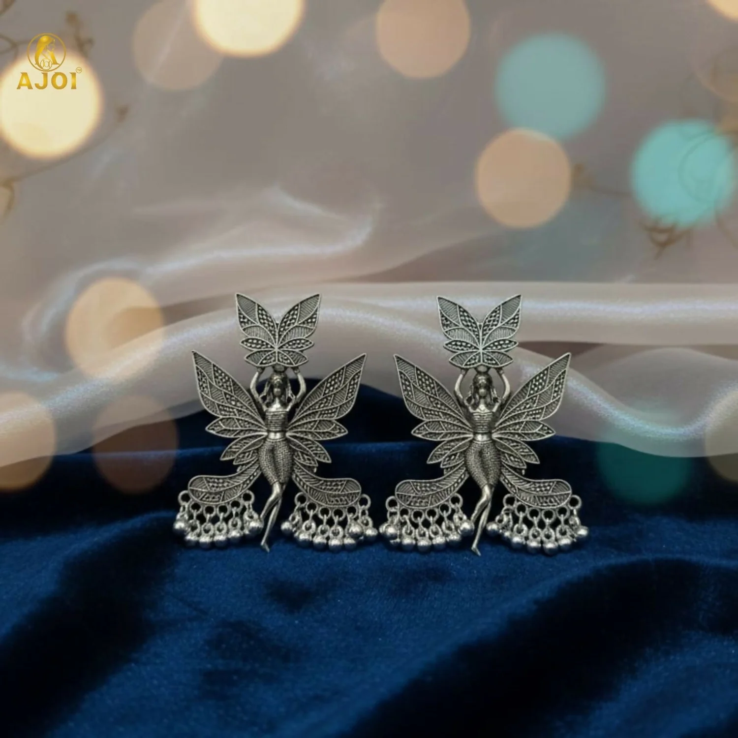 Unveil a touch of magic with these exquisitely handcrafted Enchanted Fairy Wing Statement Earrings, designed for women who love artistic luxury and unique expression. Finished in an elegant oxidized silver tone, these earrings feature a graceful fairy silhouette adorned with intricately detailed wings that symbolize freedom, beauty, and imagination.