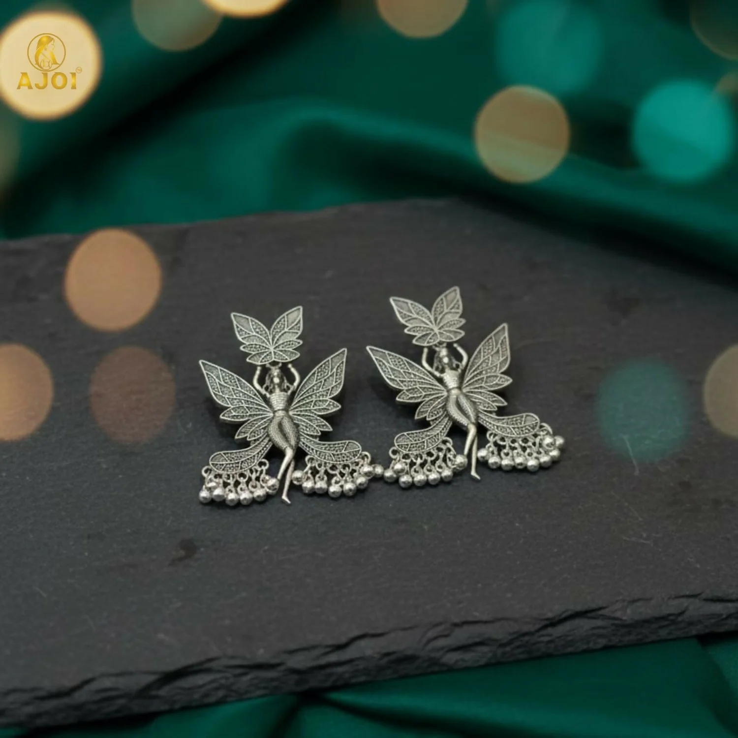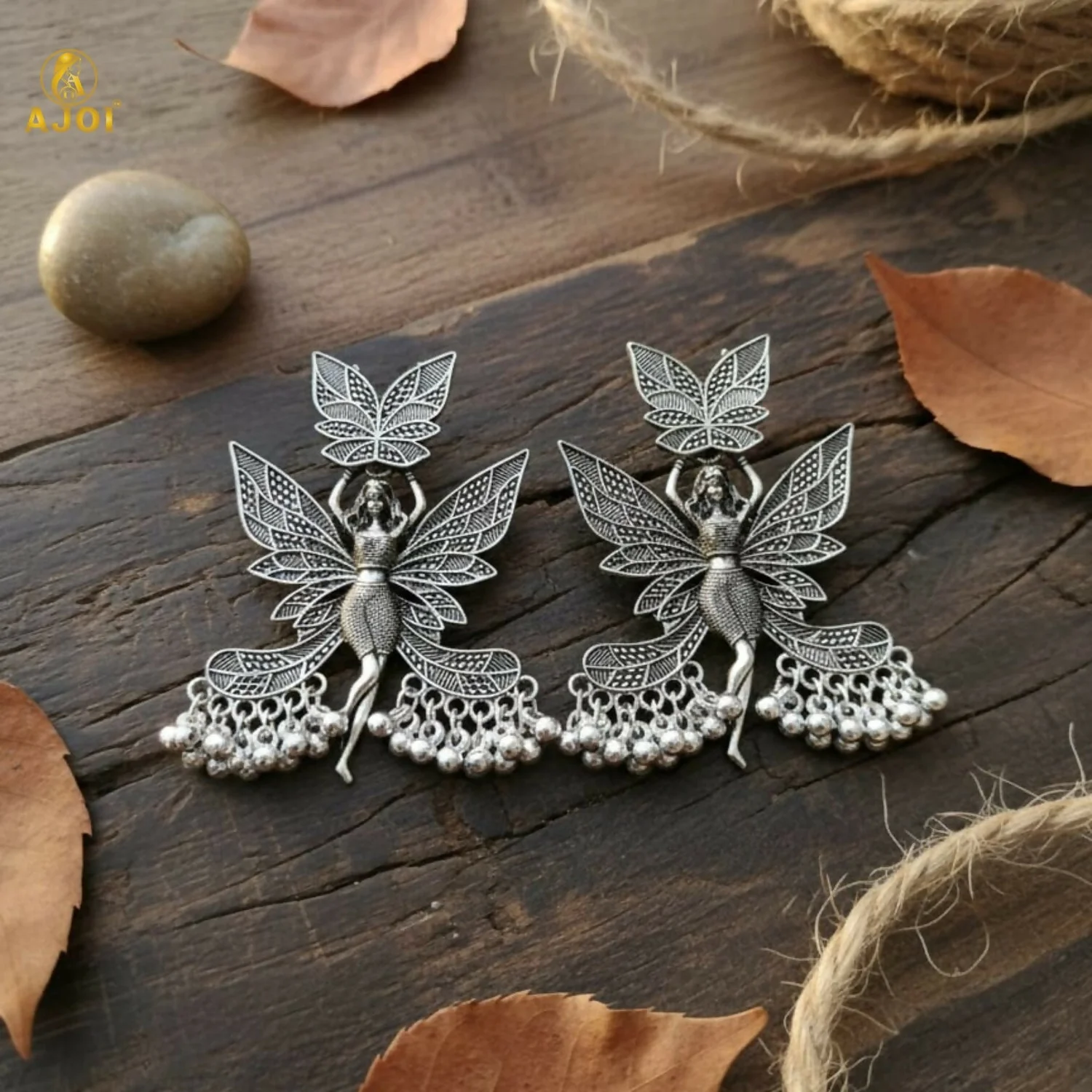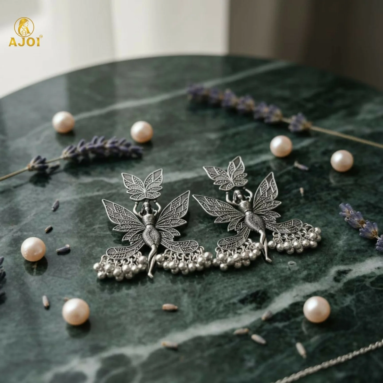 Unveil a touch of magic with these exquisitely handcrafted Enchanted Fairy Wing Statement Earrings, designed for women who love artistic luxury and unique expression. Finished in an elegant oxidized silver tone, these earrings feature a graceful fairy silhouette adorned with intricately detailed wings that symbolize freedom, beauty, and imagination.