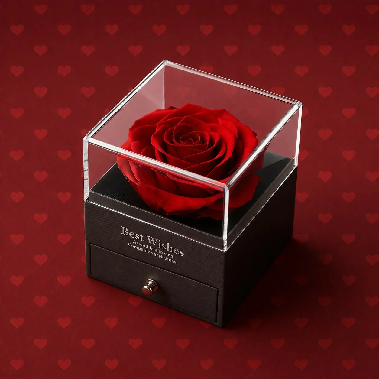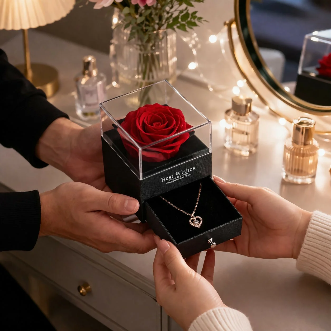 Surprise your loved ones with this elegant eternal rose gift box featuring a beautifully preserved rose under a transparent cover and a hidden drawer with a delicate necklace. Designed to symbolize everlasting love, this premium gift box is perfect for special occasions like anniversaries, birthdays, or celebrations. The stylish design adds a luxurious touch to any dressing table or home décor setup.