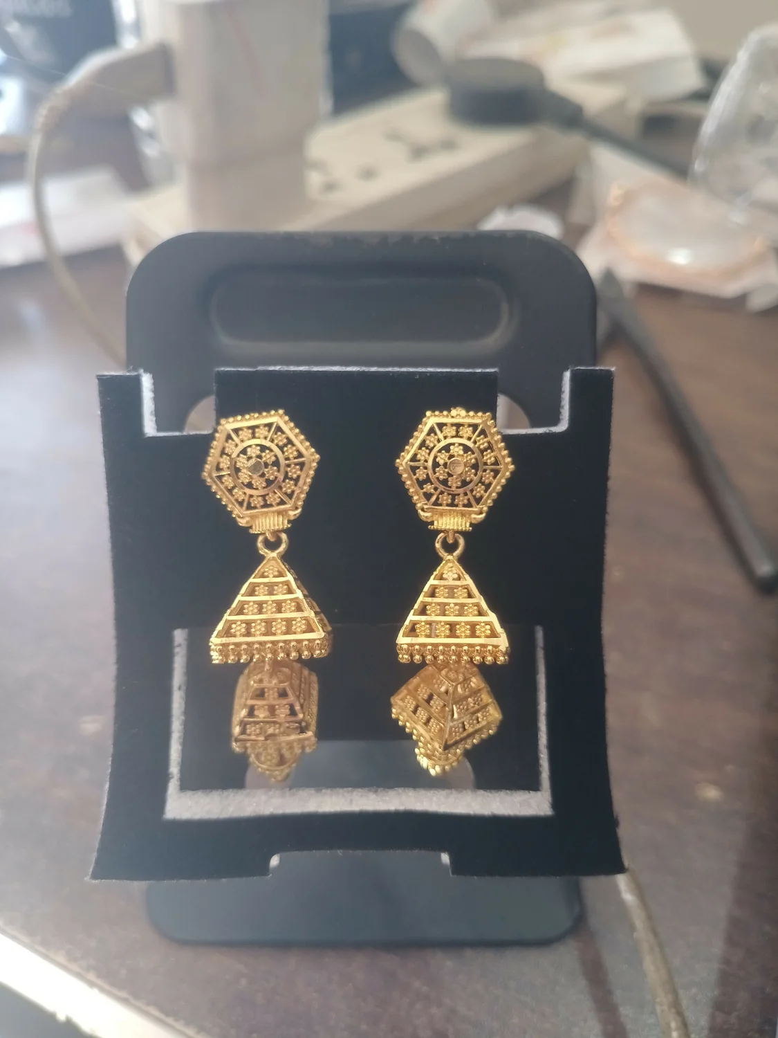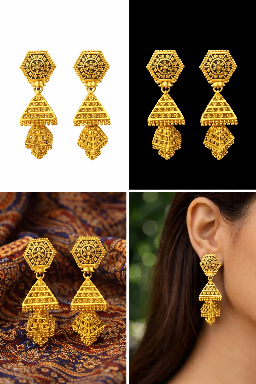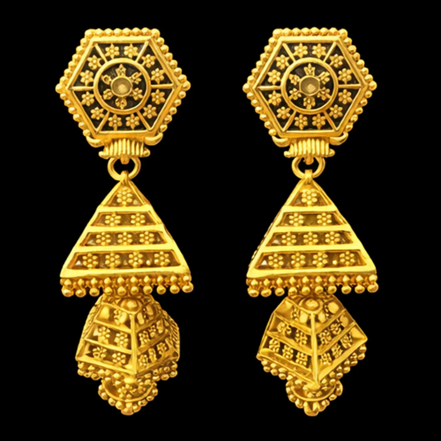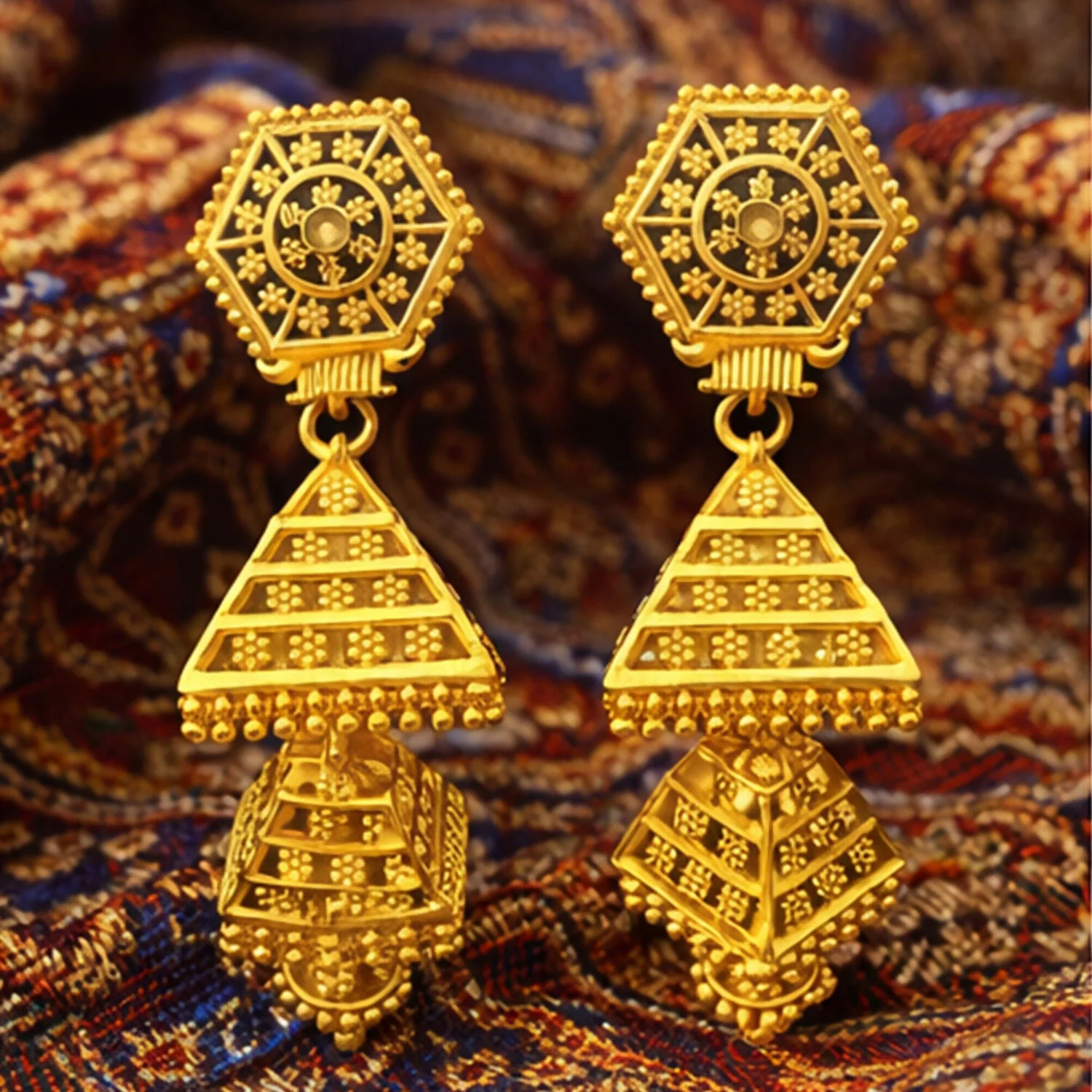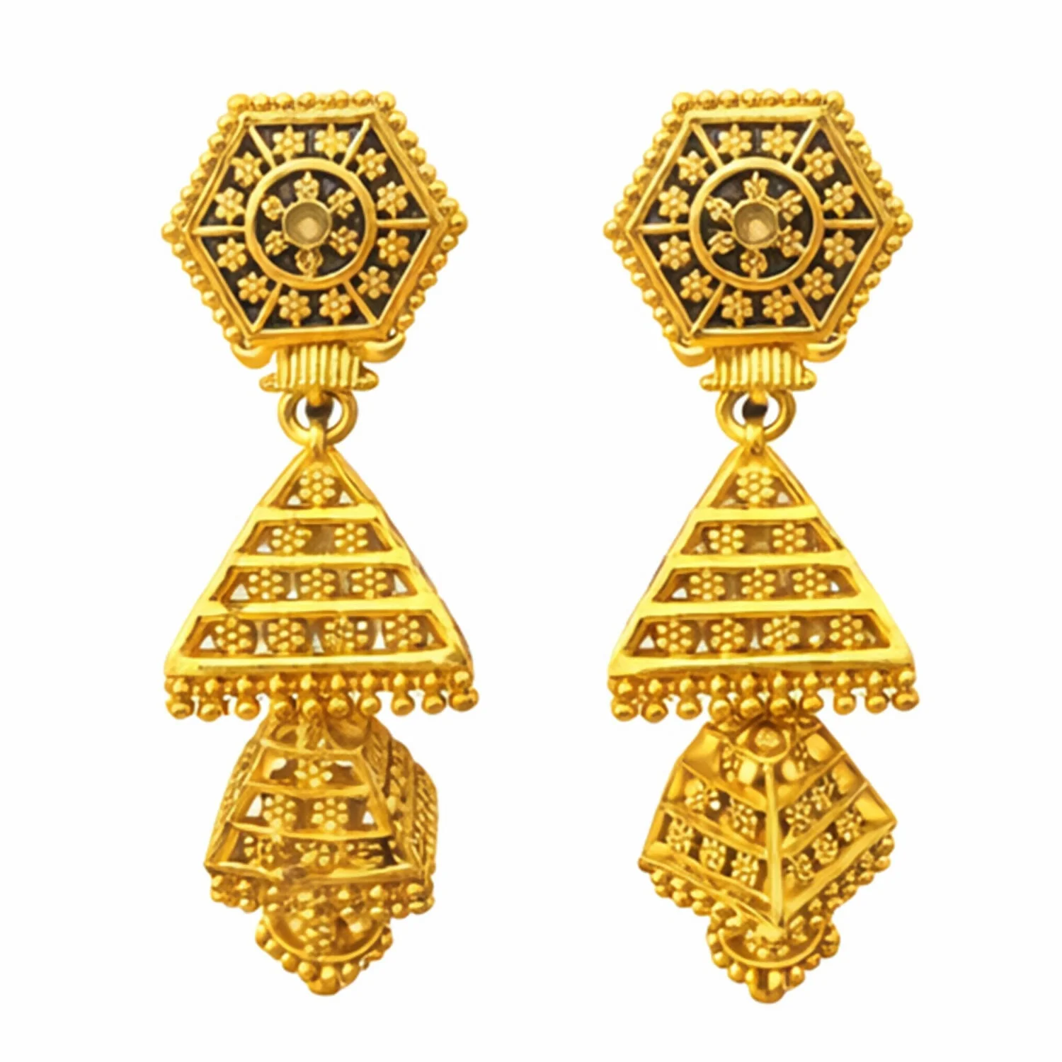 These beautiful traditional jhumka earrings are crafted with an elegant hexagon top and detailed pyramid-shaped danglers, giving them a rich ethnic look. Designed with a premium gold-plated finish, these earrings offer a perfect blend of tradition and style. Lightweight and comfortable to wear, they are ideal for weddings, festivals, parties, and special occasions. The intricate detailing enhances both ethnic and Indo-western outfits. A perfect gifting choice for birthdays, anniversaries, weddings, and festive celebrations.