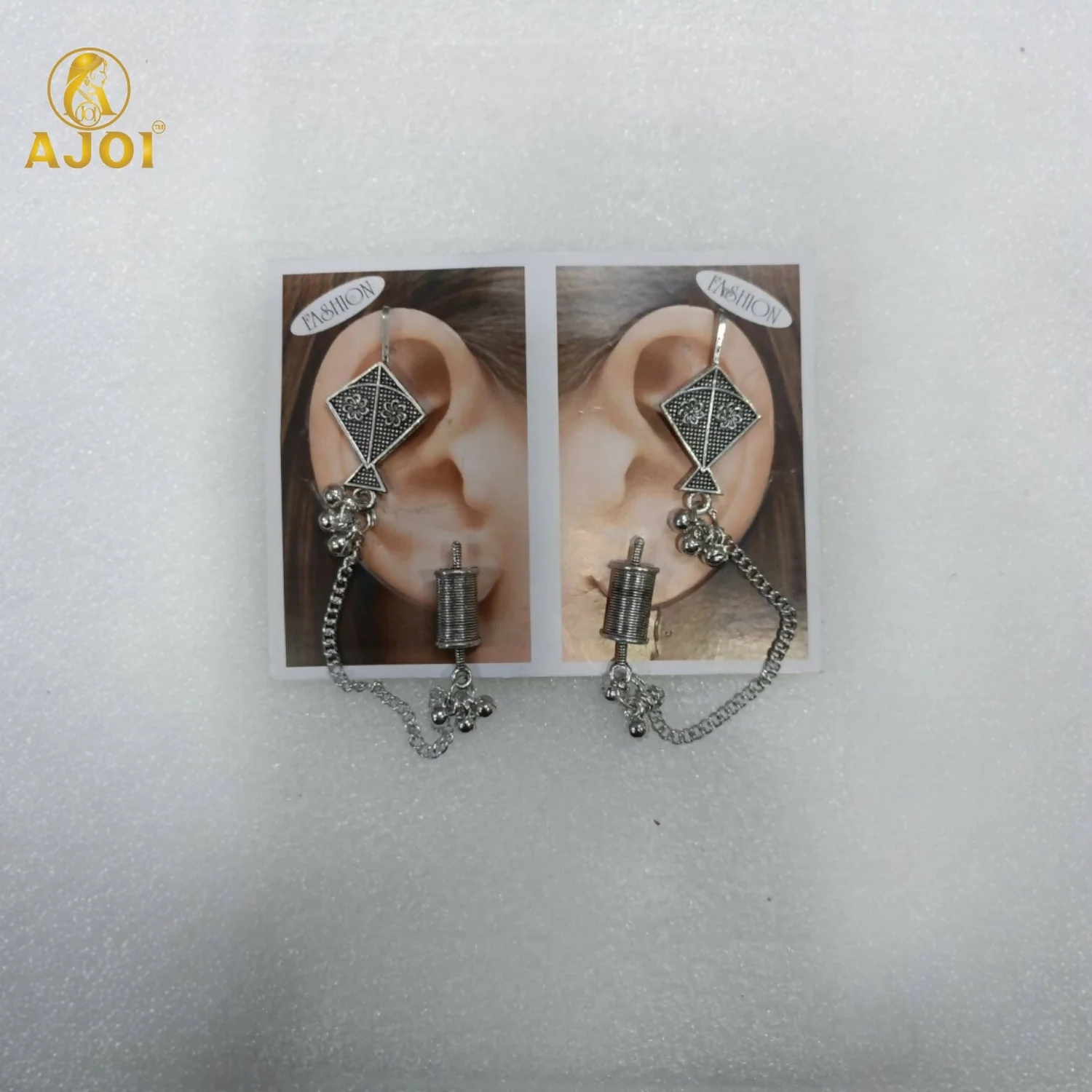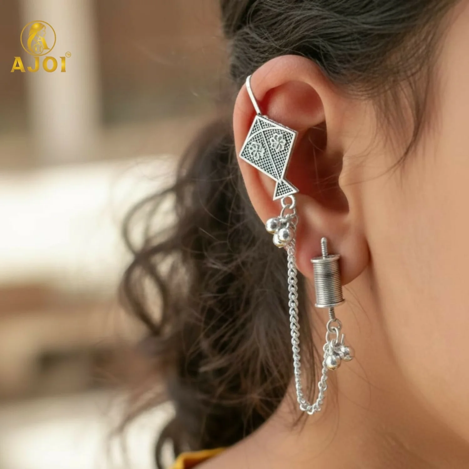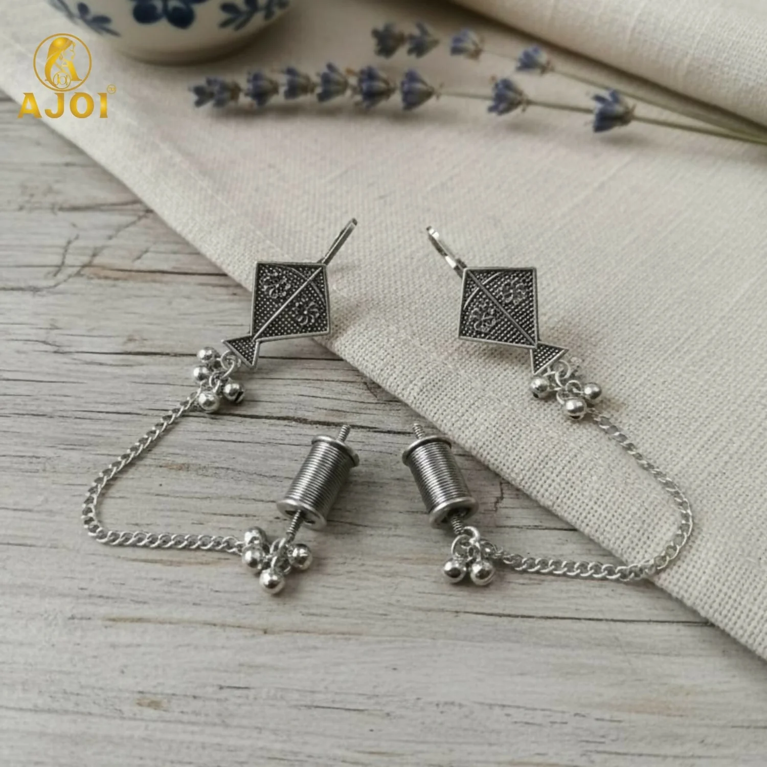 Enhance your traditional look with these beautifully crafted oxidised silver earrings featuring a unique kite-inspired design. The earrings come with an elegant attached chain and delicate ghungroo bead detailing that adds charm and movement. Made from high-quality metal with antique oxidised finish, this jewellery piece is lightweight, comfortable, and perfect for daily wear as well as festive occasions.