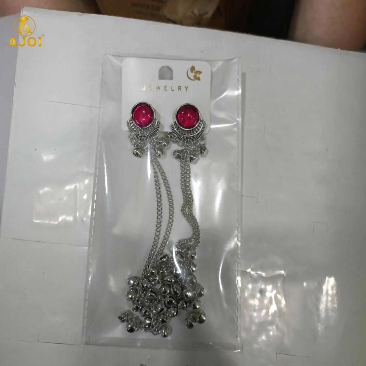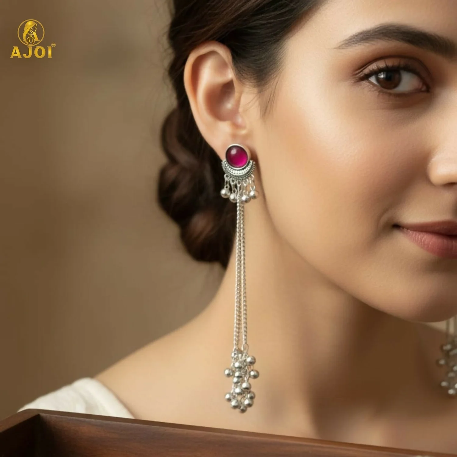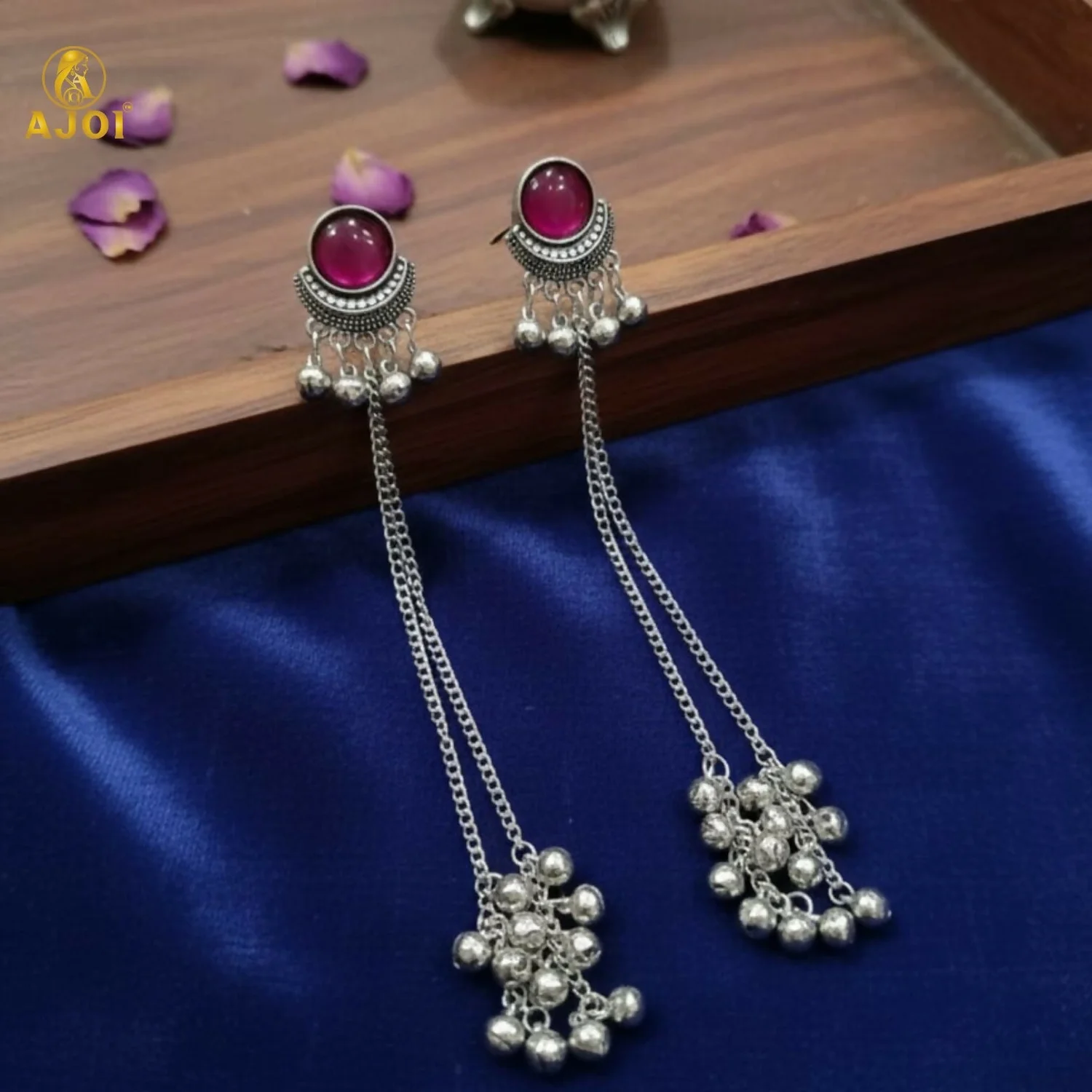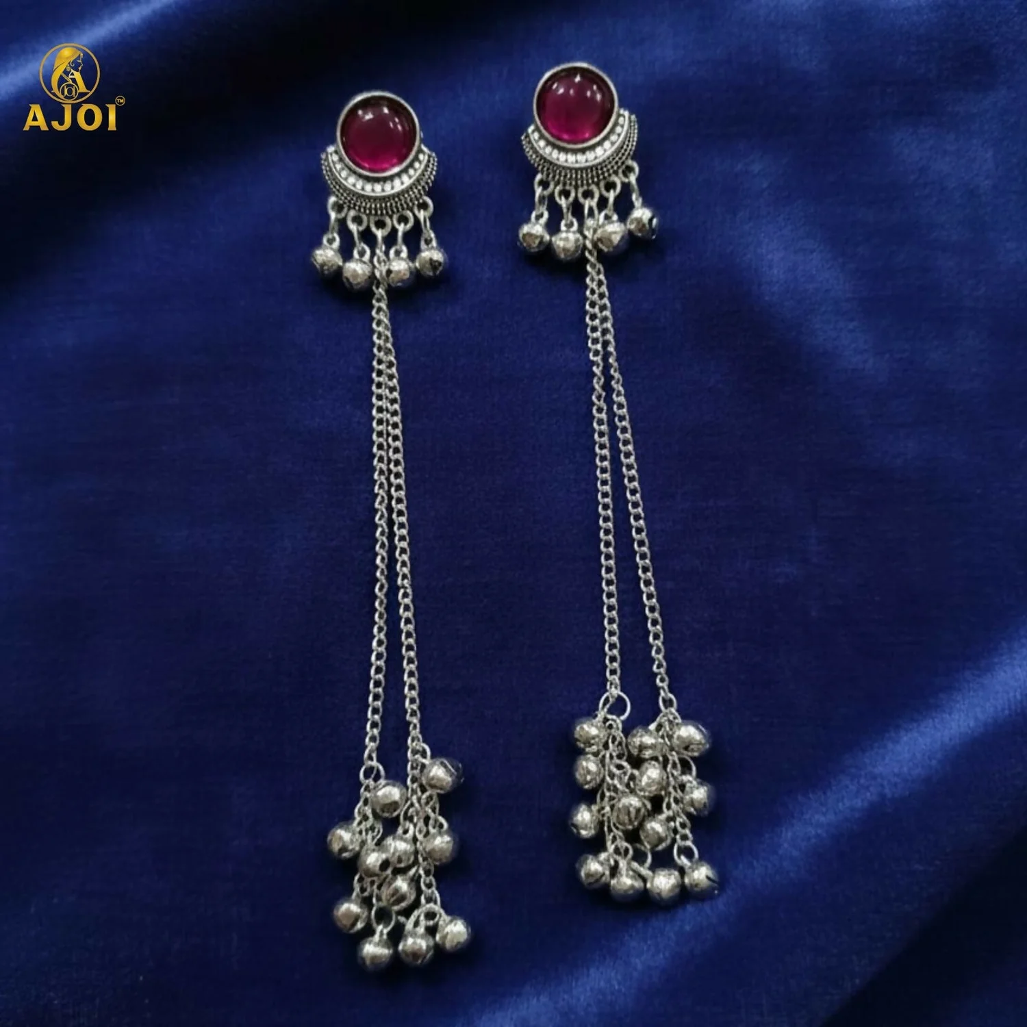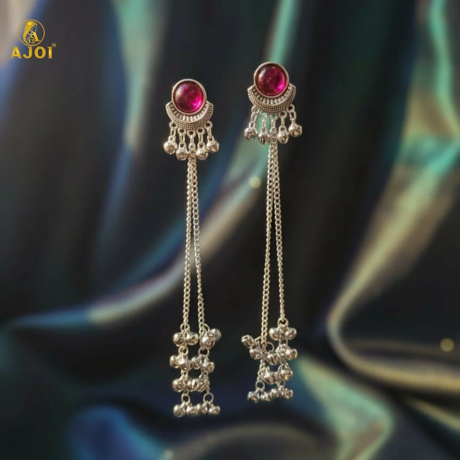 Elevate your ethnic style with these elegant Kashmiri-inspired long chain drop earrings. Designed with a round pink stone stud framed in intricate silver detailing, these earrings feature graceful silver-plated chains finished with multiple ghungroo bead clusters. The traditional silhouette reflects classic Kashmiri craftsmanship, making them an ideal choice for weddings, festivals, and cultural occasions. Lightweight yet striking, they pair beautifully with sarees, lehengas, and traditional outfits.