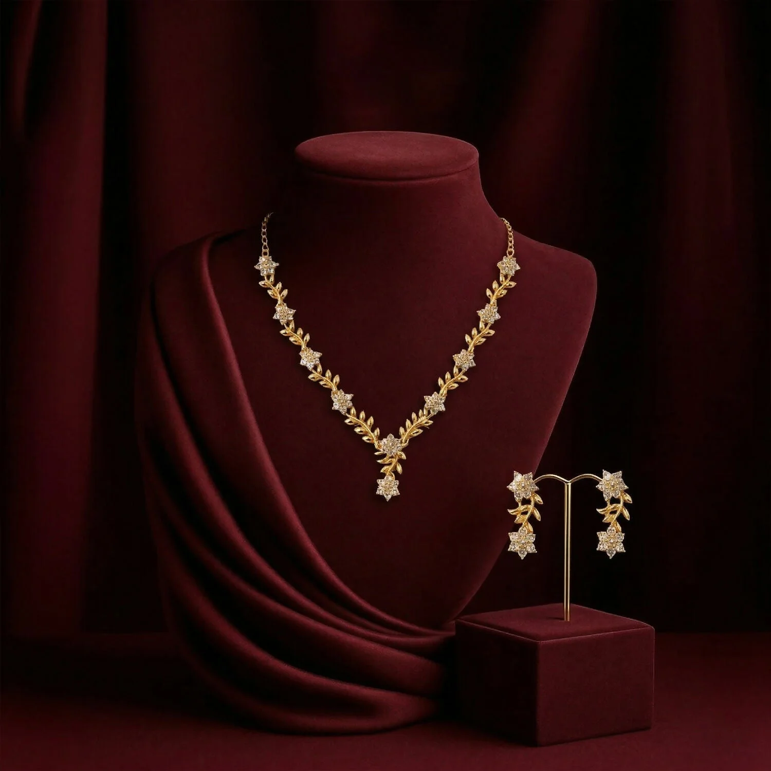 Earrings: The earrings mirror the necklace’s design, each featuring a vertical arrangement of small floral clusters with similar sparkling stones and gold leaf accents.