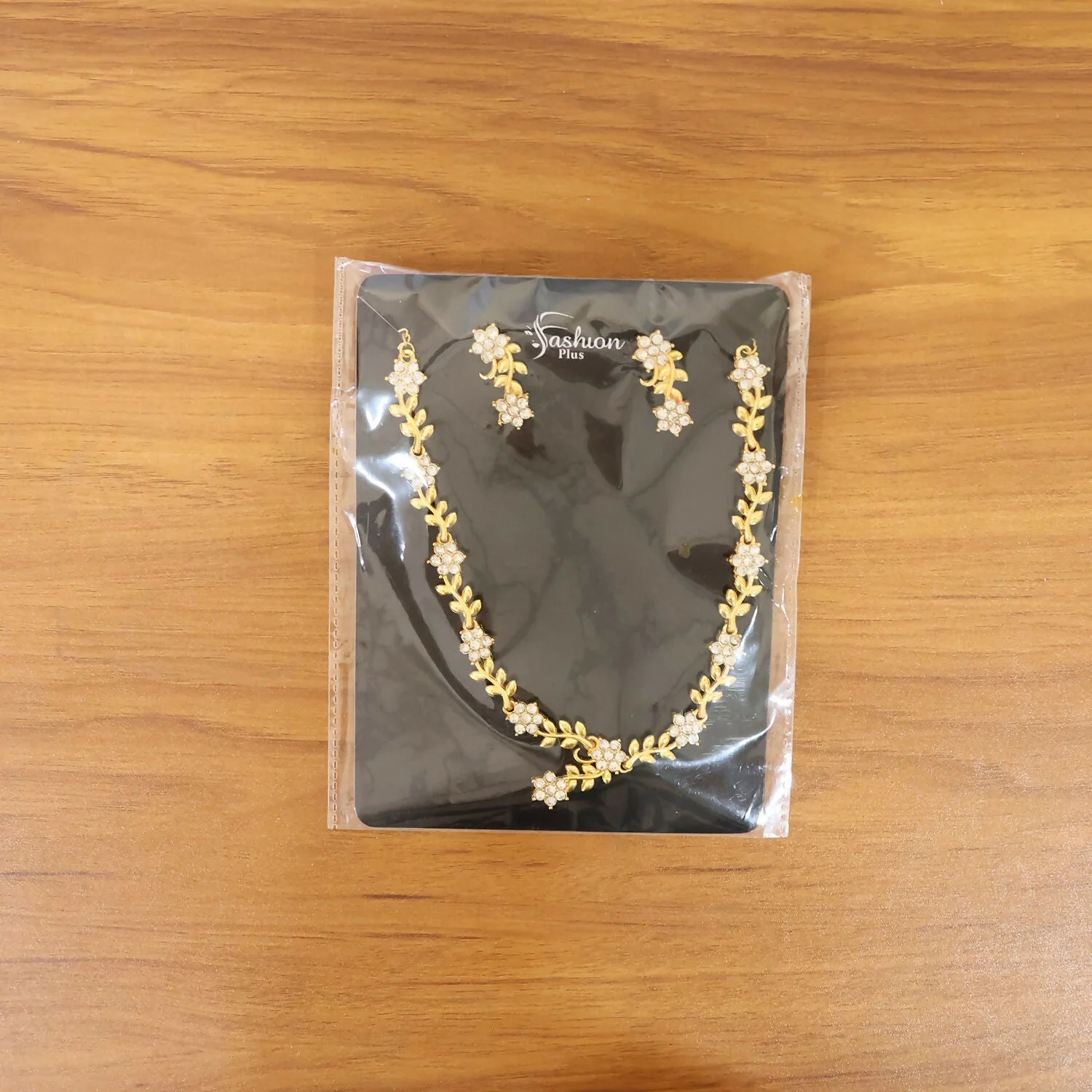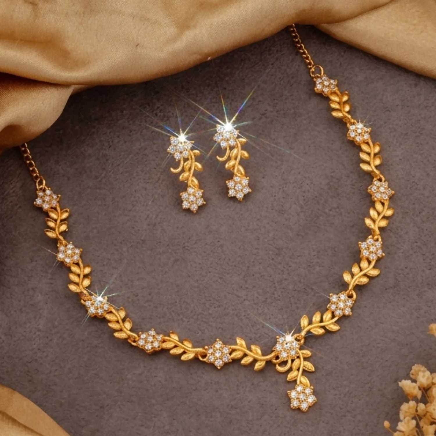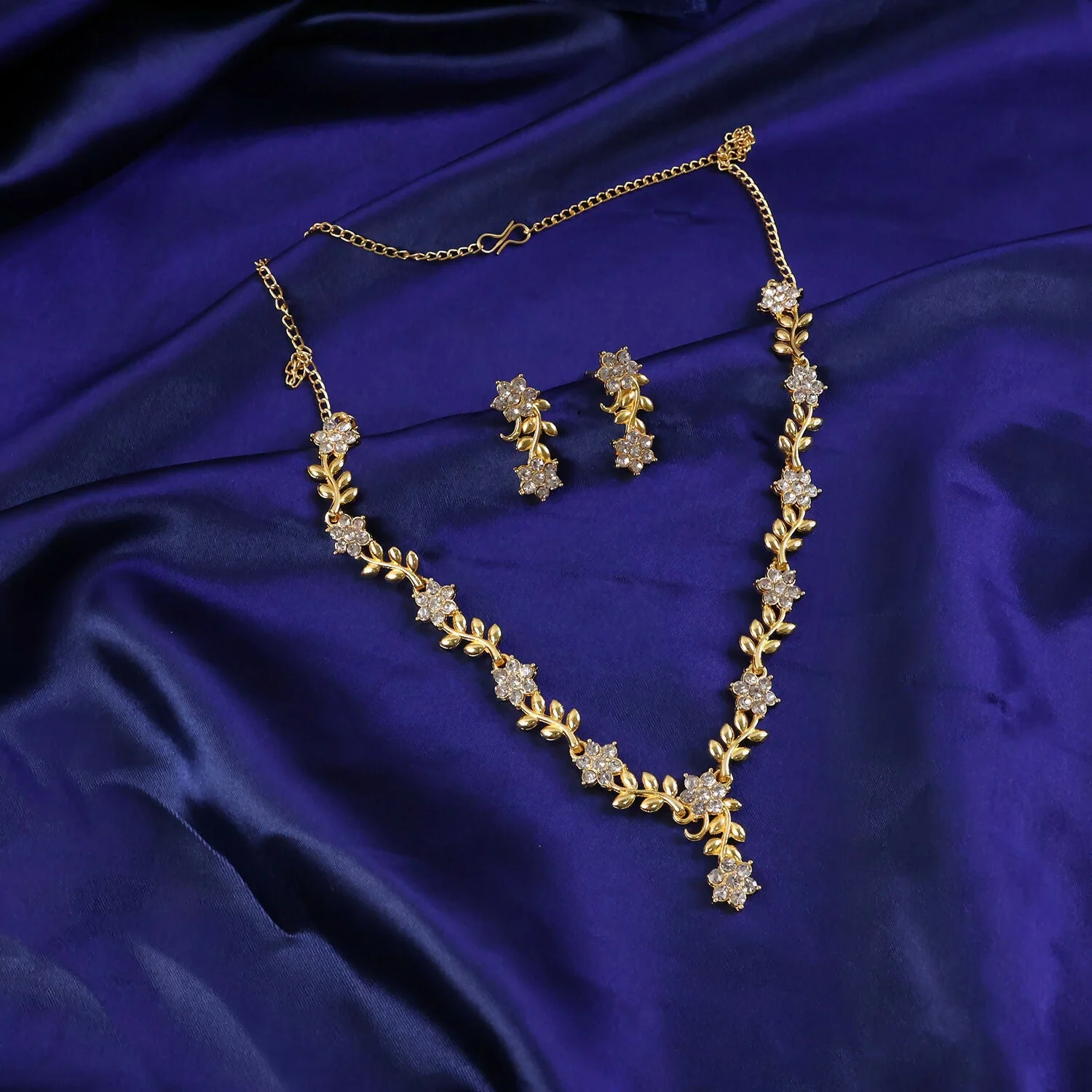 Necklace: The necklace has a fine chain with an elegant, symmetrical design. It features small leaf-like details along the chain, interspersed with flower-shaped clusters that appear to be set with clear, sparkling stones (likely crystals or diamonds). The centerpiece drops slightly in a V-shape, ending in a floral motif that adds a graceful focal point.