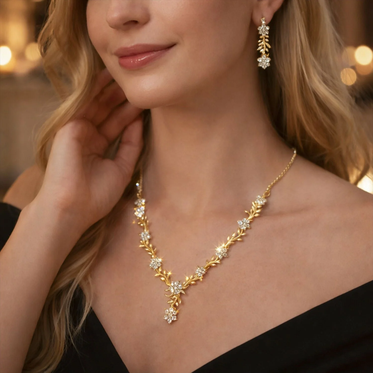 Overall style: The design is feminine and refined, with a nature-inspired floral theme. The gold finish combined with the shimmering stones gives it a luxurious, bridal or formal-occasion feel.