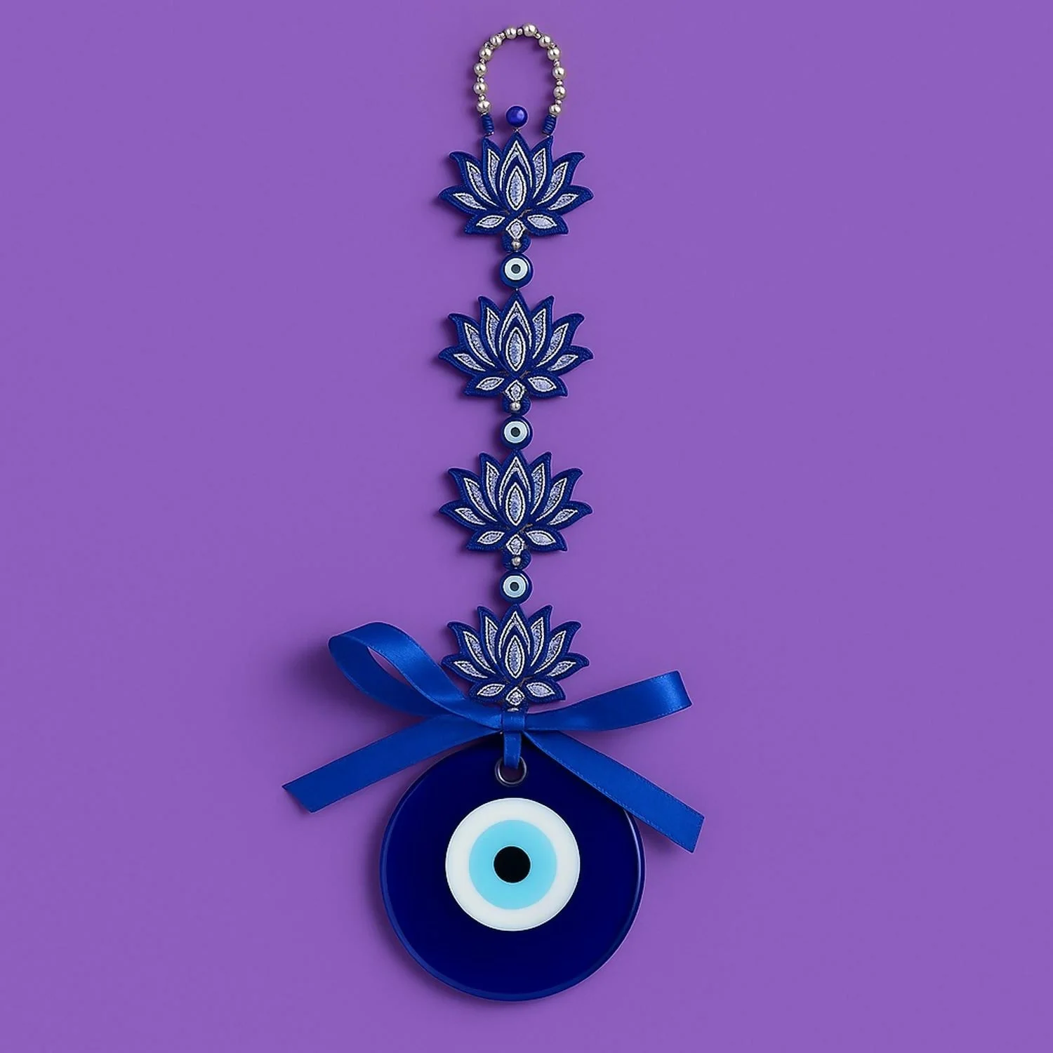 Add a touch of tradition, spirituality, and protection to your space with this beautifully crafted Evil Eye Wall Hanging. Designed with symbolic blue lotus motifs and Om patterns, this decorative piece not only enhances the aesthetics of your home but also serves as a protective charm against negative energies (Nazar Battu). The deep blue Evil Eye centerpiece symbolizes warding off the evil eye, while the elegant ribbon and beads make it suitable for wall décor, door hangings, office entrances, or even car rear-view mirrors. Perfect as a gift for housewarmings, festive occasions, or spiritual celebrations.