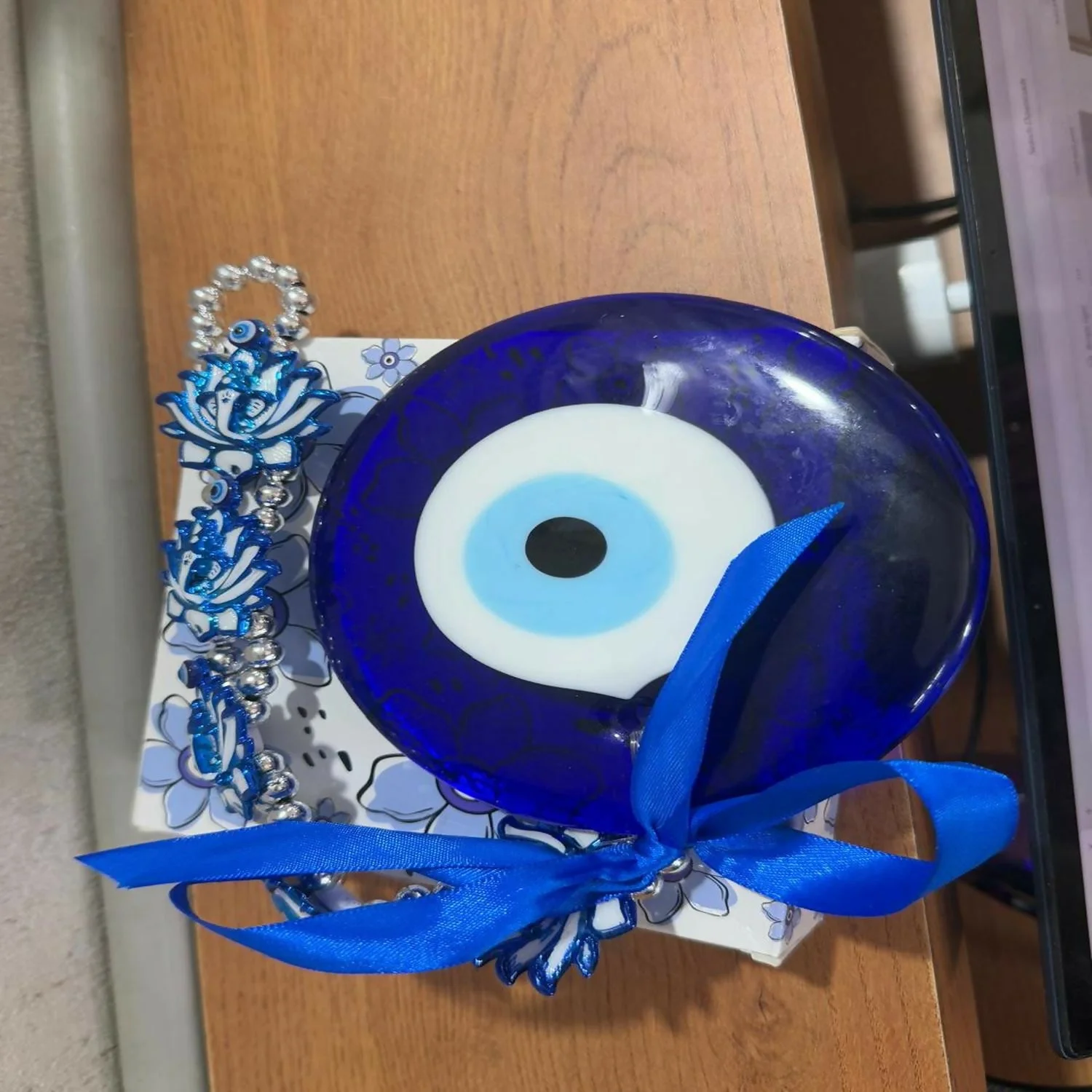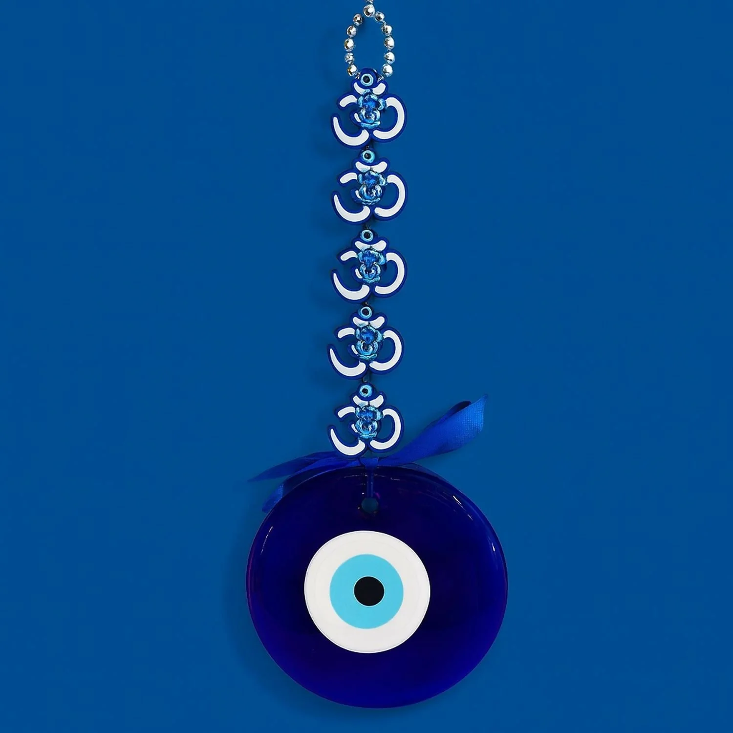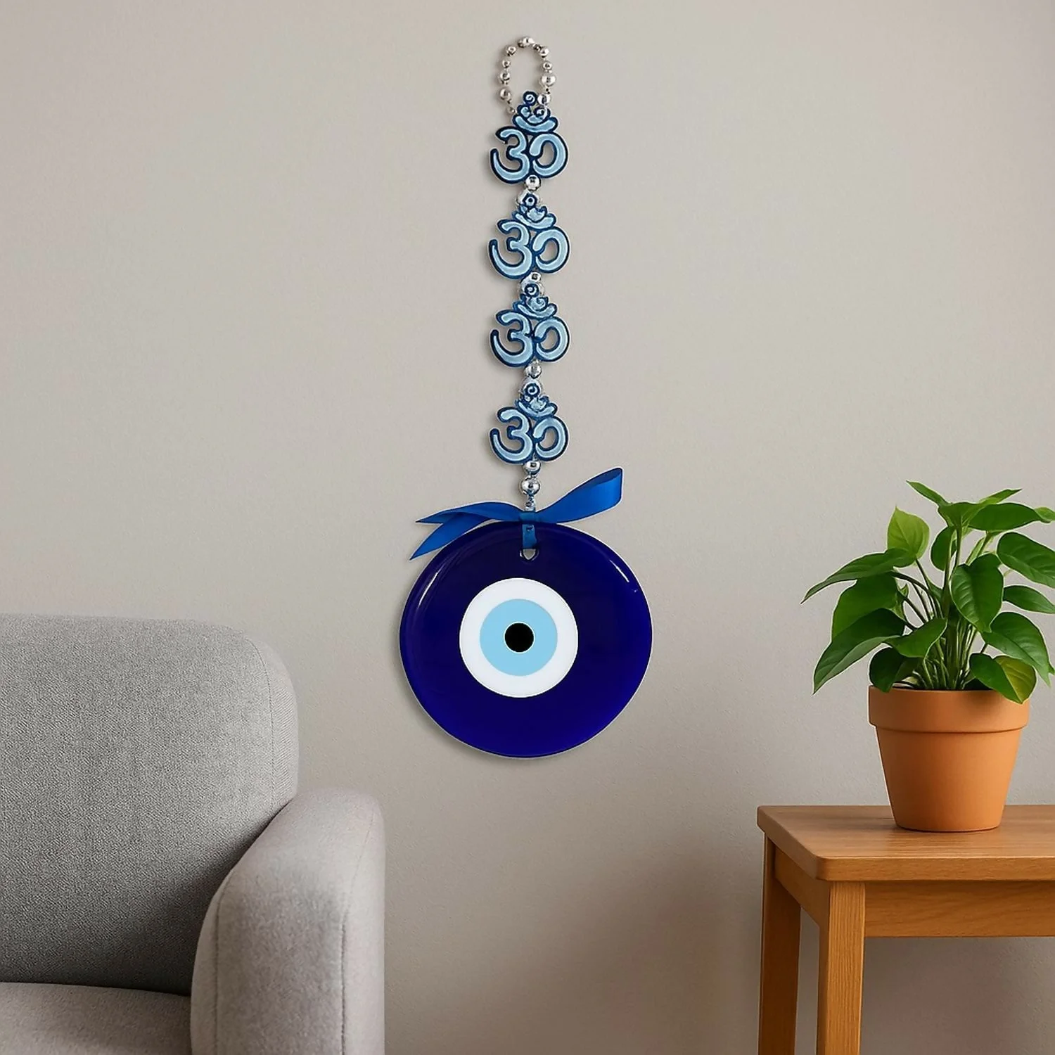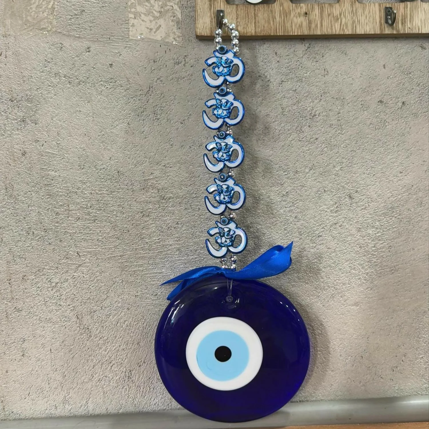 evil eye wall hanging, nazar battu hanging, blue evil eye décor, om evil eye wall charm, lotus evil eye wall décor, protection charm for home, spiritual wall hanging, vastu wall hanging décor, evil eye gift item, wall hanging for negative energy, decorative evil eye with ribbon, car hanging evil eye charm