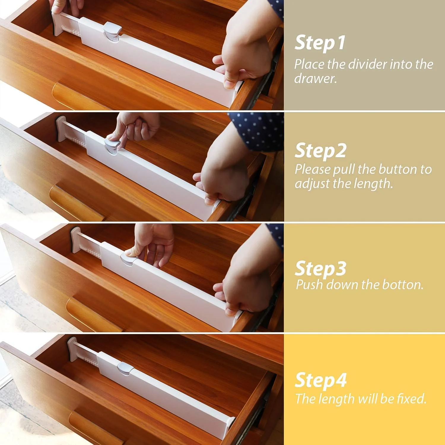 expandable drawer dividers, adjustable drawer dividers, drawer organizer, drawer divider set, adjustable storage organizers, drawer separators, desk drawer organizer, kitchen drawer dividers, bathroom drawer dividers, office drawer organizer, multi compartment drawer divider, space saving drawer organizer