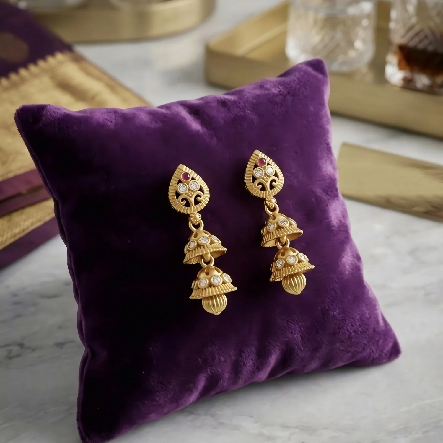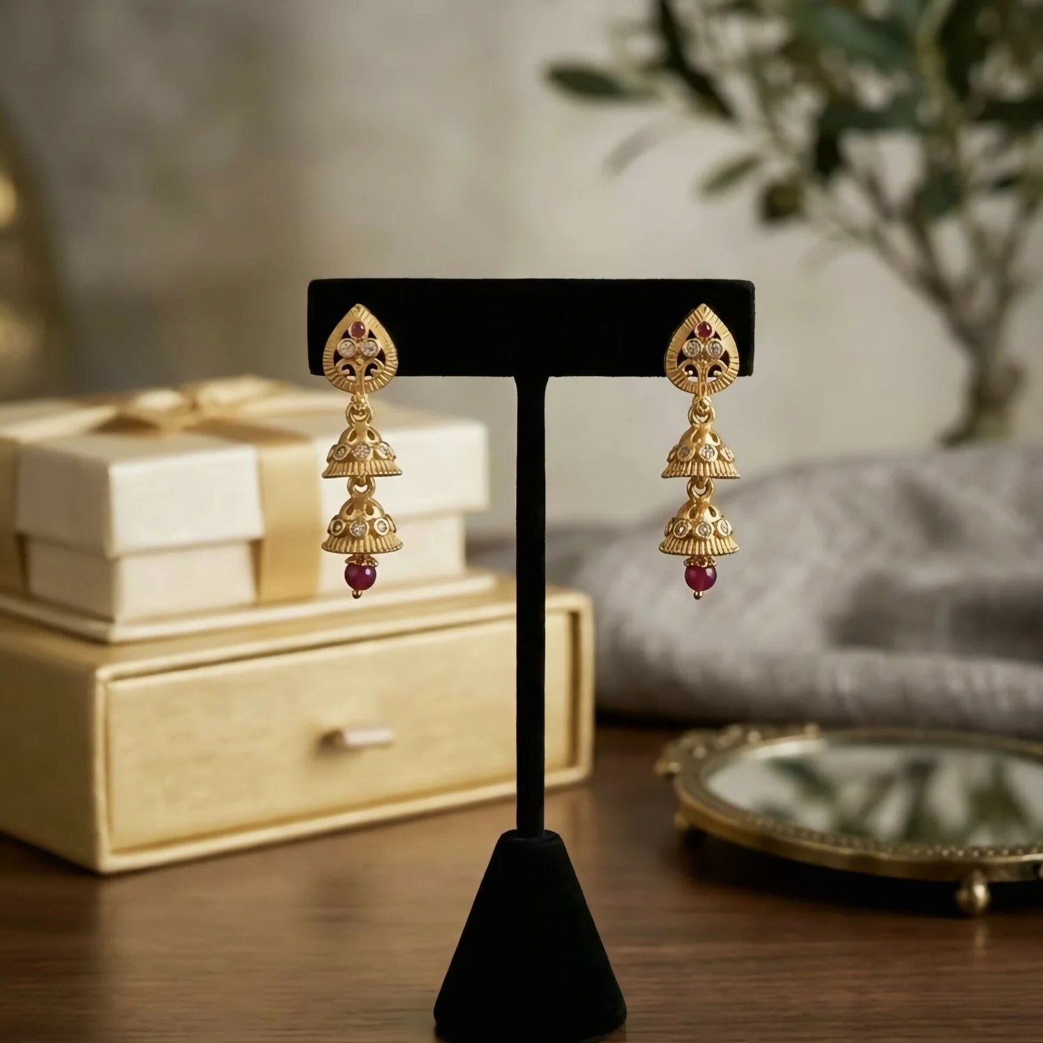 The drop design consists of two elegantly tapered bells (jhumka). Each tier is detailed with textured golden patterns and additional stone inlays, finished with a vibrant red bead at the base for a pop of classic color.