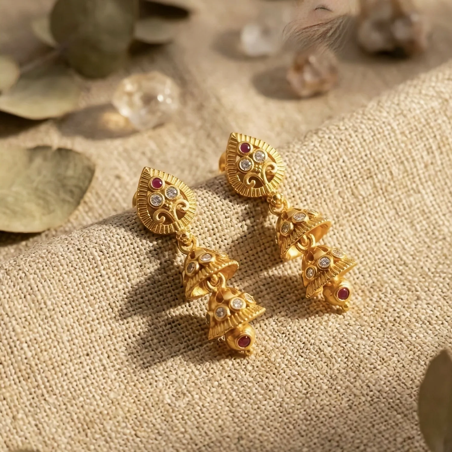This pair of Gold-Plated Two-Tier Jhumka Earrings blends traditional Indian craftsmanship with a refined, contemporary finish. Each earring features a delicate leaf-shaped stud embellished with intricate filigree work, a central ruby-toned stone, and sparkling clear crystal accents.