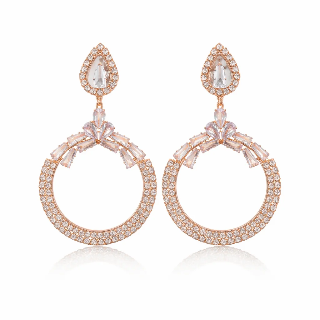 Add a touch of royal glamour to your collection with these exquisite rose gold–tone statement earrings. Designed with a sparkling teardrop stud at the top, they flow into a stunning floral arrangement of baguette and marquise-cut stones, creating a graceful and eye-catching look. The circular hoop is beautifully encrusted with fine shimmering crystals, enhancing its luxurious shine. Perfect for weddings, festive celebrations, and evening parties, these elegant earrings are crafted to make you stand out with timeless sophistication.