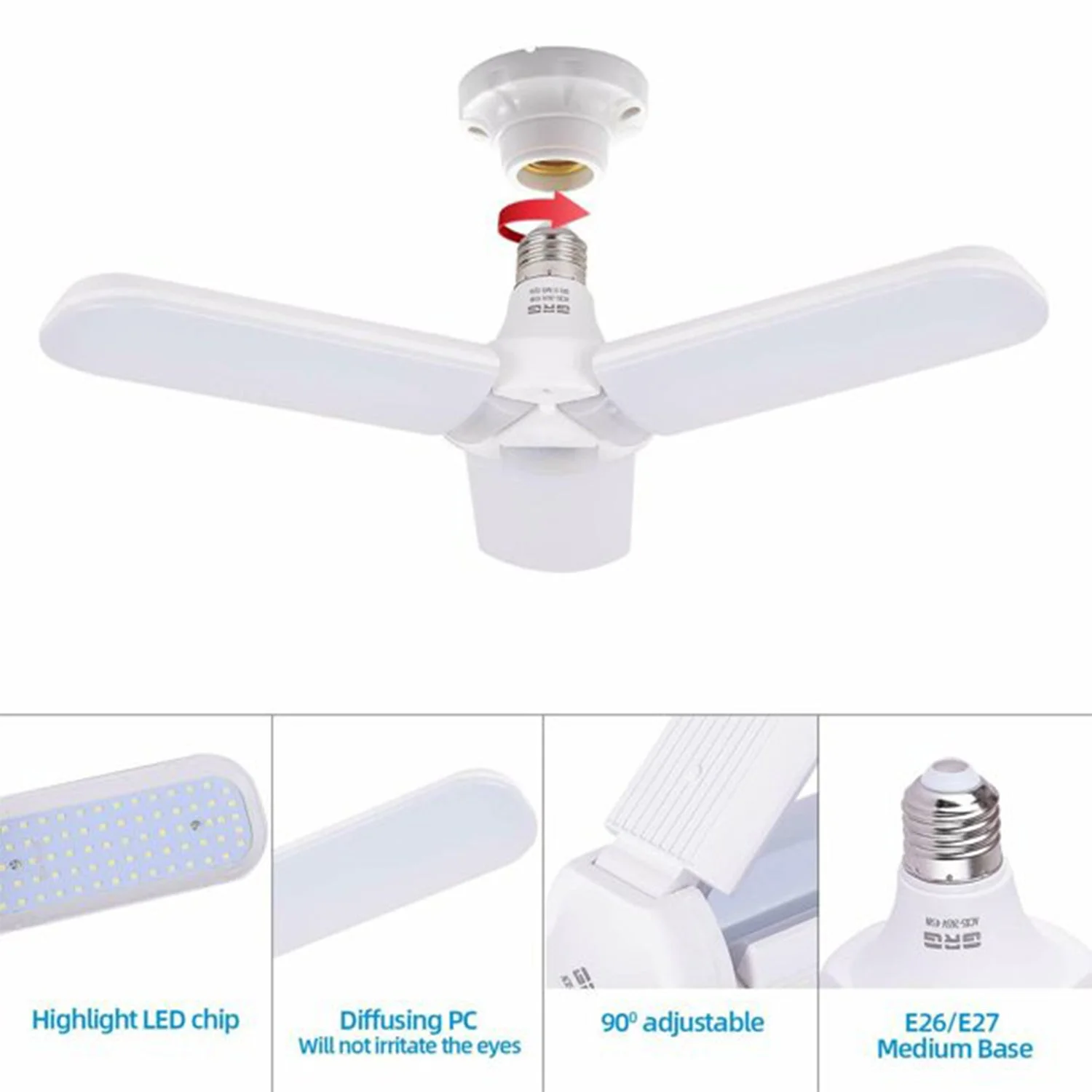 High Light Bulbs LED garage lights with 3 adjustable Light Heads high lumen output, top quality Led Chips in total, full coverage, no dark area. To provide the best indoor lighting experience, Each illumination unit could be adjusted by 90 degrees so that the illumination angle and area can be adjusted at your request. Easy To Install With B-22 standard medium base, it is simple and convenient to install. No tools, no wiring and professional electricians are needed to install this, it means you don't need to change your bulb holder, bulb Holder Wings LED bulb is design to bring flexibility in lightning to your living spaces.