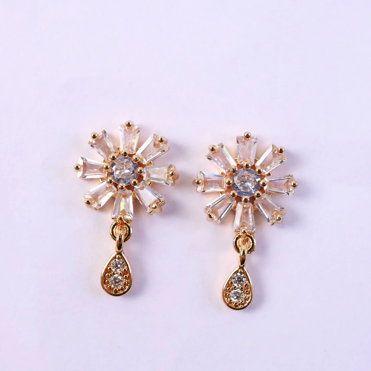 Yeh elegant floral-design earrings sparkling CZ stones ke saath aate hain, jo center flower pattern ko beautifully highlight karte hain. Neeche attached teardrop dangle design earrings ko graceful movement aur premium look deta hai. Light-looking yet classy finish inhe party wear, festive occasions aur special events ke liye perfect banata hai. Traditional aur modern outfits dono ke saath easily pair ho jaate hain. Overall, yeh earrings ek refined, feminine aur eye-catching jewellery choice hain.
