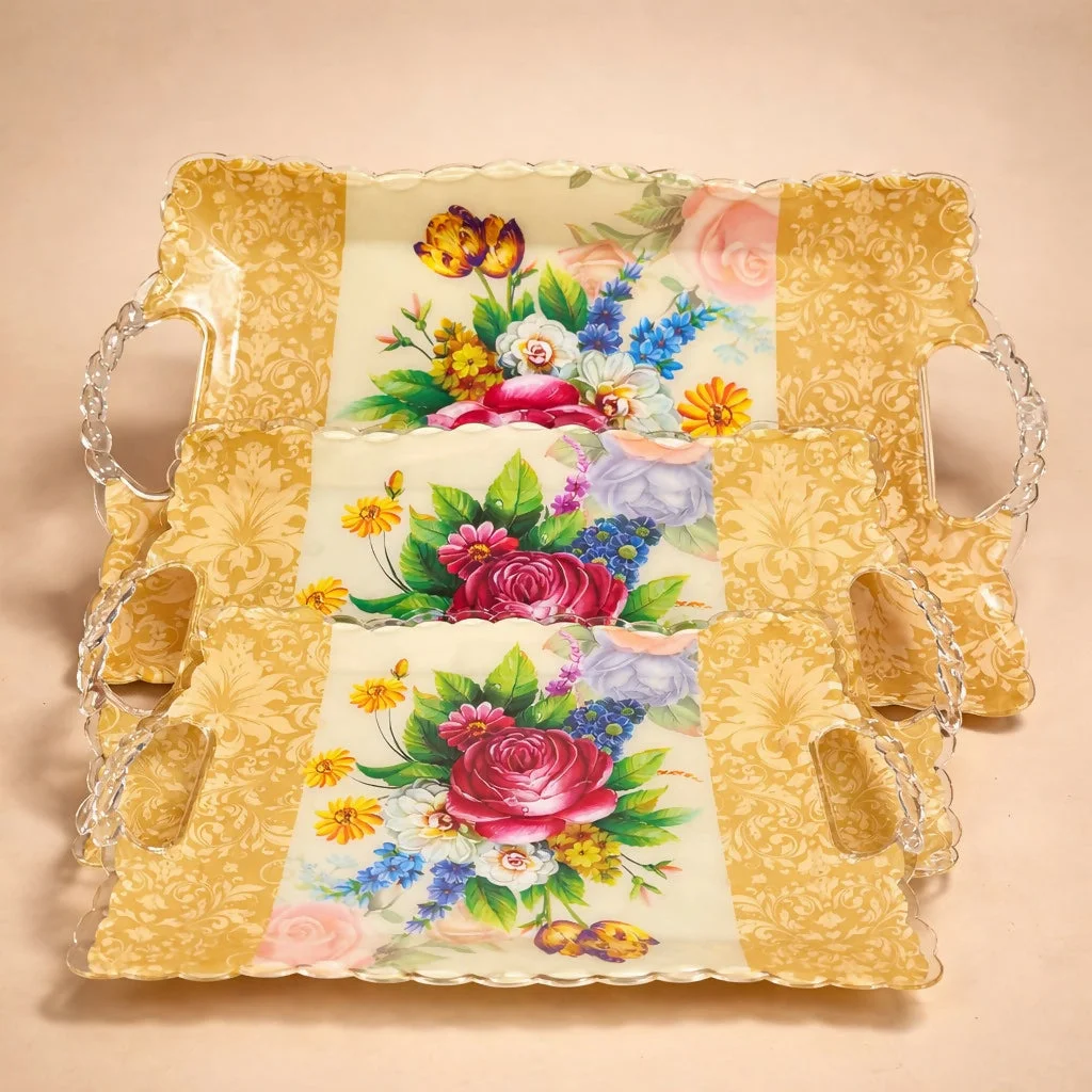 serving tray set, set of 3 trays, plastic serving tray, floral tray set, kitchen tray set, tea serving tray, snack tray set, multipurpose tray, food tray with handles, dining tray set, home kitchen accessories