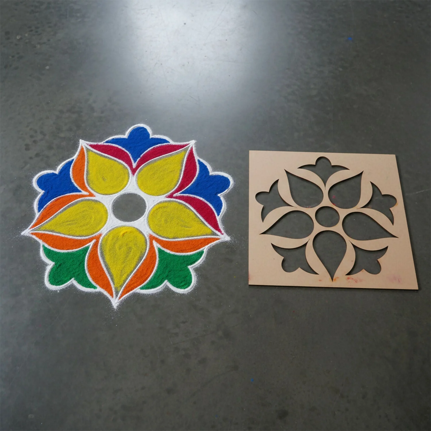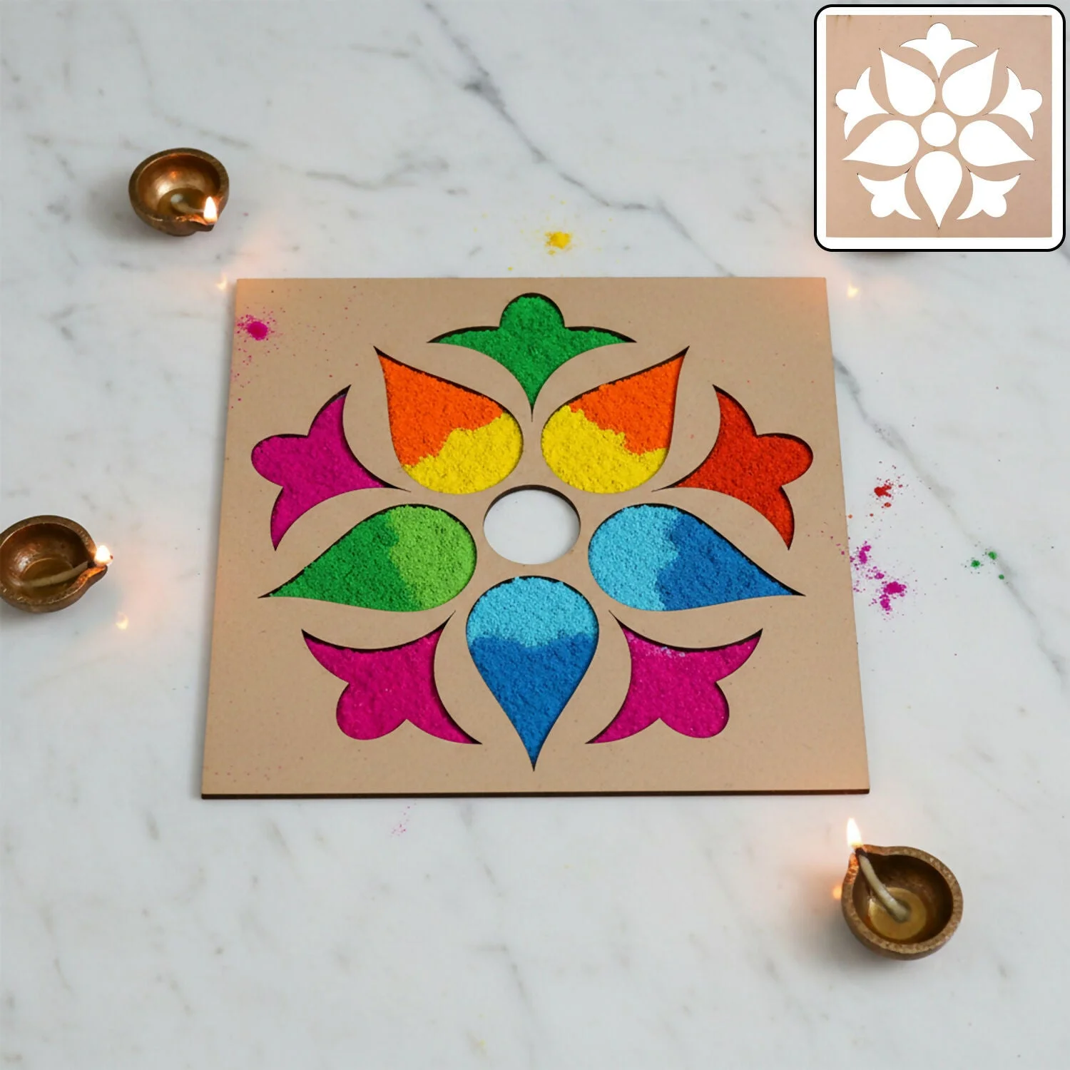 Quick Rangoli Setup: Place, fill colours, remove, no hand drawing