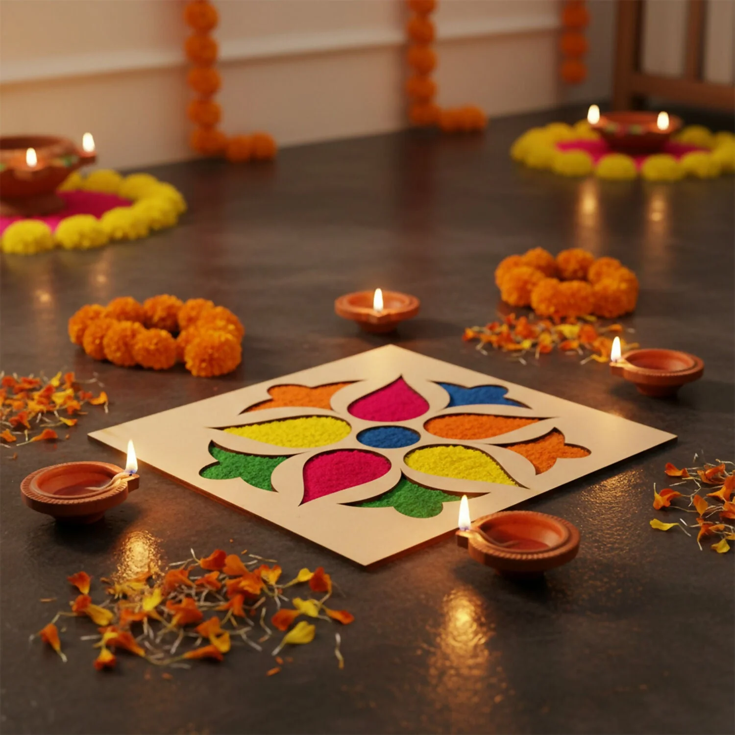 A full, colourful rangoli without spending too much time. Just place it, fill colours, lift it up, and the design comes out neat and balanced. Very useful for all festivals and pooja days.