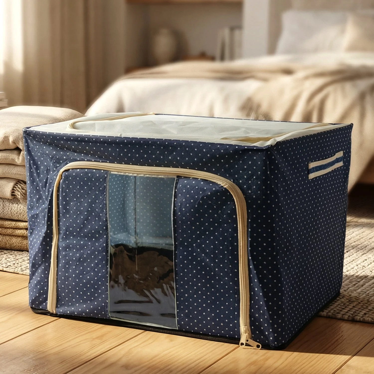 foldable cloth storage box, collapsible storage organizer, clothes storage box, bedding storage container, towel storage box, household items organizer, storage box with transparent window, zippered storage box, easy access storage container, space-saving storage box, collapsible fabric storage bin, foldable organizer for home, multipurpose storage box, clothing organizer box, storage box for bedroom, storage box for living room, portable fabric storage container, home organization storage bin, storage box with zipper closure