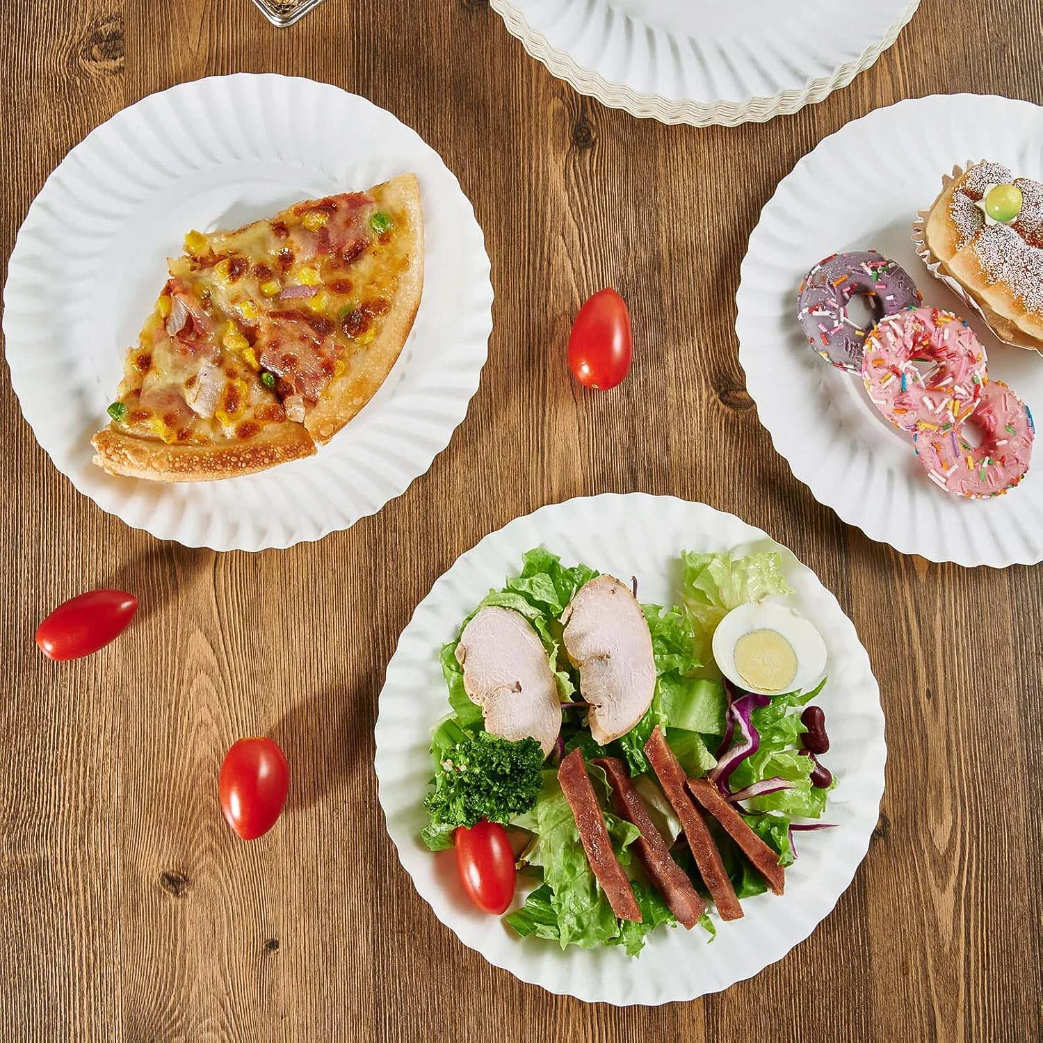 Serve meals responsibly with these premium round compostable paper plates. Made from thick, food-grade paper pulp, they deliver reliable rigidity and a clean white finish that looks great at buffets, cafés, offices and home parties. The plates handle hot, cold and lightly oily foods without collapsing, keeping counters tidy and service quick. After use, simply dispose of them in the compostable/organic waste stream where facilities exist—an easy switch from plastic and foam plates without compromising on everyday performance.