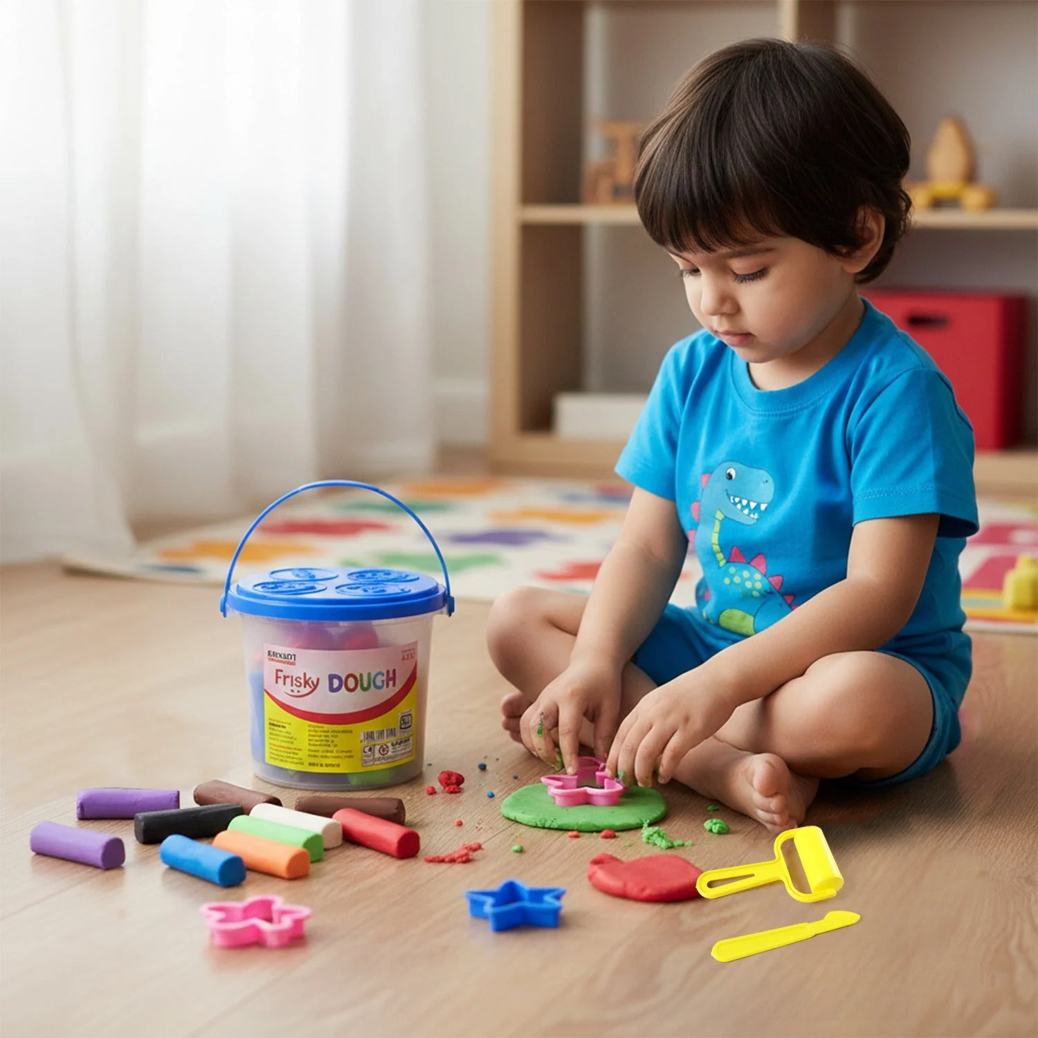 Spark endless creativity with this vibrant modelling clay set featuring rich, eye-catching colours, fun shape cutters, a roller, and a cutting tool neatly packed in a convenient storage bucket. The soft and easy-to-mould dough allows children to roll, press, cut, and shape their own imaginative creations with ease. From flowers and stars to houses and fruits, kids can explore endless design possibilities while learning about shapes and colours.