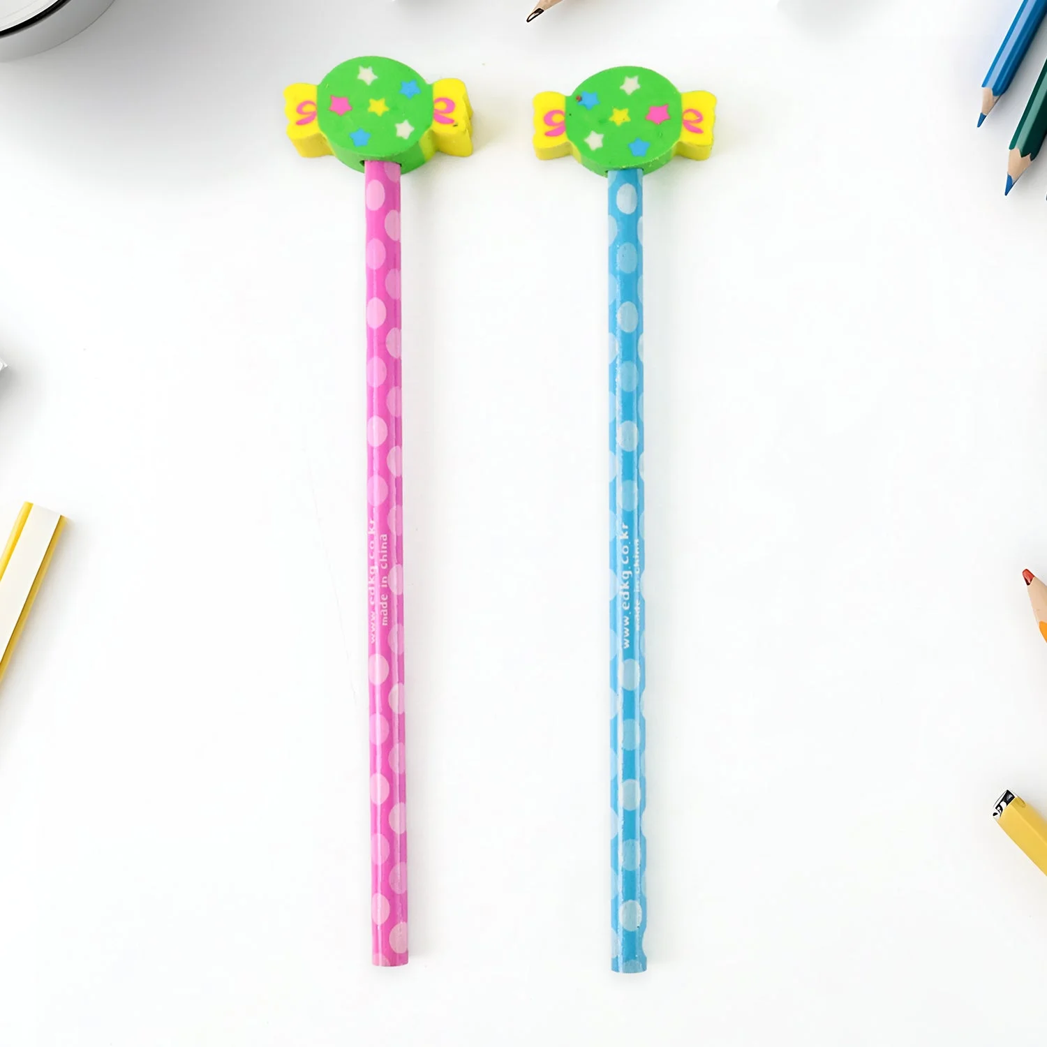 pencil and eraser combo , writing tool set , fun eraser kit , kids drawing accessory , school supply kit , gift for kids , back to school gift , heart eraser pencil set , candy top pencil kit, cartoon pencil gift set , capsule eraser bottle , cute themed school supplies