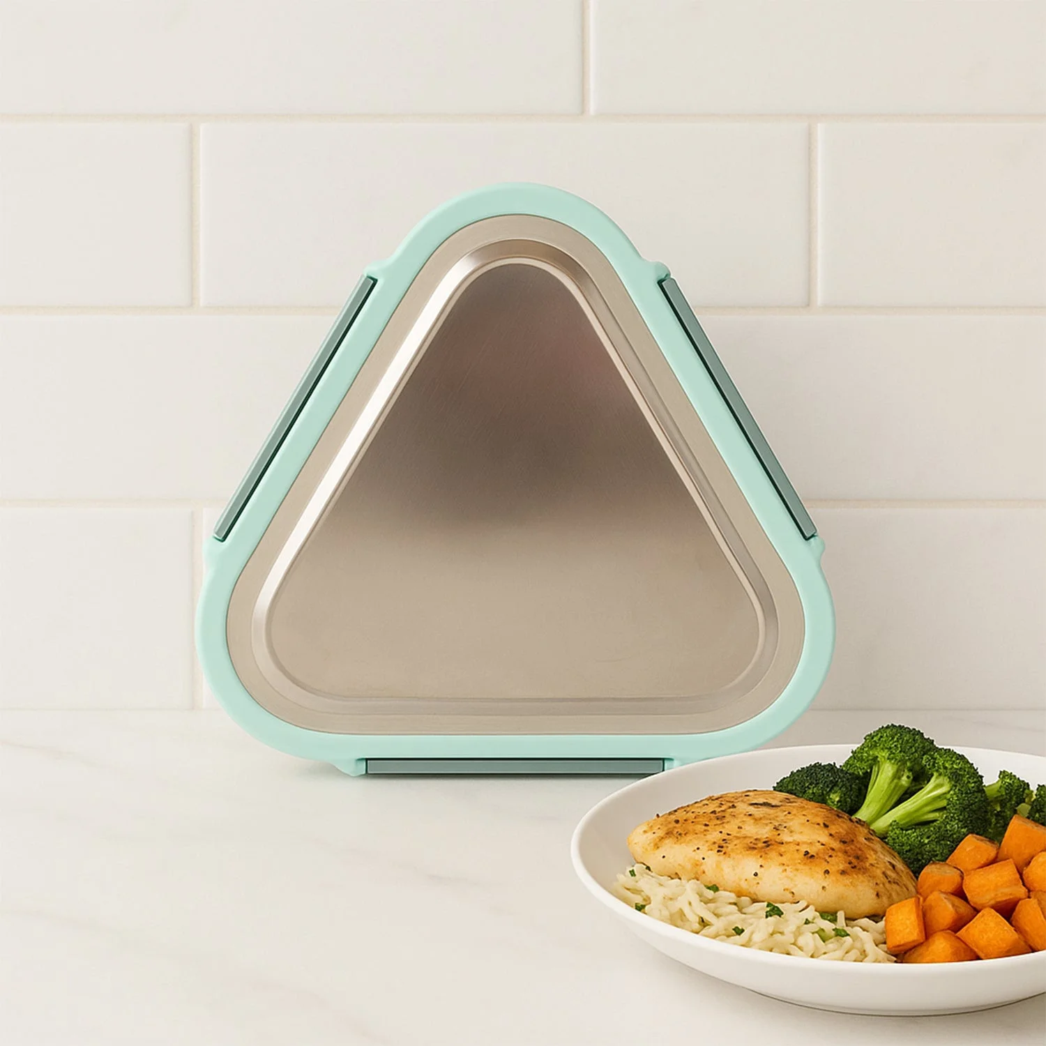 The set includes two stackable stainless steel containers, both housed within a high-quality BPA-free plastic outer shell. The larger container is ideal for main meals such as rice, rotis, or pasta, while the smaller inner container is perfect for curry, vegetables, salad, or chutney. The triangular design helps the containers fit snugly into bags while also maximizing internal capacity.