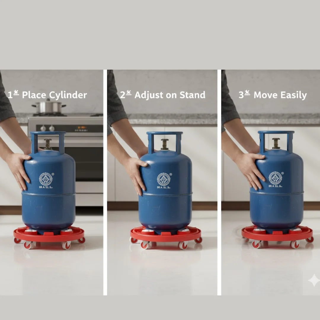 No need to lift cylinder. LPG gas cylinder trolley - is a concept to make your LPG cylinder easily movable. It is made up of plastic making it durable and long lasting. LPG gas cylinder trolley comes with good quality wheels to make cylinder easily movable. A beautiful way to free up some extra space in your kitchen. No more scratches and rust marks on your floor heavy duty plastic good quality.