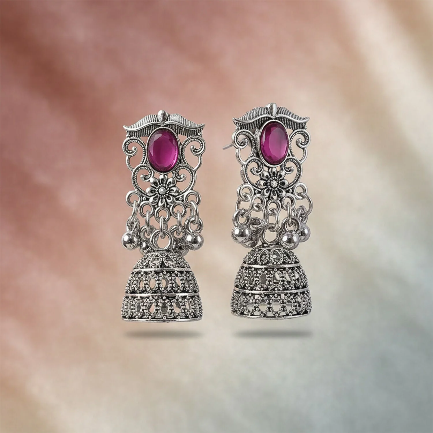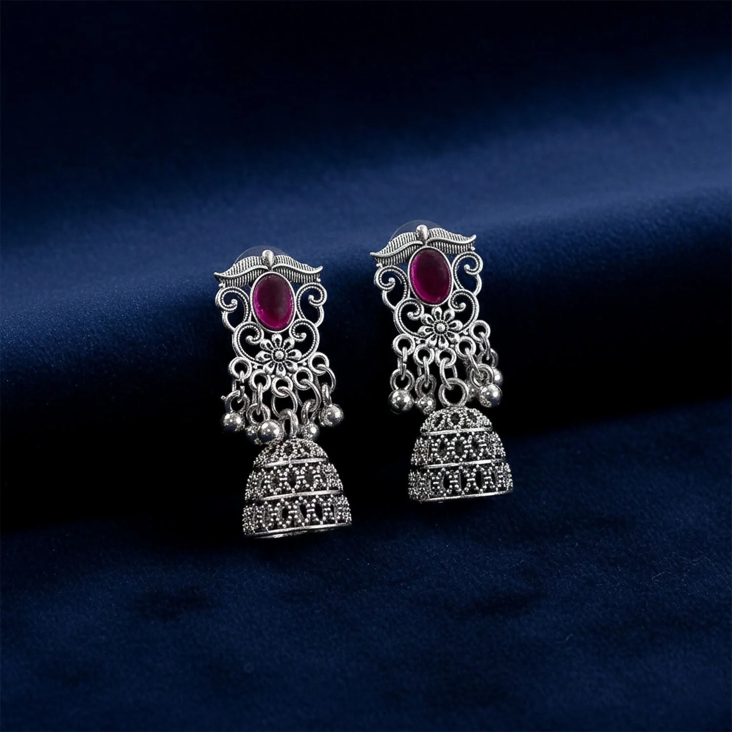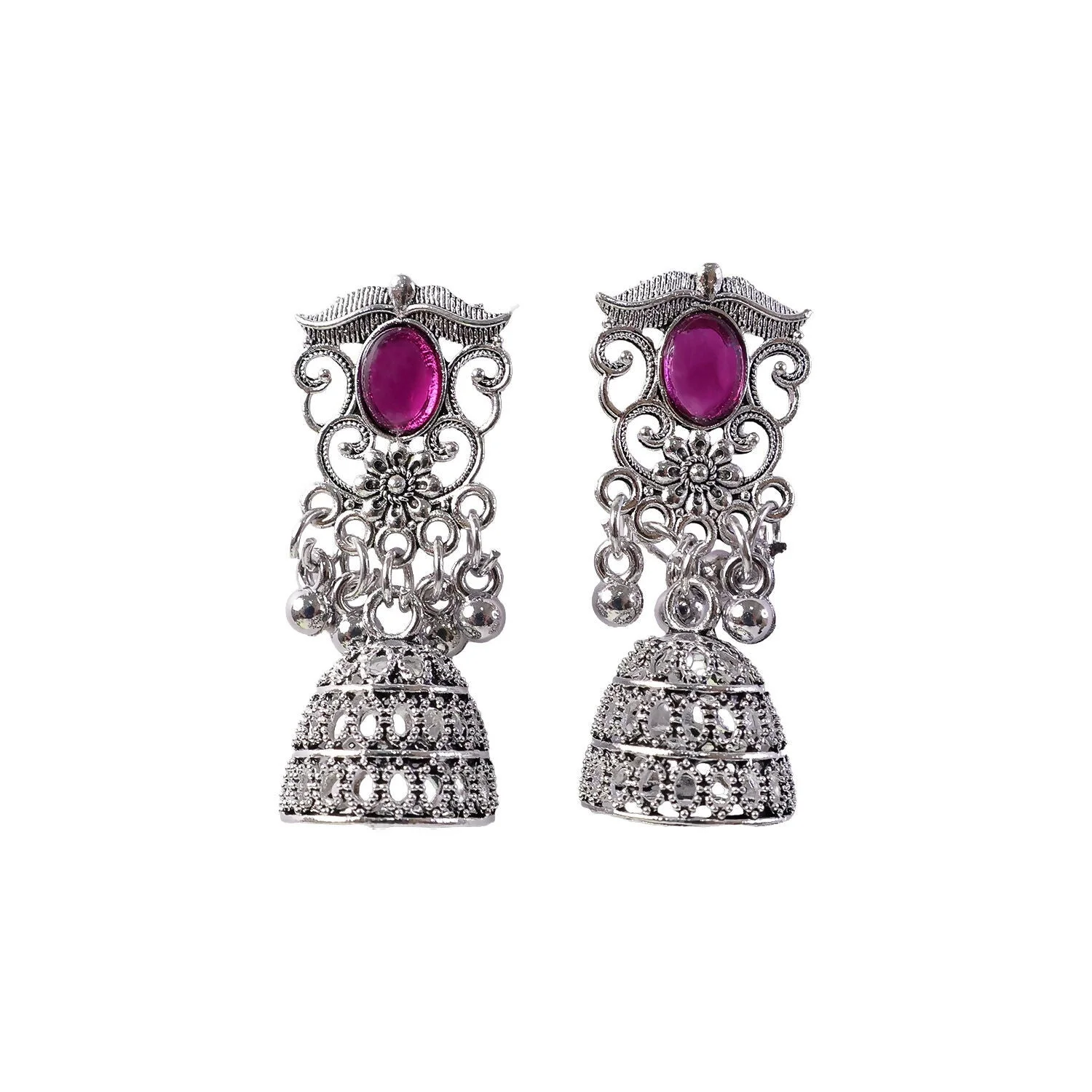 German Silver Jhumka Earrings with Red Monalisa Stones | Lentlo Shop