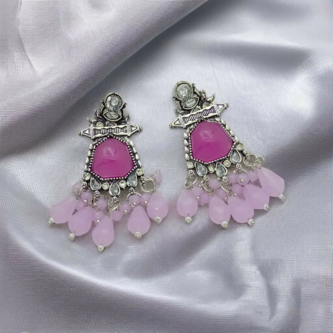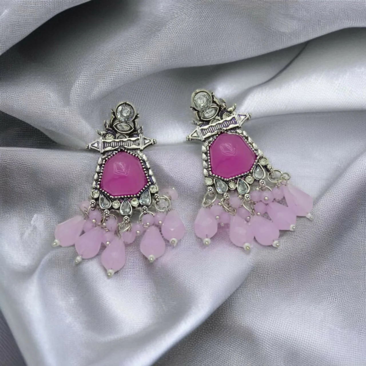 Be the first to review German Silver Oxidized Earrings with Fuchsia Stones & Pastel Drops!