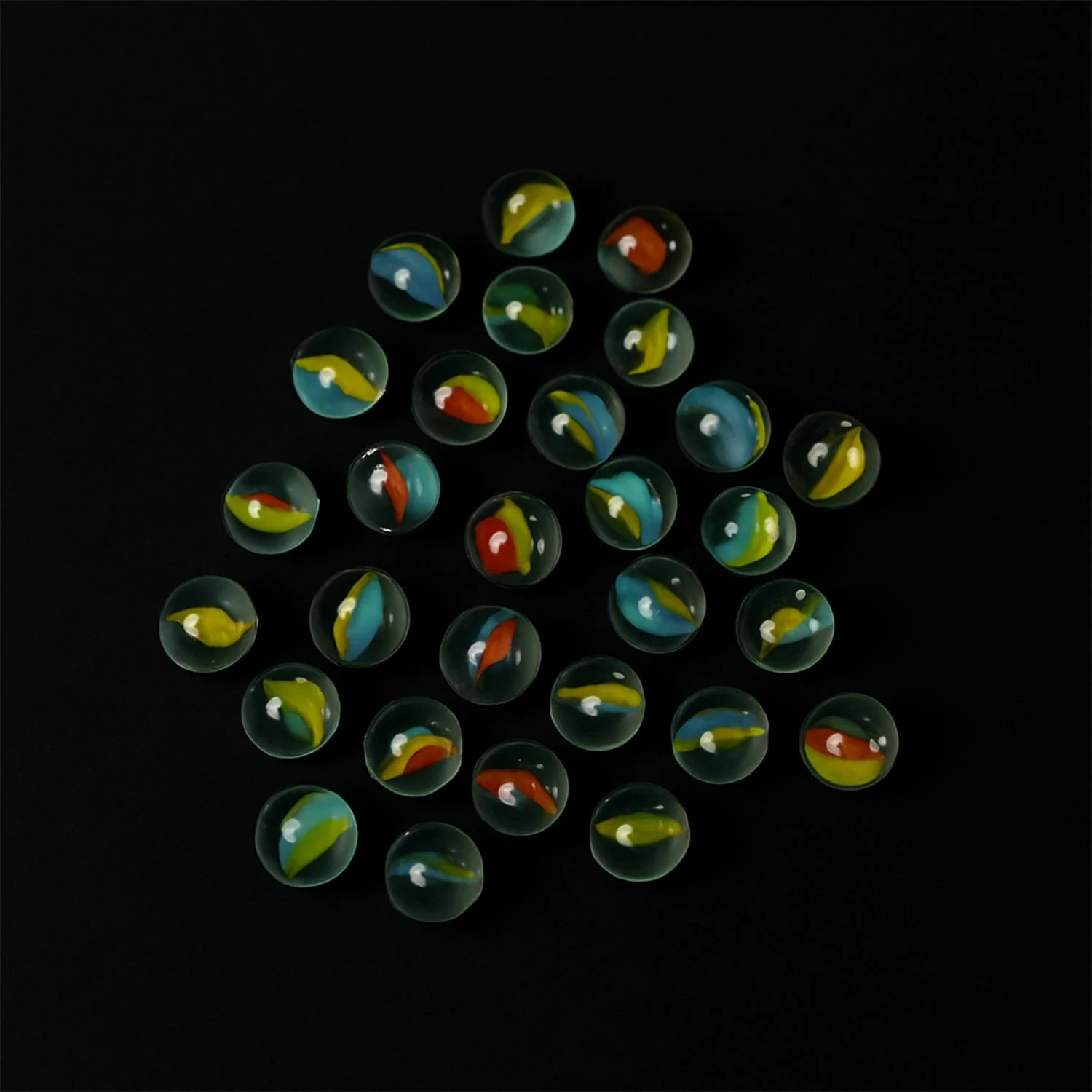Each marble features vivid red, yellow, or green swirls sealed inside clear glass — eye-catching and fun to collect.