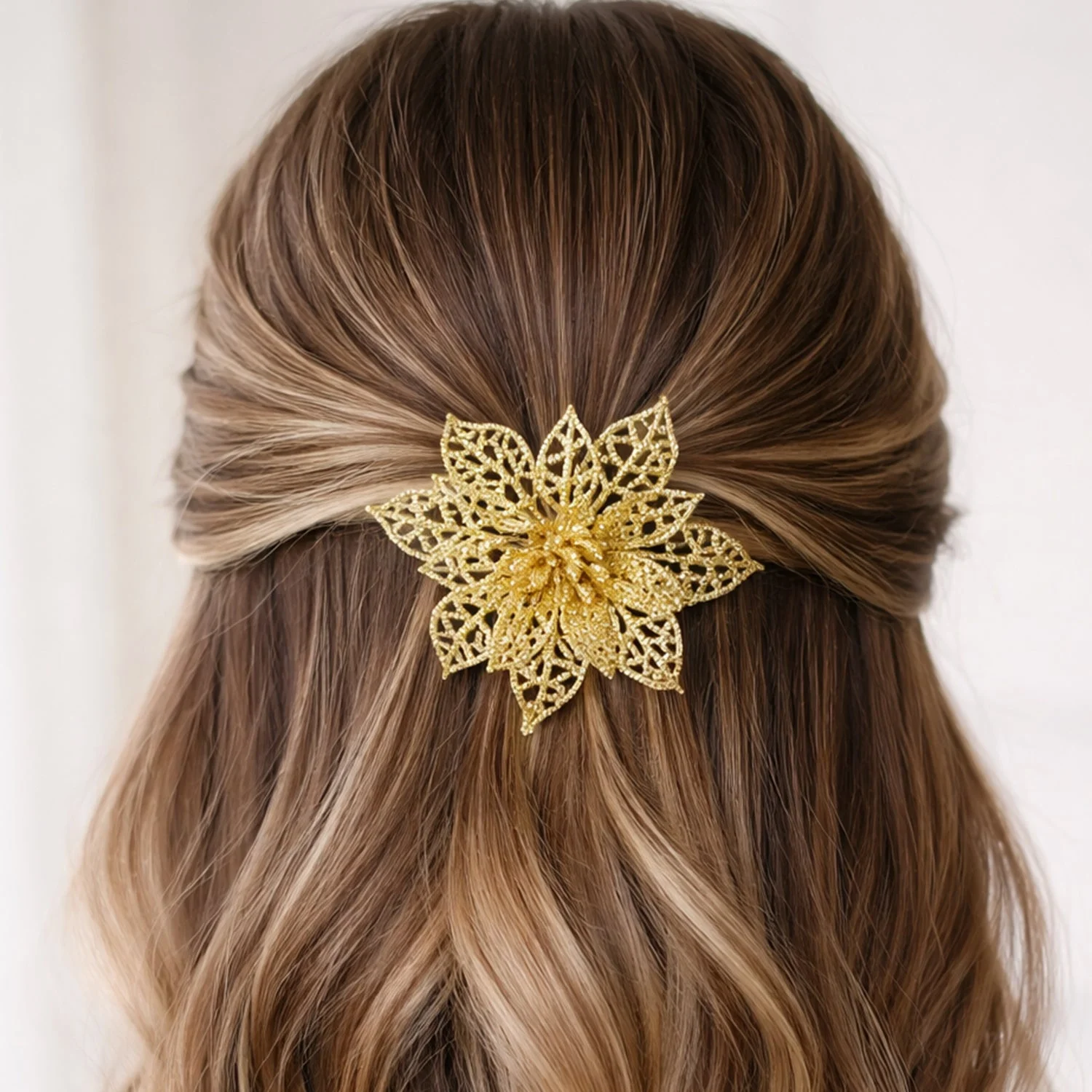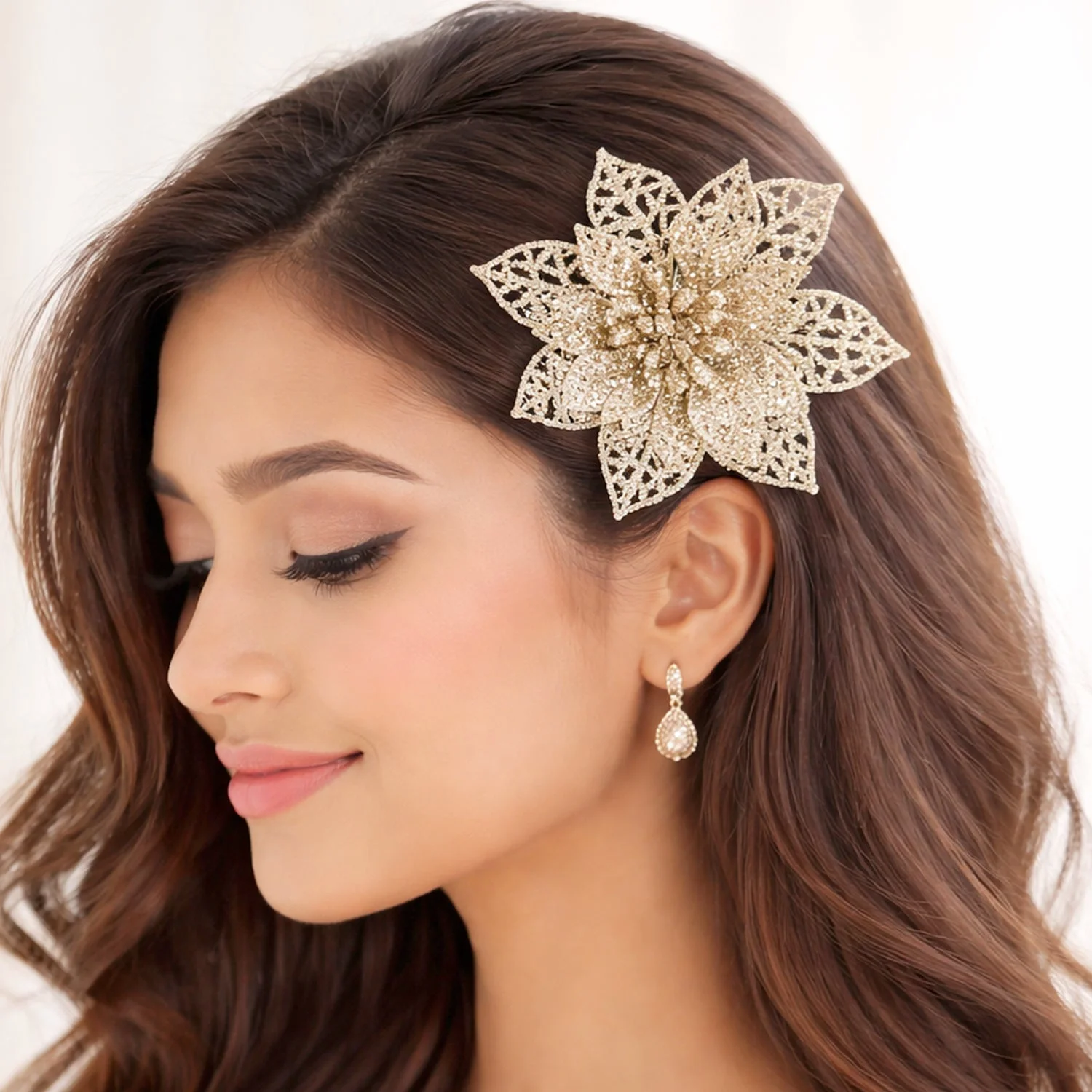 Add a stunning touch of elegance to your hairstyle with this beautiful 6-piece glitter flower hair clip set. Designed with a premium floral shape and sparkling finish, these decorative clips instantly enhance any look, whether you are dressing up for a wedding, party, festive event, or casual outing. The lightweight design makes them comfortable for long wear, while the secure clip grip helps keep your hairstyle neatly in place. These stylish flower clips are perfect for creating a graceful side clip look, bun decoration, half-tie styling, or festive hair setup. A perfect accessory set for women and girls who love trendy and eye-catching hair fashion.