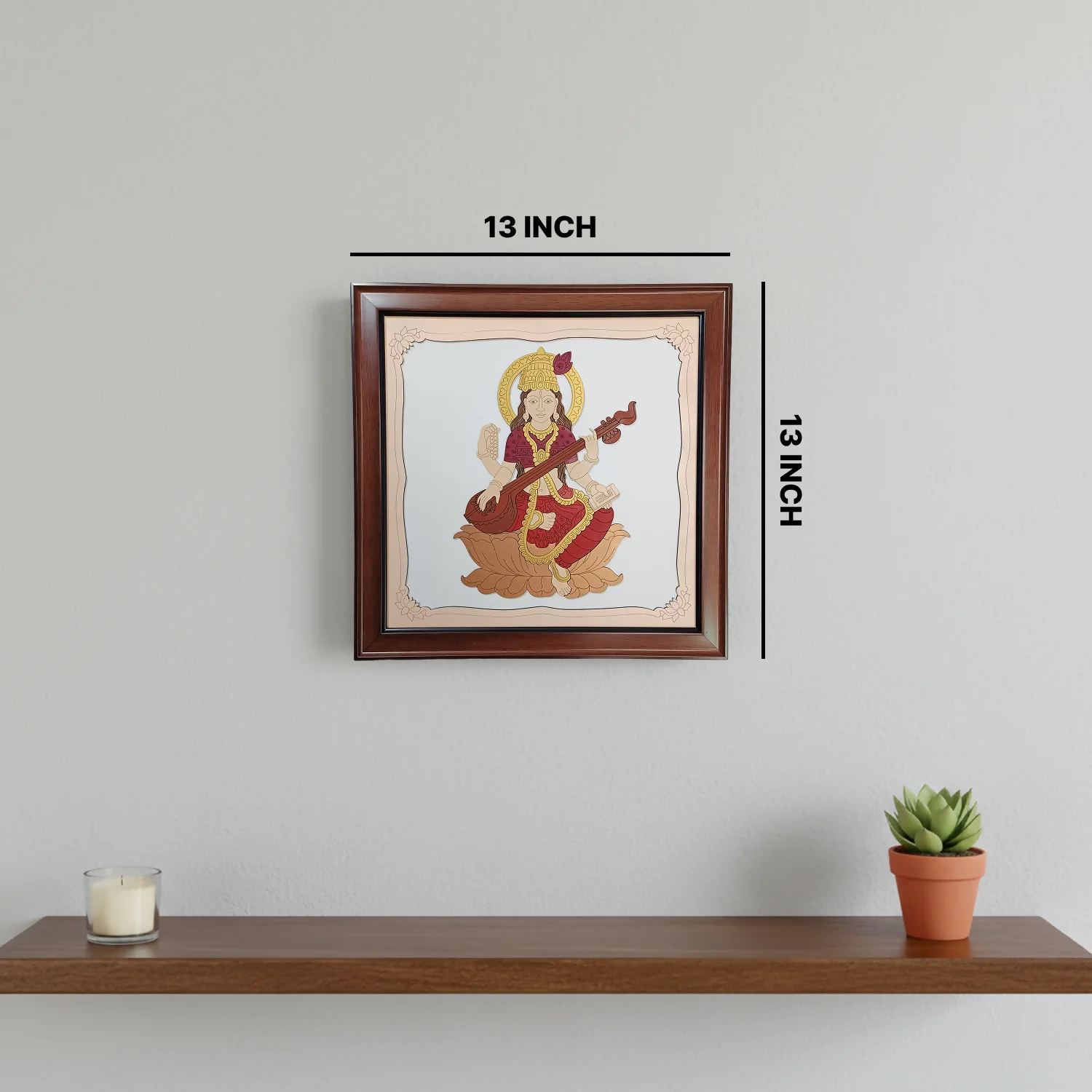 The artwork is elegantly enclosed in a premium wooden frame, offering durability and a refined finish. Perfect for home temples, living rooms, study areas, offices, classrooms, and meditation spaces, this Saraswati Mata frame creates a calm and inspiring atmosphere.