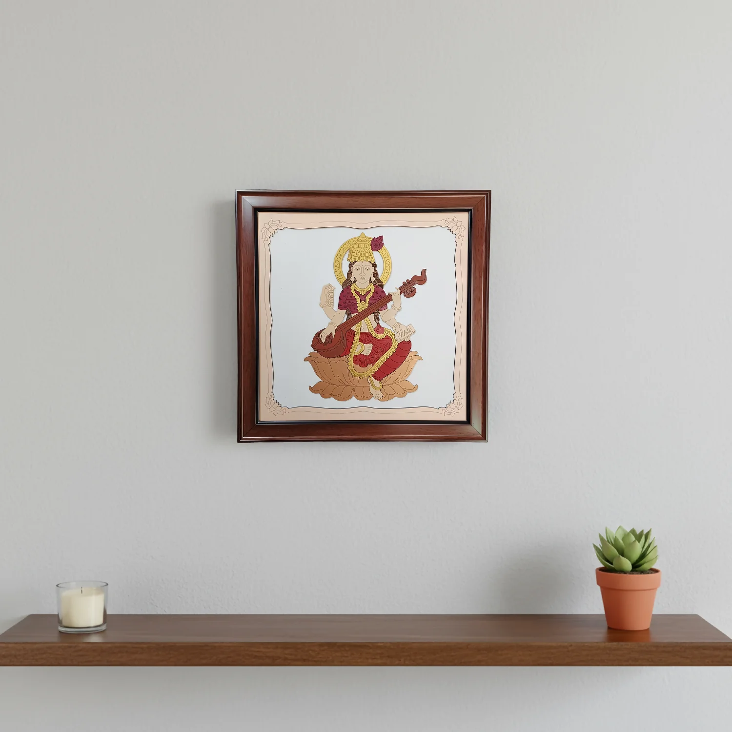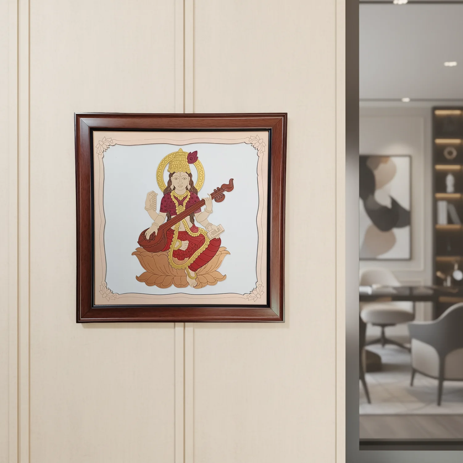 Bring peace, wisdom, and positive energy into your space with this beautifully crafted Goddess Saraswati wall frame, a symbol of knowledge, learning, music, and creativity. Designed with intricate detailing and warm traditional colors, this artwork reflects Indian heritage while blending effortlessly with modern interiors.