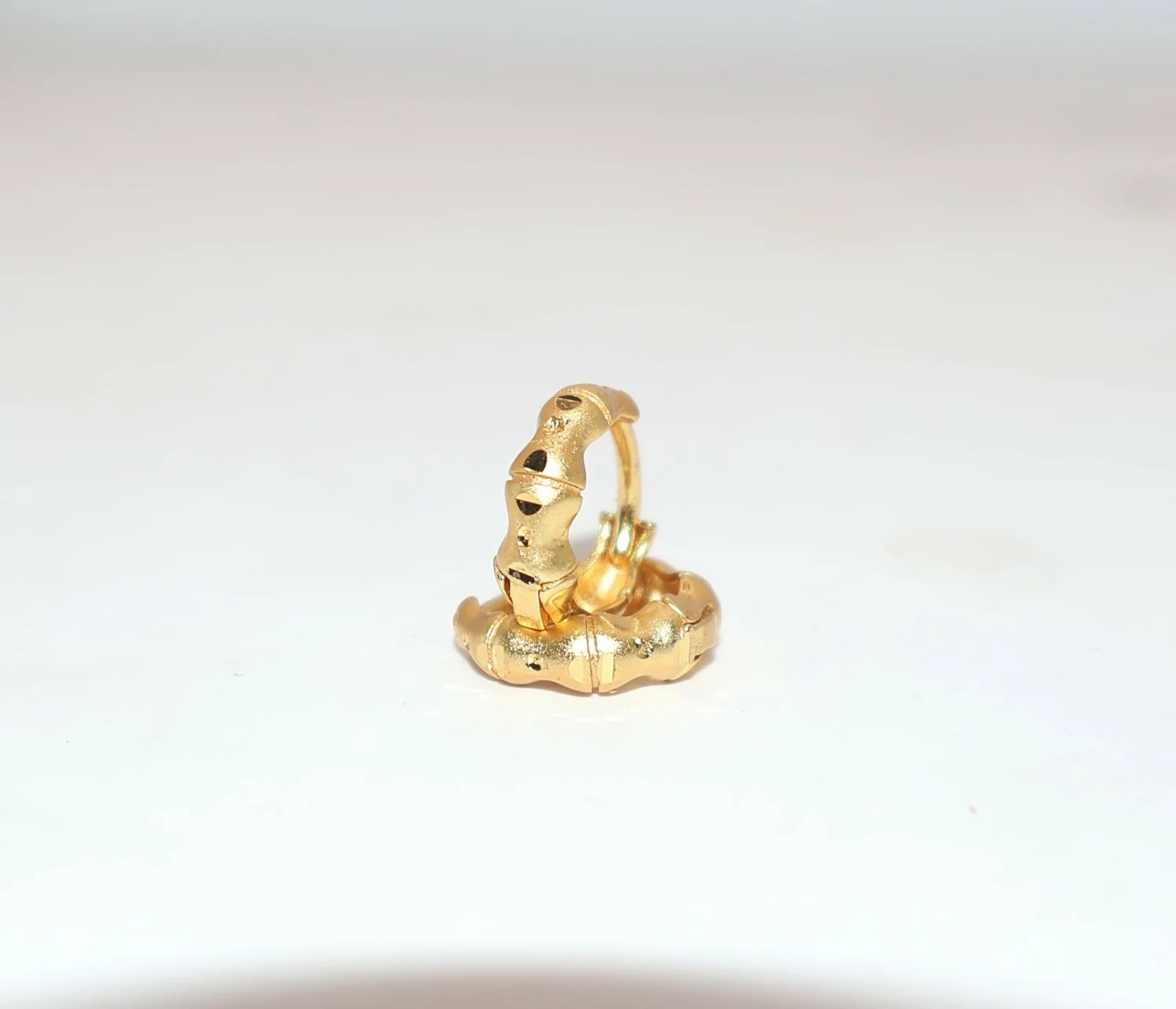 Capture nature's timeless elegance with these exquisite gold hoop earrings. Crafted with a unique bamboo texture finish, these hoops offer a sophisticated blend of traditional material and organic modern design. Perfect for daily wear or an elegant evening out, their distinct texture catches the light beautifully, adding a subtle yet rich detail to any outfit.