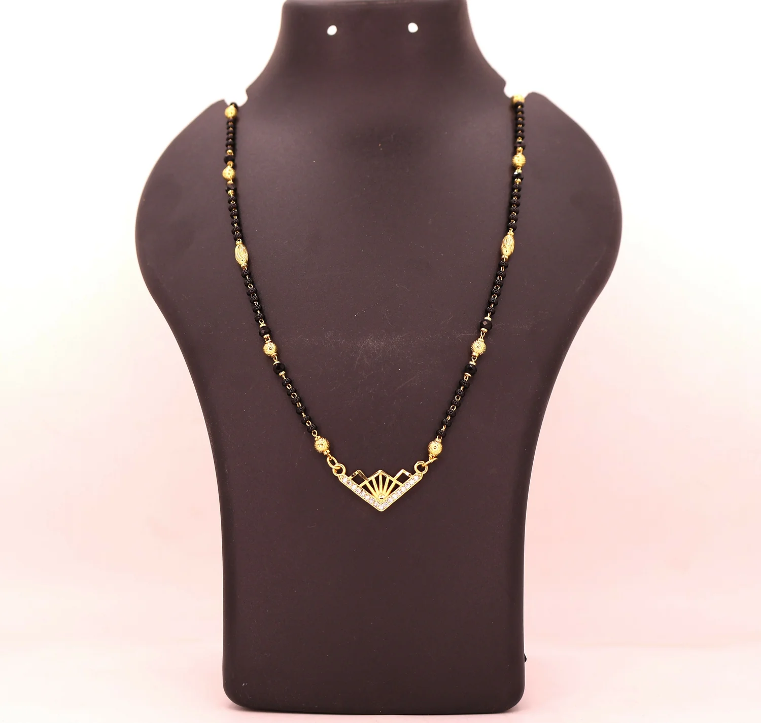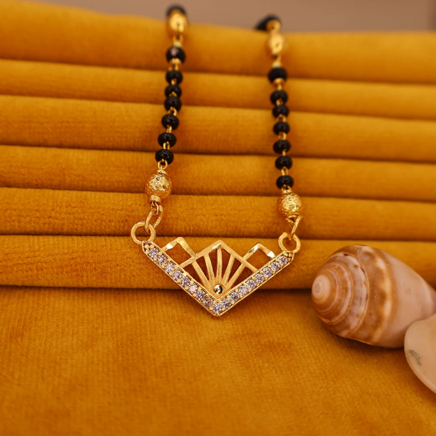 Contemporary Design: A refreshing take on the classic Mangalsutra, featuring a tiered V-shaped pendant with sunburst detailing.