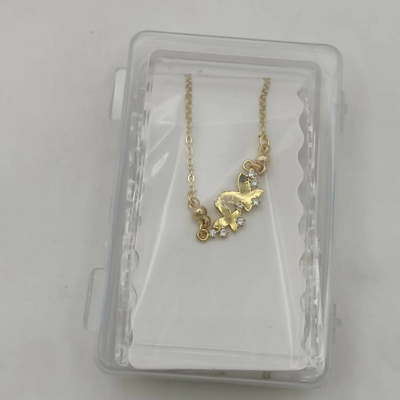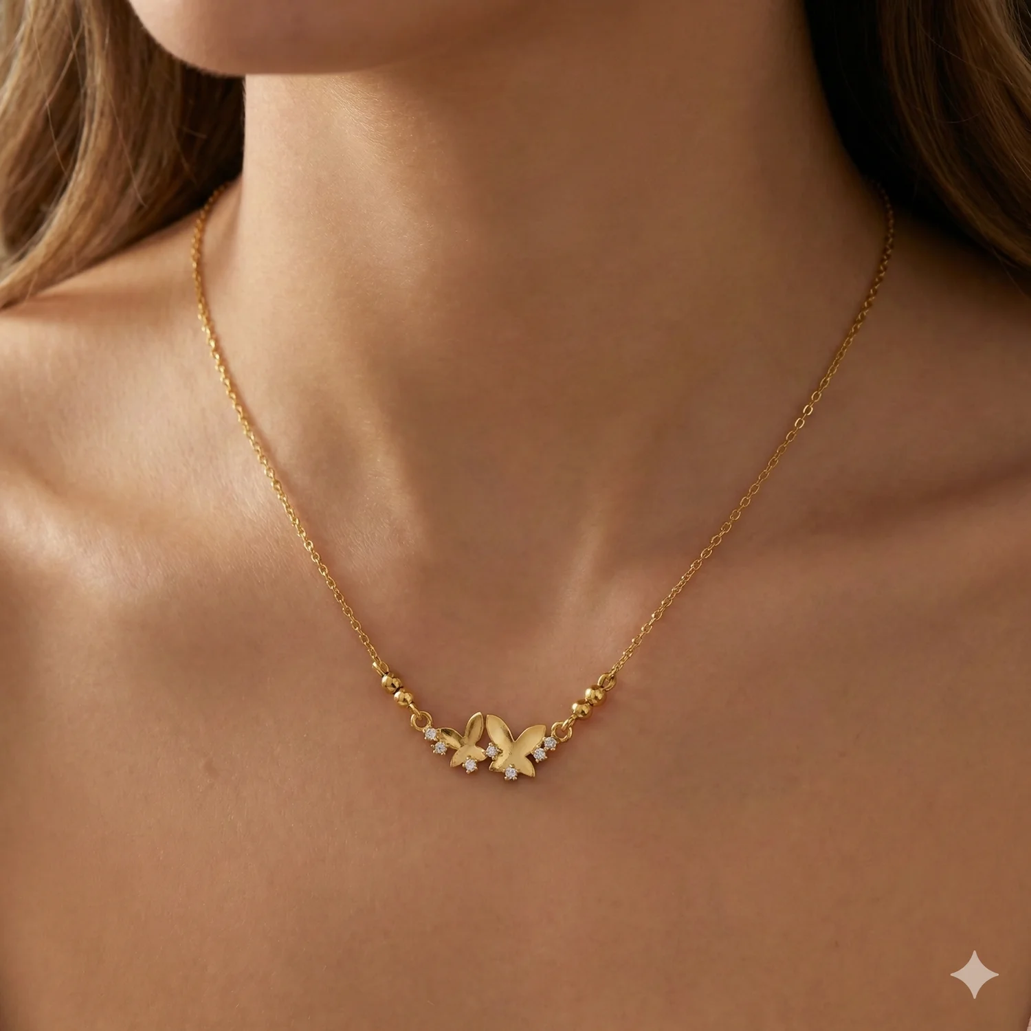 This exquisite Gold Double Butterfly Necklace captures the delicate beauty of nature in a timeless design. Featuring two graceful butterflies "taking flight" together, the pendant is intricately detailed with shimmering crystal accents that catch the light with every movement.
