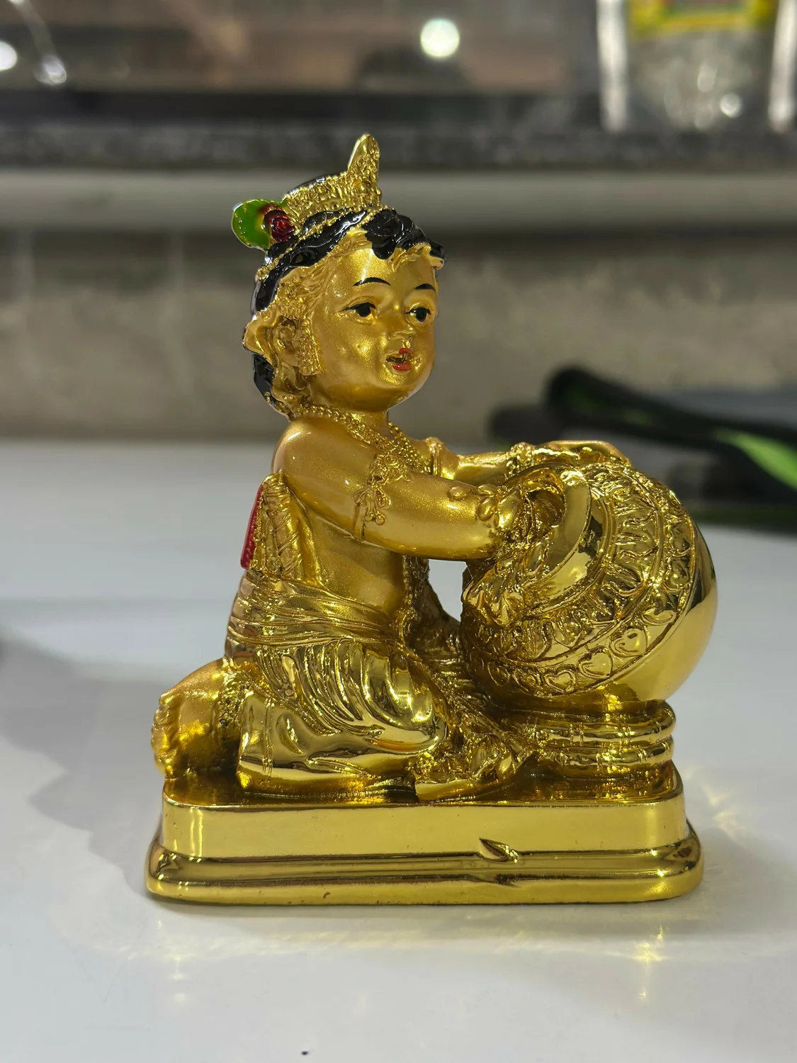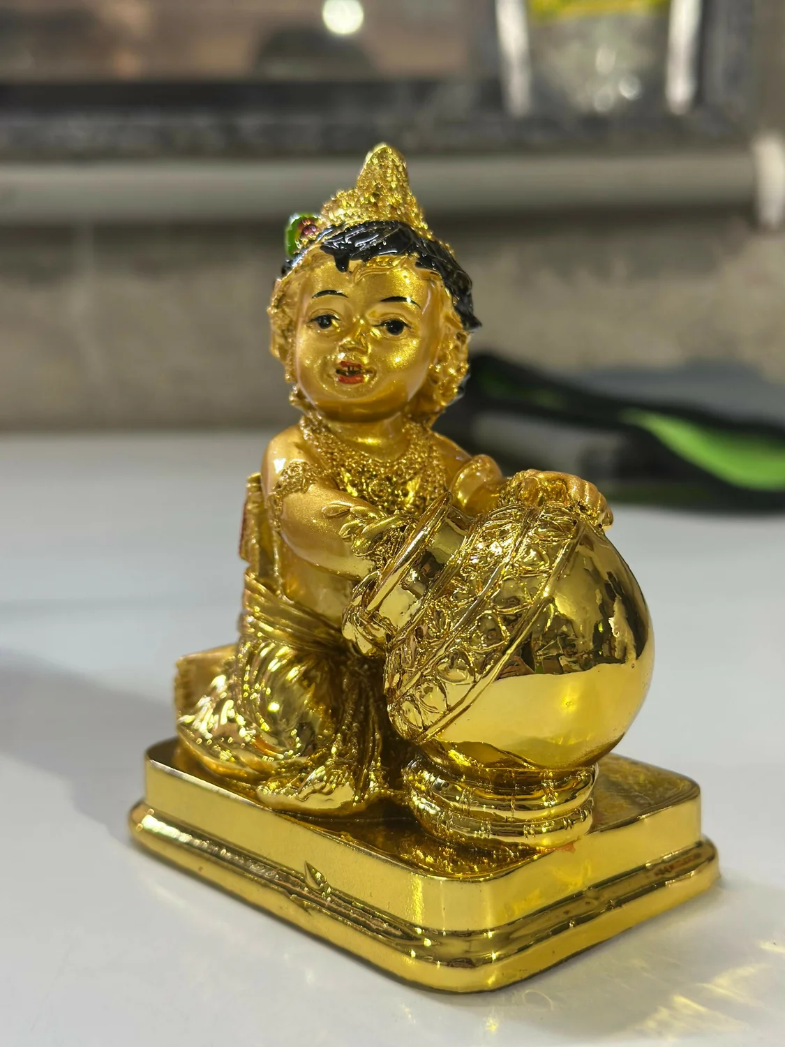 Enhance your home décor with this beautifully crafted Baby Krishna idol in a rich gold finish. Designed in a charming crawling pose holding a butter pot, this decorative piece adds spiritual elegance and traditional appeal to any space. Perfect for pooja rooms, living rooms, offices, or gifting on special occasions, this idol reflects fine detailing and premium craftsmanship. A wonderful choice for festive décor, housewarming, and devotional settings.