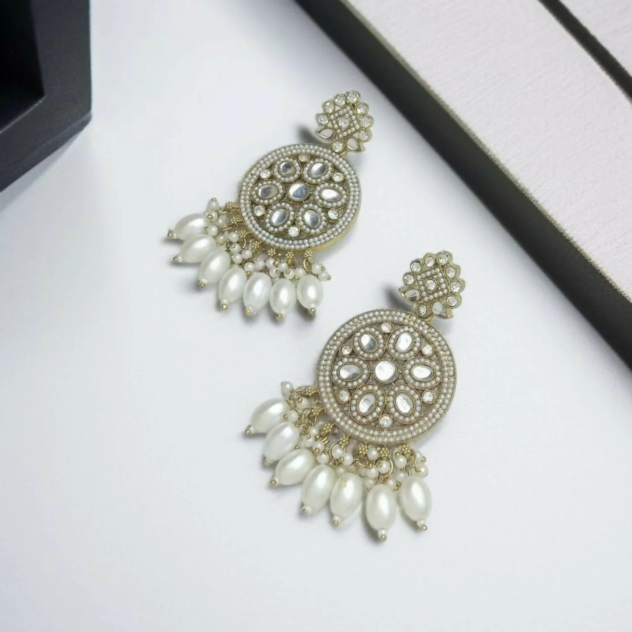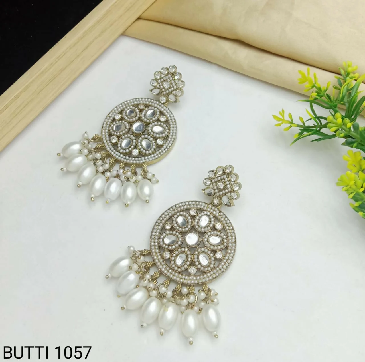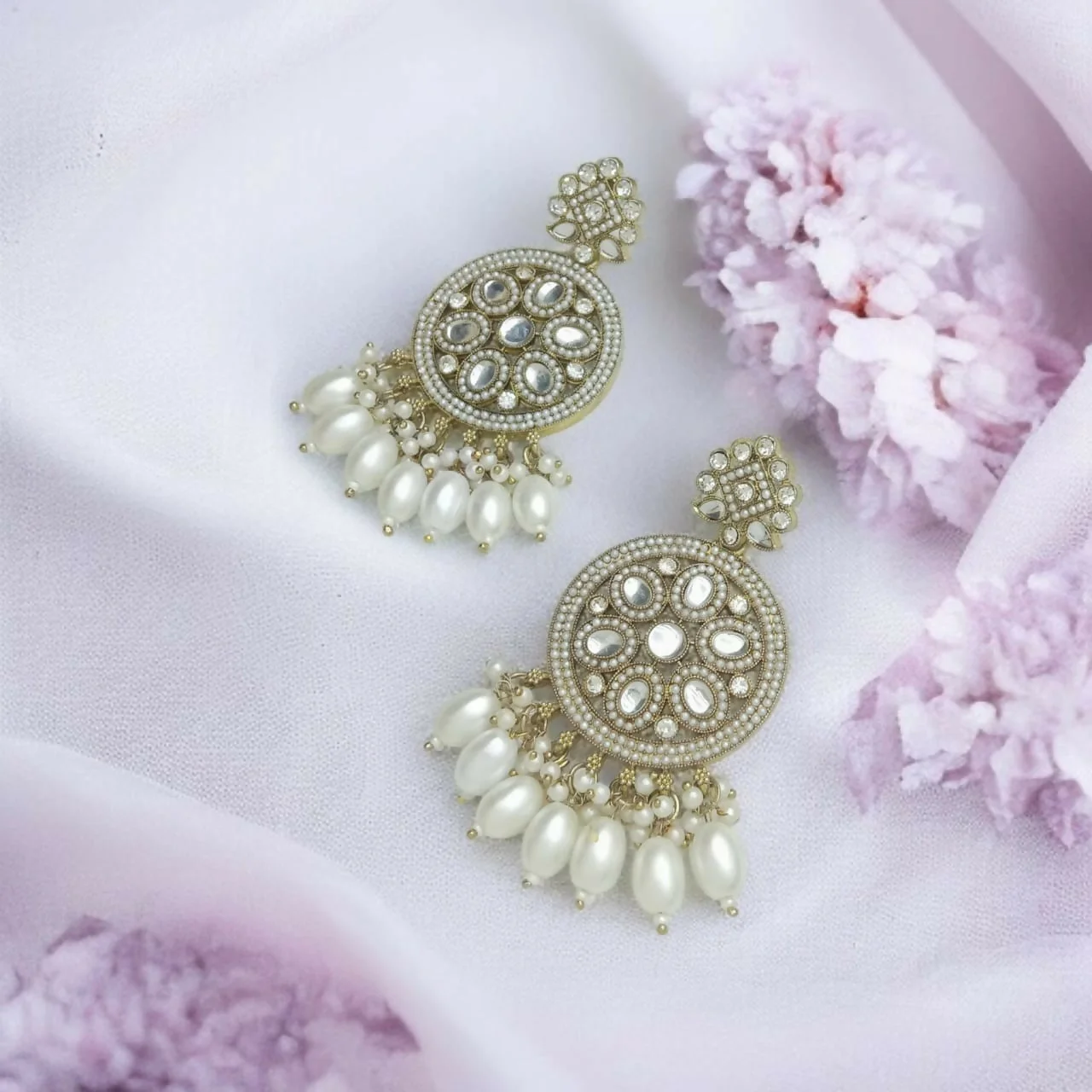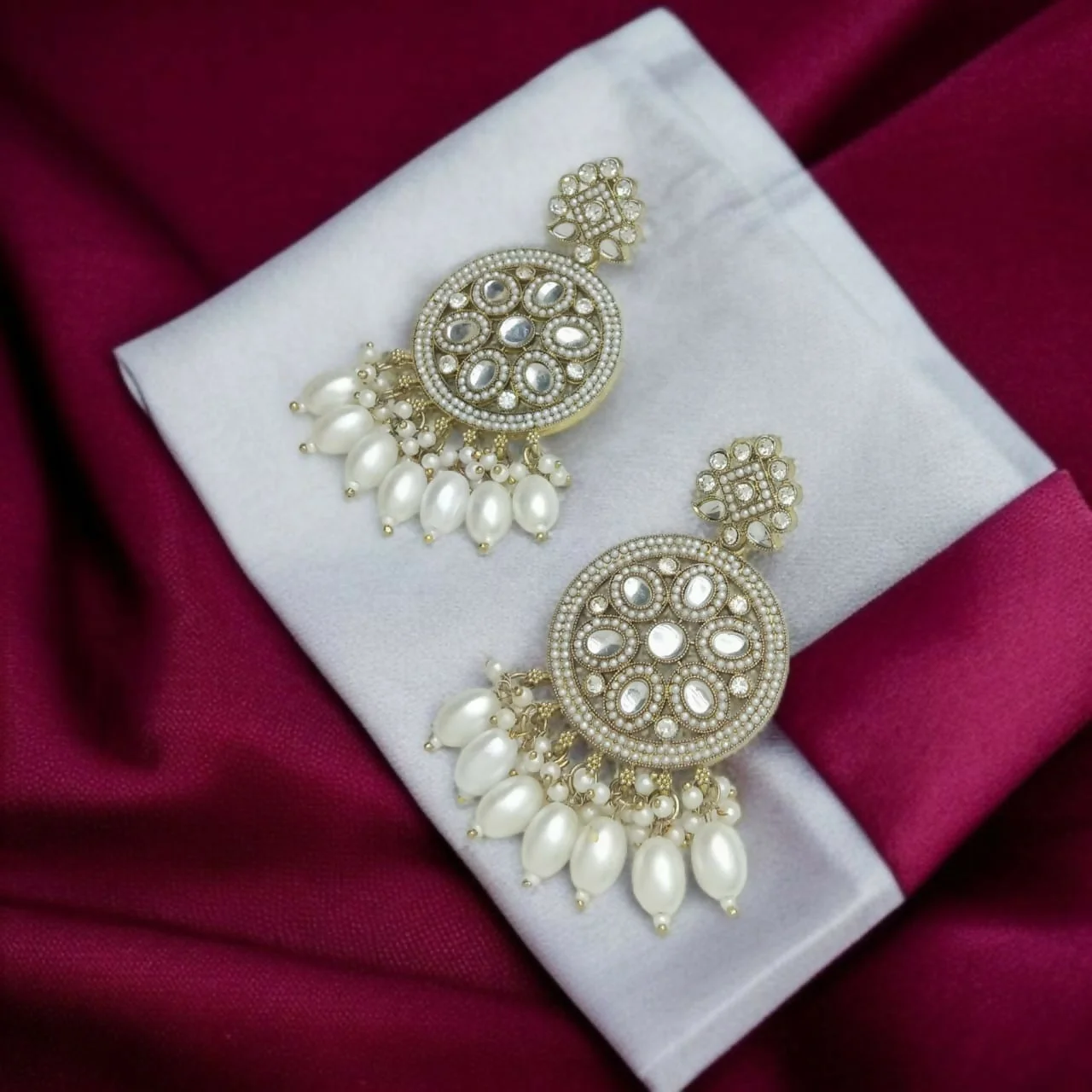 Be the first to review Gold-Finish Circular Buttis with White Kundan & Pearl Drops!