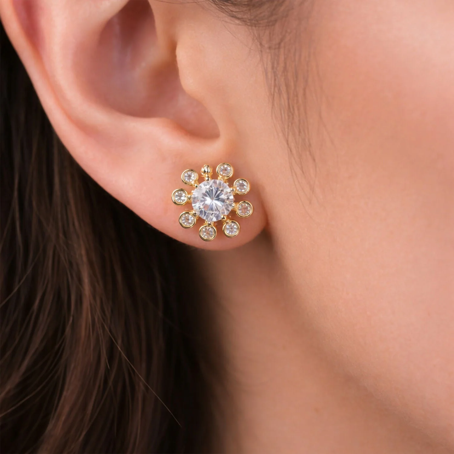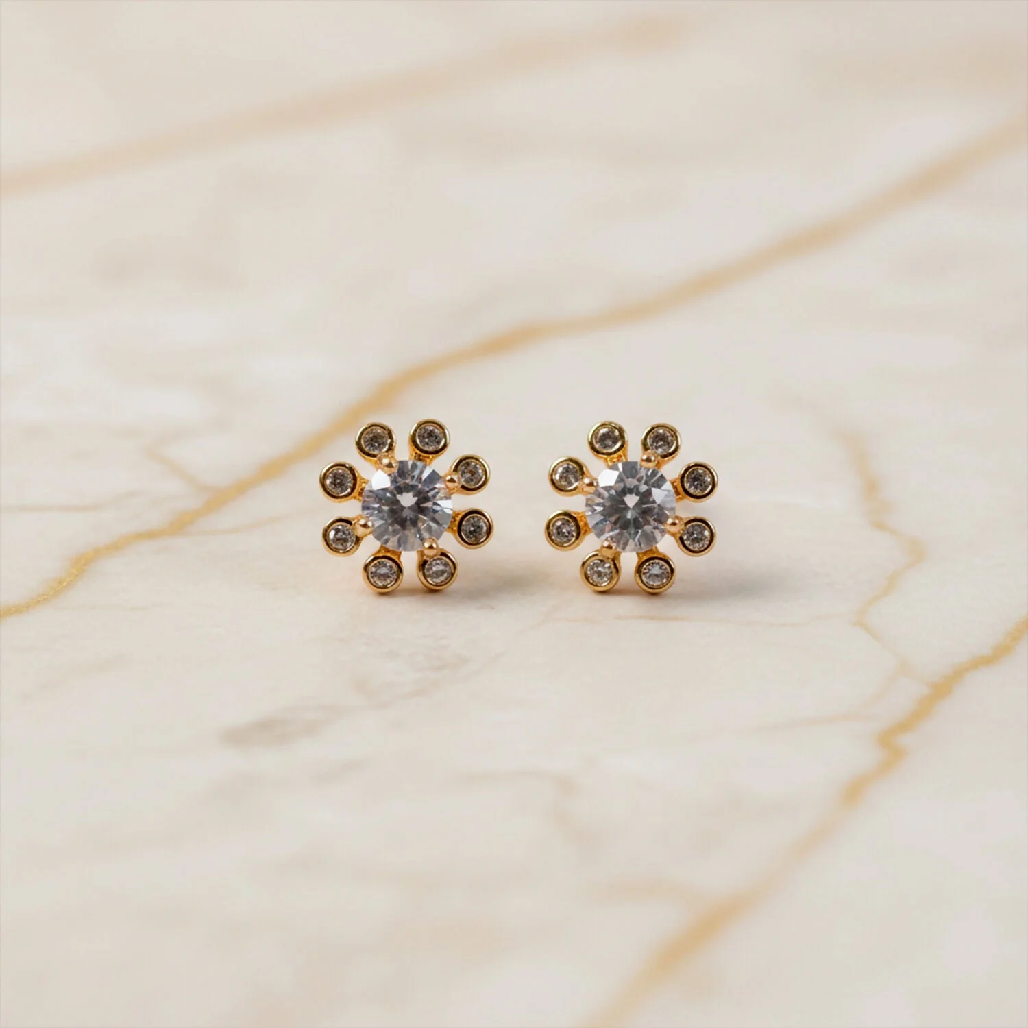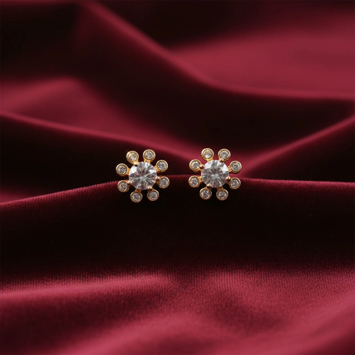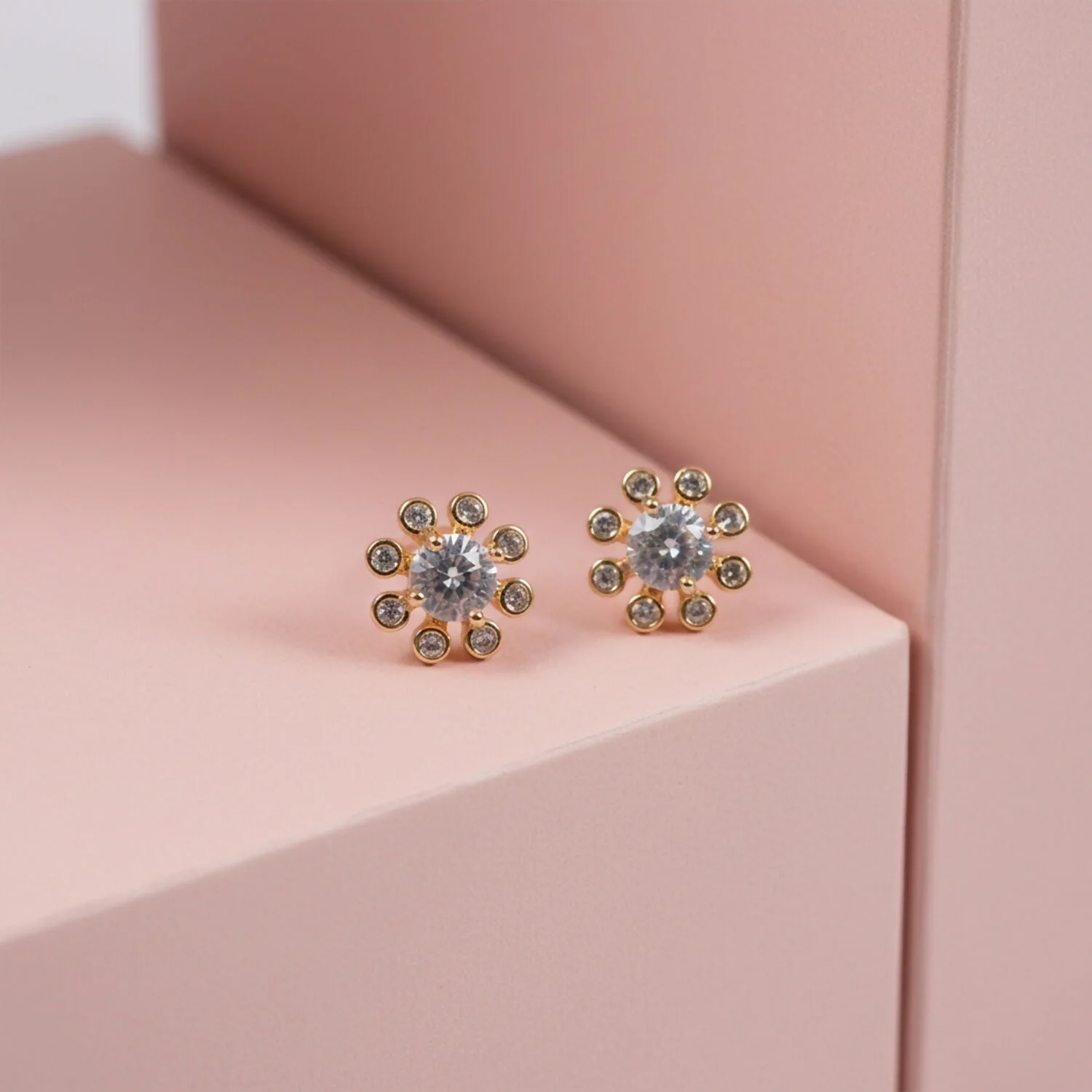 Ye beautiful flower design stud earrings simple aur elegant look dete hain. Center stone ke around chhote shining stones lage hue hain jo earrings ko neat aur classy finish dete hain. Daily wear ke saath-saath party, function aur festive outfits ke liye bhi perfect choice hai. Light feel ke saath comfortable fitting milti hai, isliye long time pehnana easy hota hai. Minimal design hone ki wajah se ye earrings har age group ke liye suitable hain aur gifting ke liye bhi achha option hai.
