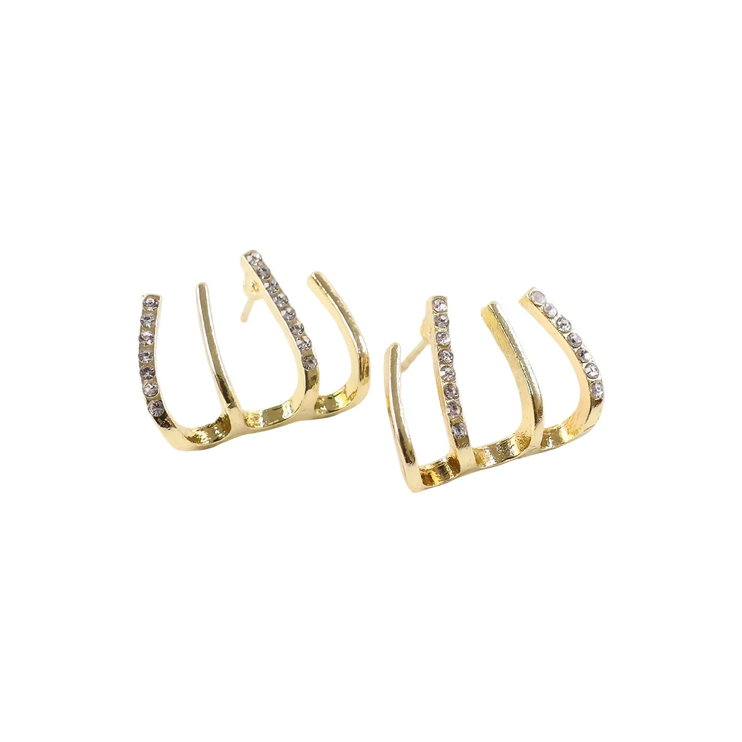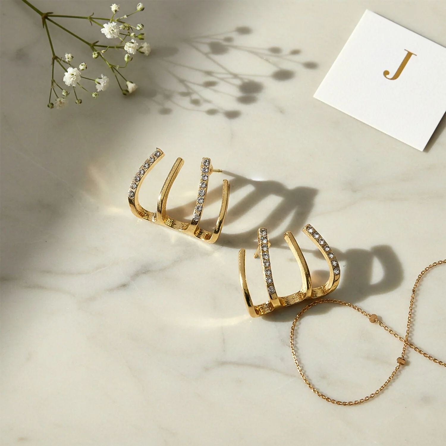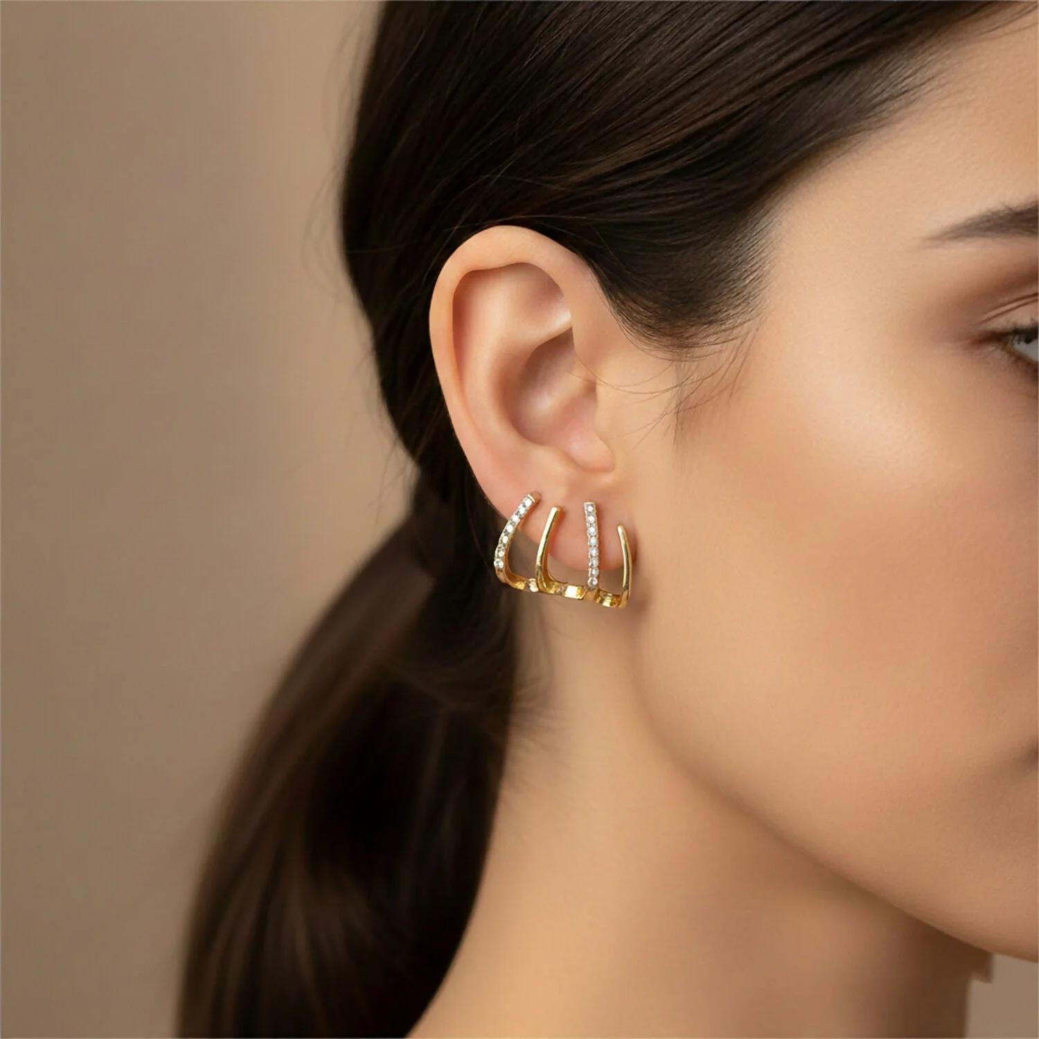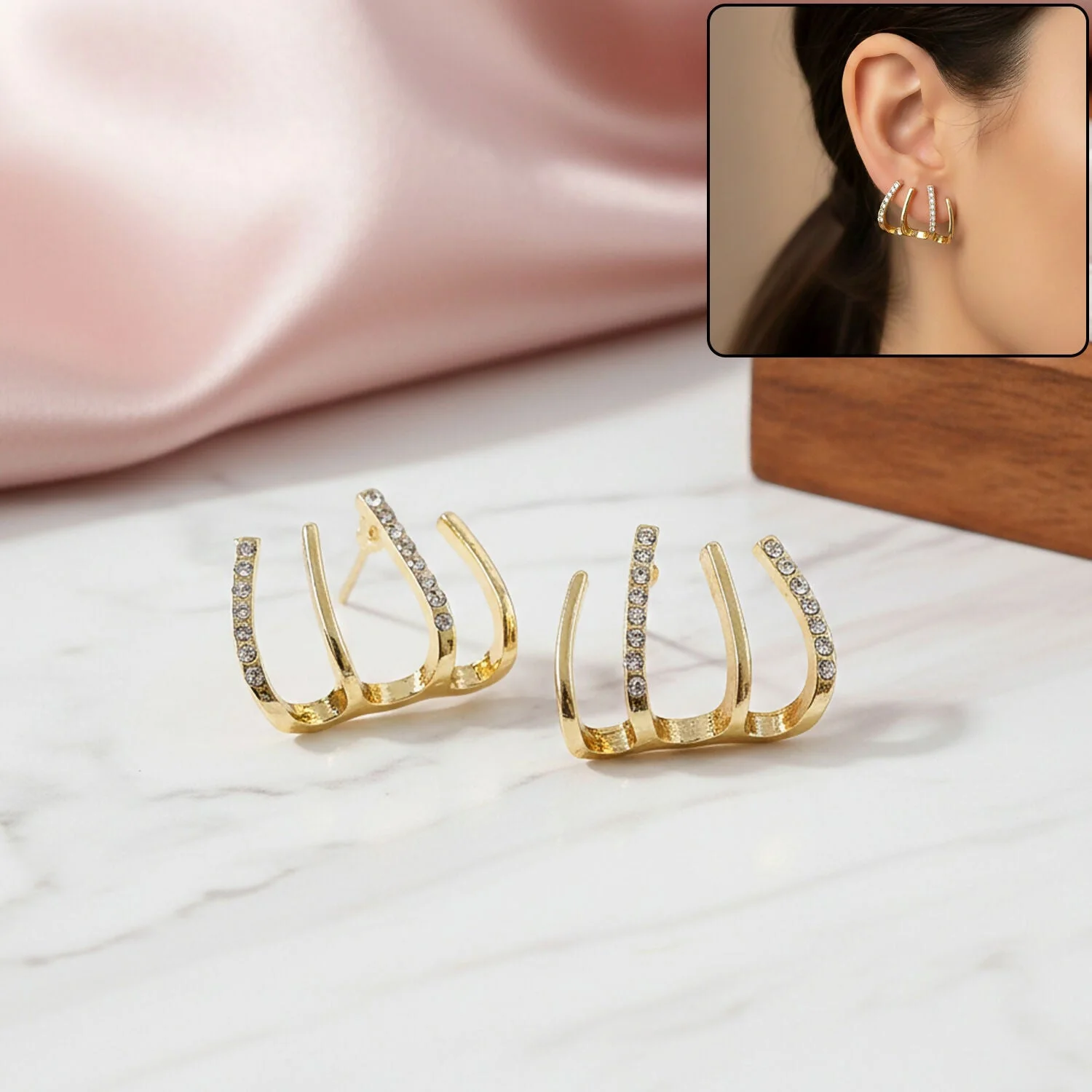 These stylish gold-tone designer earrings feature a modern multi-loop hoop design that gives a bold and premium look. Crafted with multiple curved bands, the earrings create a unique layered effect that stands out beautifully on the ear. Two of the loops are highlighted with sparkling stone detailing, adding an elegant shine without looking too heavy. The structured yet lightweight design makes them comfortable for long wear and perfect for both casual and party styling. Ideal for office wear, outings, festive occasions, and evening looks, these earrings easily complement western, fusion, and traditional outfits.