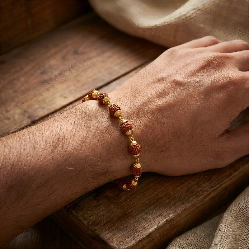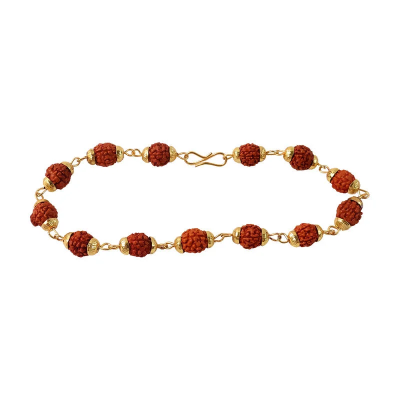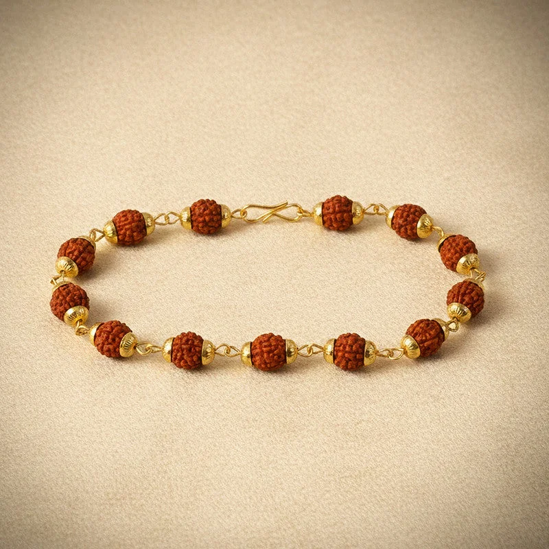 This gold finish Rudraksha bead bracelet is designed to reflect spirituality, strength, and positive energy. The bracelet features carefully selected Rudraksha beads connected with elegant gold-toned links, creating a traditional yet refined appearance. Suitable for daily wear, it is commonly worn during meditation, prayer, and religious rituals to support focus and inner balance. The comfortable and lightweight design allows easy all-day wear and pairs well with both traditional and casual outfits. Ideal for devotees and spiritual seekers, this Rudraksha bead bracelet also makes a meaningful gift for religious occasions, festivals, and personal spiritual use.